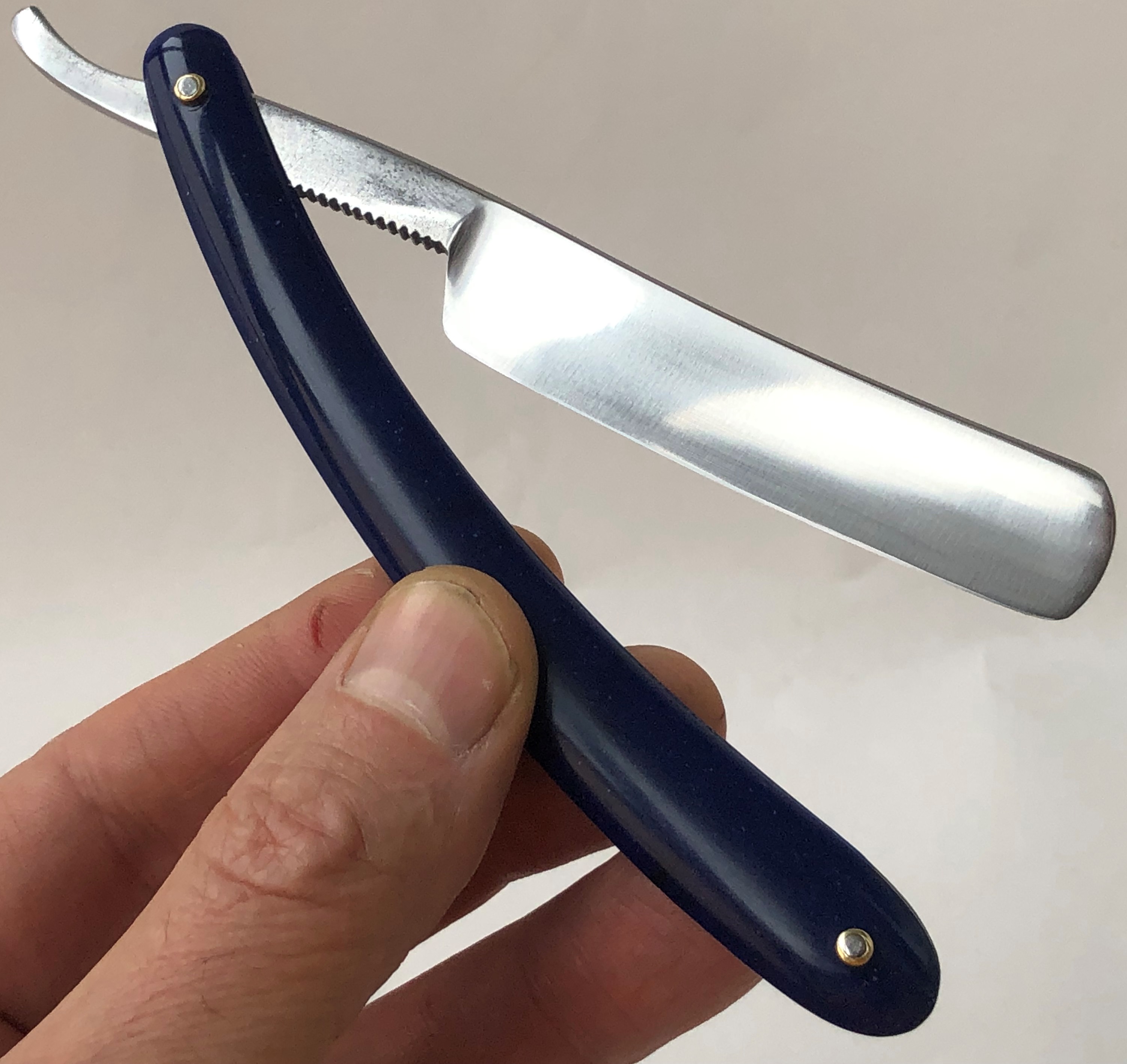 Клинок был восстановлен от следов износа. Немного скорректировал утОчку обушка, перешлифовал и умеренно отполировал.Скошенная пятка, по всей видимости бритва ранее использовалась барберами.Кромочка идеально ровная.Поменял пины на втулки и добавил внутренние шайбы. Одна плашка немного деформирована, но совершенно не критично, и лезвие закрывается по центру.В общем и целом очень приличная, с шикарной сталью старушка, получившая вторую жизнь. И абсолютно недорогая, по цене обычной ординарной непользованной советской бритвы. Особенно подойдет для новичка или любому товарищу, для кого важнее прежде всего качество самого инструмента.