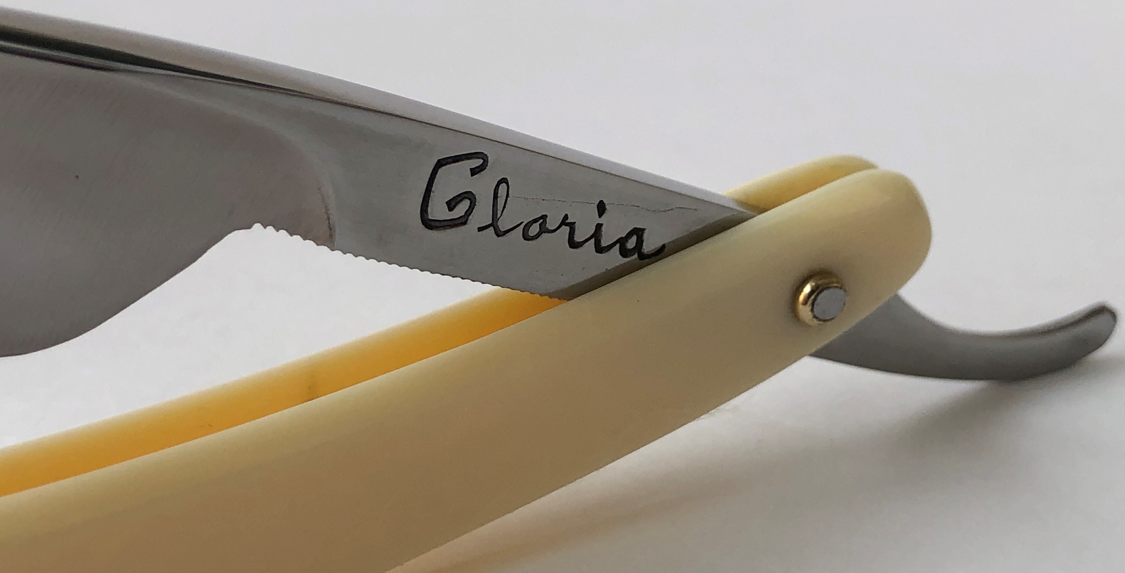 Японская укороченная ,"улыбчатая" бритва GLORIA.,Судя по информации Фикиры с его сайта,бренд ГЛОРИЯ принадлежал легендарной фирме RIBBON,производившей профессиональный инструмент для парикмахеров.