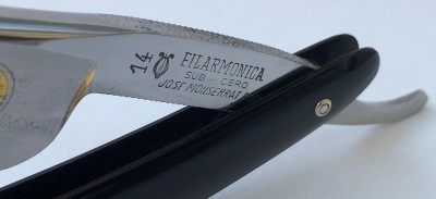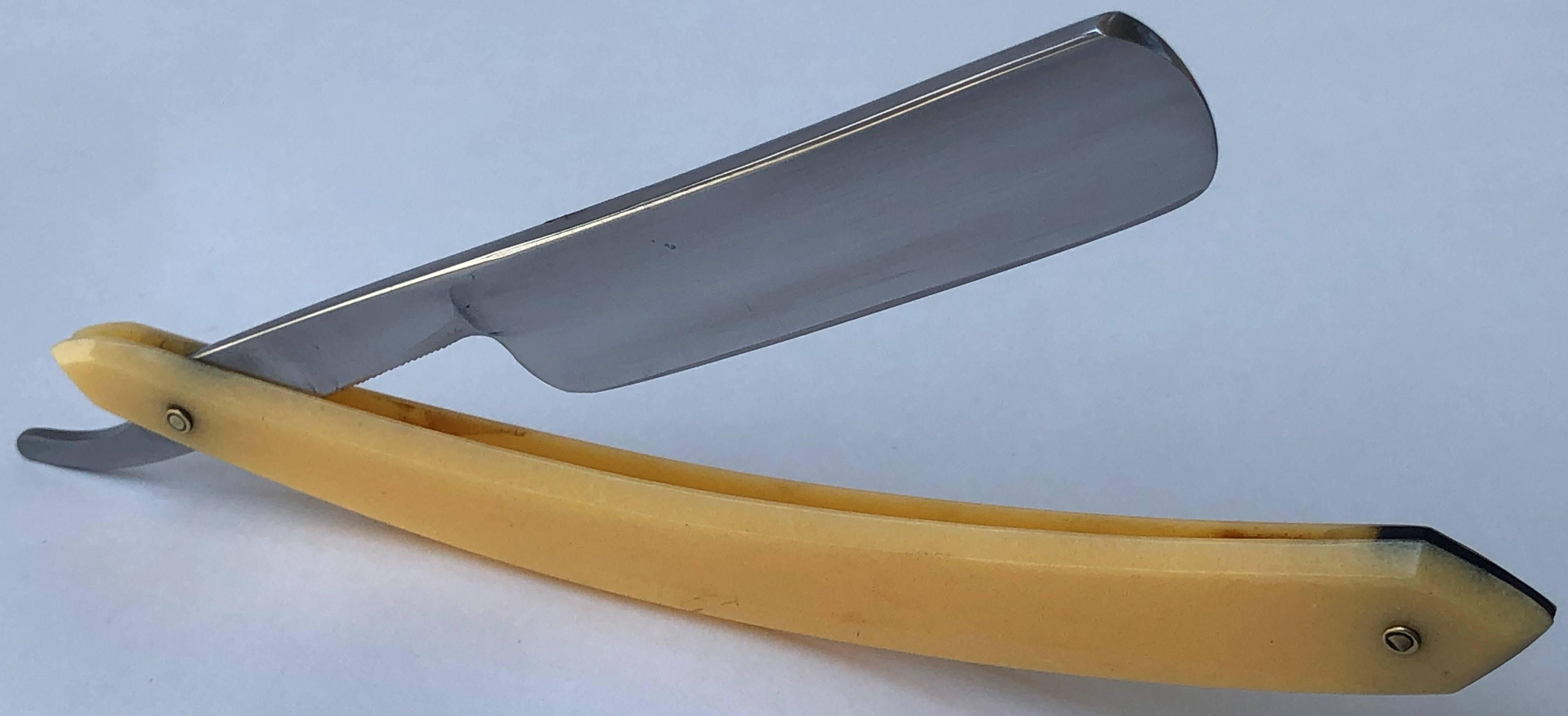 Чья эта бритва, точно сказать не могу. Либо немка, либо англичанка.Но, судя по характеру стали при заточке, то я склоняюсь все таки к немцам.Хотя, могу ошибиться. Бритва судя по всему также середины прошлого века и находится в состоянии близком к идеальному. Крупная, мощная и тяжёлая бритва.Бритва была разобрана, для удаления следов окисления с района осевого пина.На самых минимальных абразивах немного освежил само полотно, а также умеренно отполировал.Кромочка равномерна по всей длине.Оригинальные пины были аккуратно демонтированы и заново установлены.Добавил внутренние шайбы, для надёжности.Сейчас внешний вид у бритвы, как вчера с завода. Очень хорошая, широкая бритва.Не пропустите.