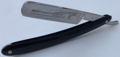 Бритва в очень хорошем состоянии, без активных следов пользования. Практически незаметно.Ничего не разбиралось и не ремонтировалось. Немного отполирован клинок, для придания былого блеска.Все в оригинале.Идеальная геометрия клинка:кромочка равномерна по всей длине и еле заметна.Интересная форма как самого клинка, так и оправы.Достаточно тяжёлая.Красивая, высококачестенная бритва из прошлого, так что не пропустите! Заточена и готова к бритью.