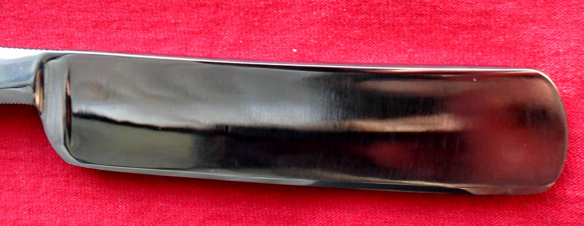 По всей видимости, ручка родная, эбонит. Ширина бритвы 20 мм, толщина обуха 5 мм.