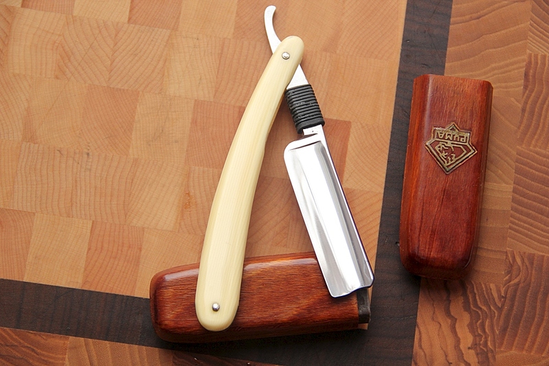 По всей видимости бритва хоть и очень старая, но не пользованная. По крайней мере следов заточки и юза я не заметил. Ручку снял,почистил место крепления оправы с металлом, приспособил новую резинку, собрал снова, сохранив все оригинальные шайбы. Лезвие не имеет никаких изъянов; ни коррозии, ни трещин, за исключением нескольких каверн на обушке, но они ни на что не влияют.Сталь твёрдая, как у всех Пум, зато заточку держит хорошо. Надолго хватит. Геометрия бритвы идеальна: кромка тоненькая и равномерно-одинакова по всей длине лезвия.
