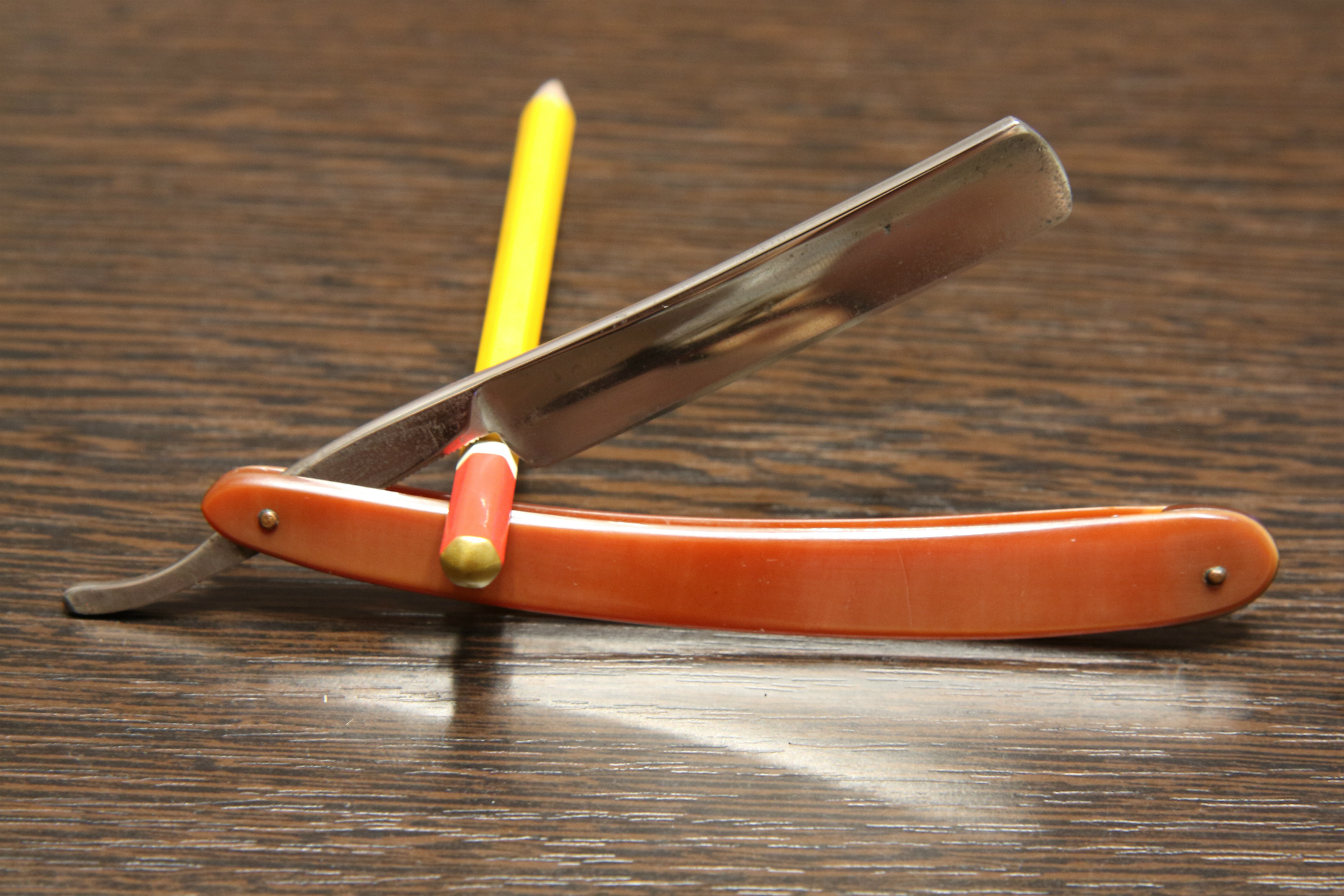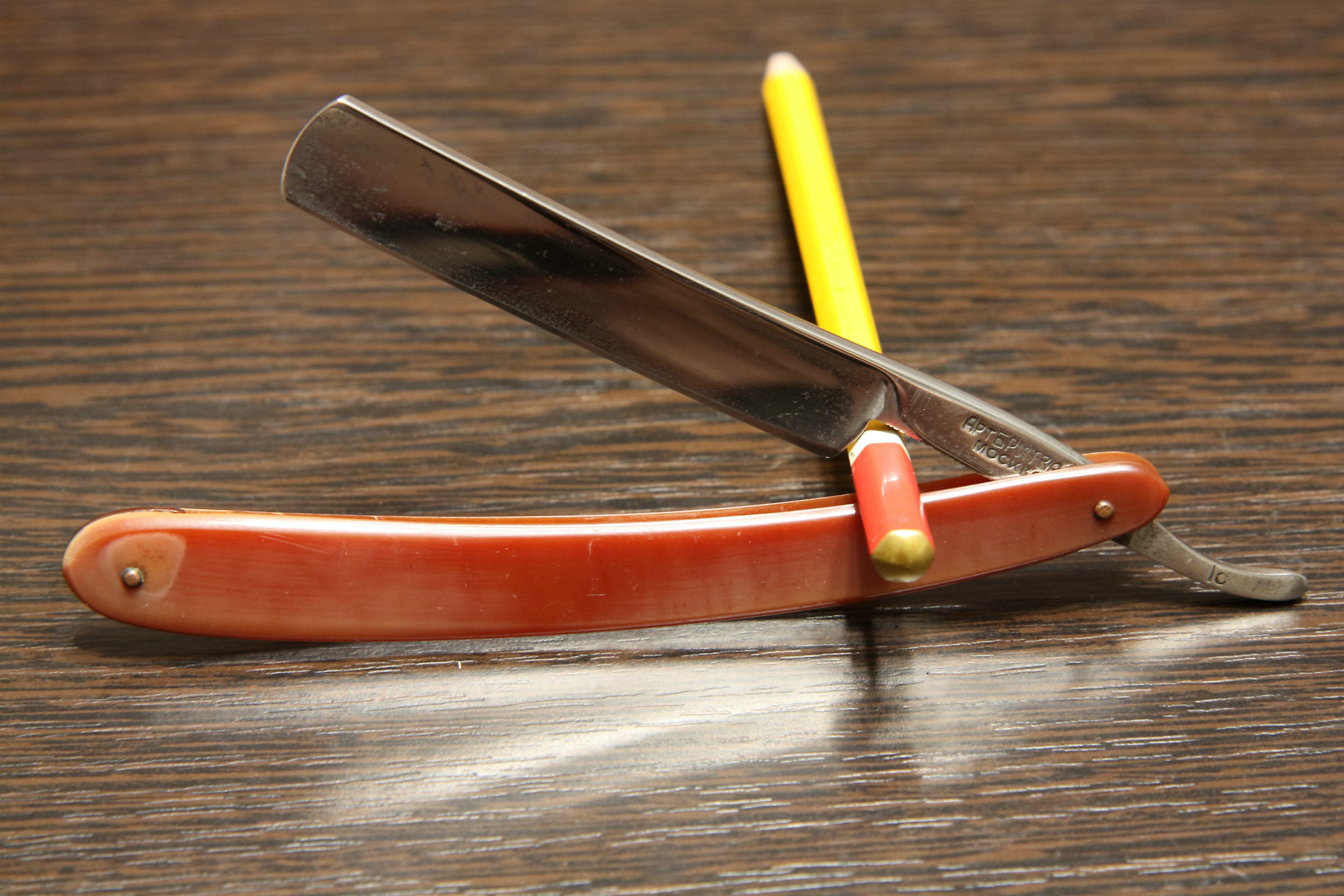 Опасная бритва Двухзаковная, завод СТИЗ, 1958 год. Ширина полотна 17 мм, легкая улыбка, ручка под янтарь, родной футляр. Ко мне попала с заводской заточкой (не пользованная), затачивалась мной впервые (подготовлена к бритью), полотно почистил от следов времени (кое что осталось, но не критично). Двухзаковная это двойная выборка, обеспечивающая легкость заточки/правки и дающая эффективное бритье. Цена - руб.