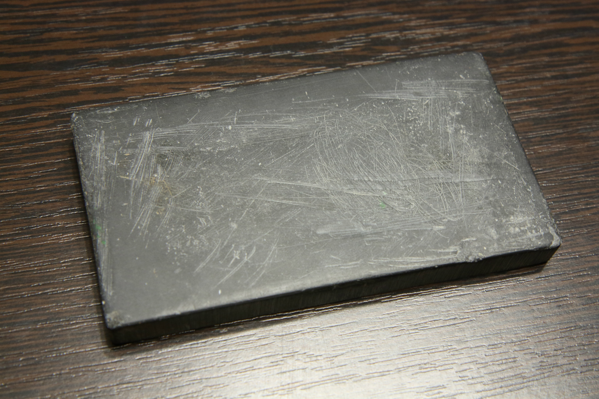 Для доводки бритв, на упаковке была пометка сорт "бритвенный" (есть еще сорт "инструментальный"), размеры 135х72х12 мм. Выровнен и доведен до F1200, на одной грани есть скол. Паразитных включений нет, работает на уровне до 8000 грит, дает хороший рез волоса на весу. Цена - руб.