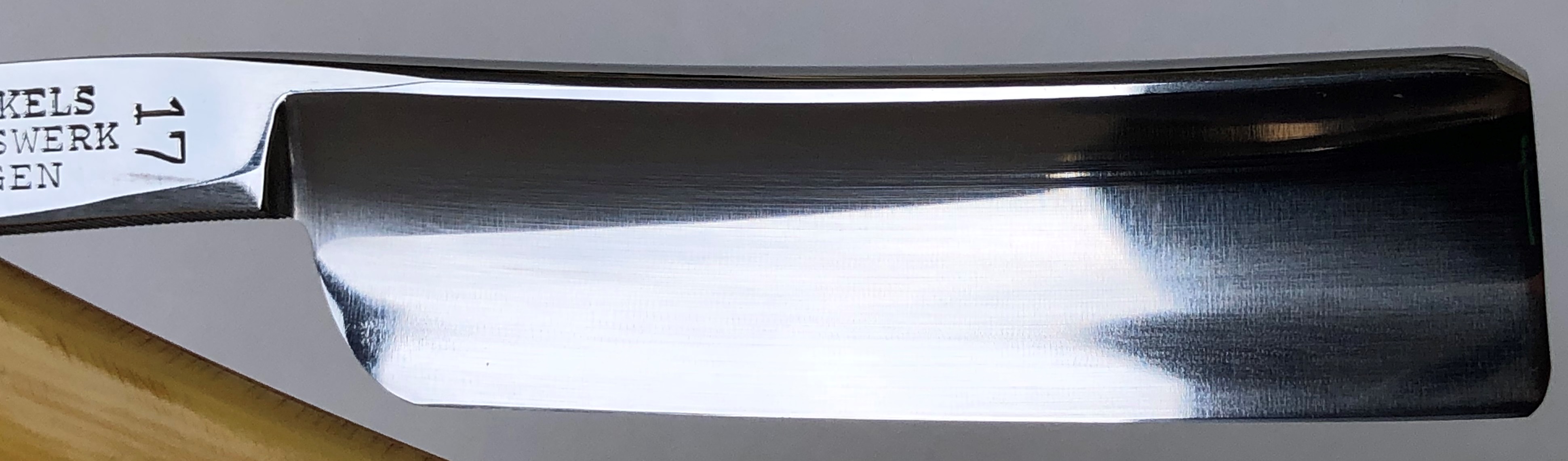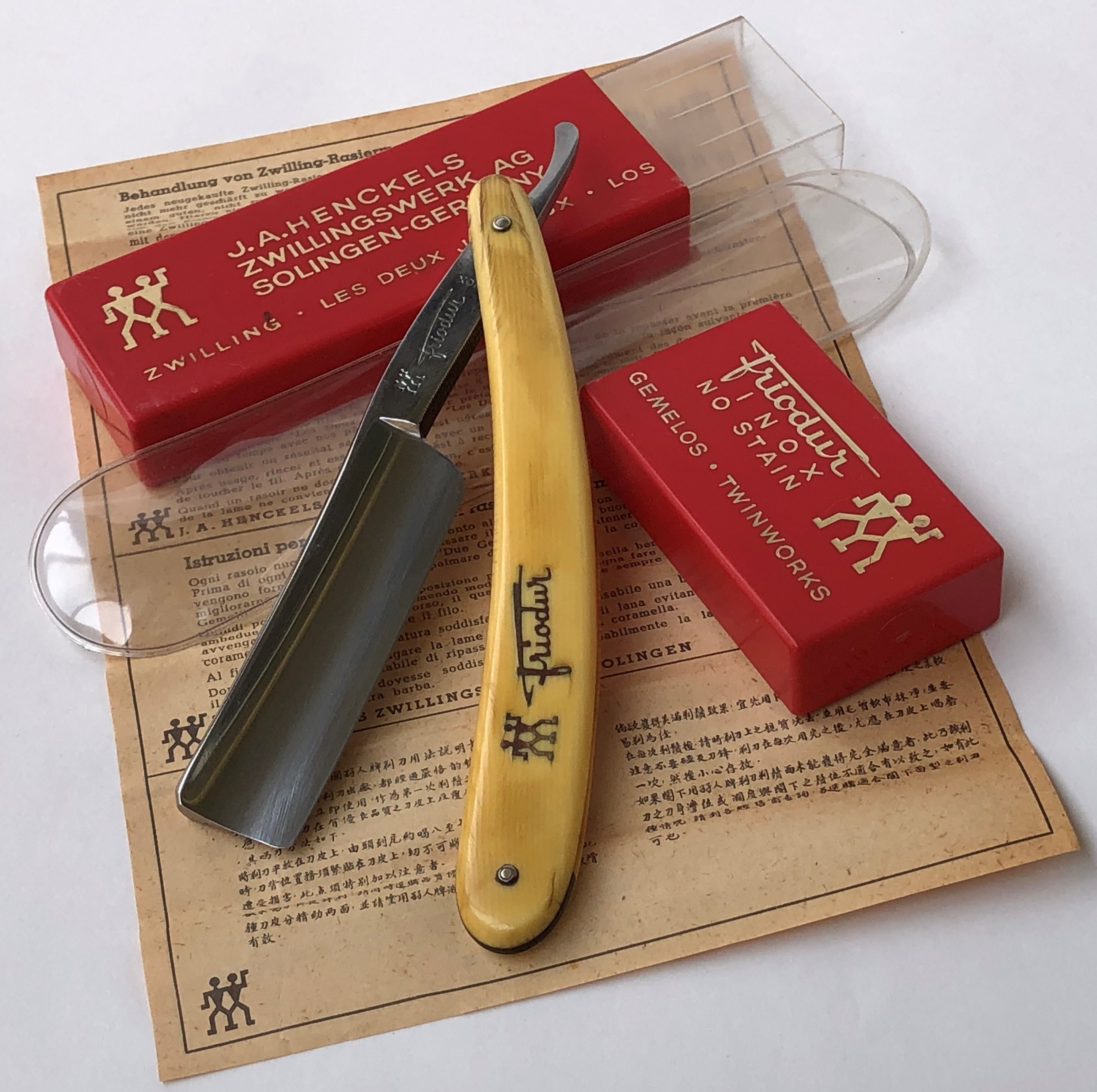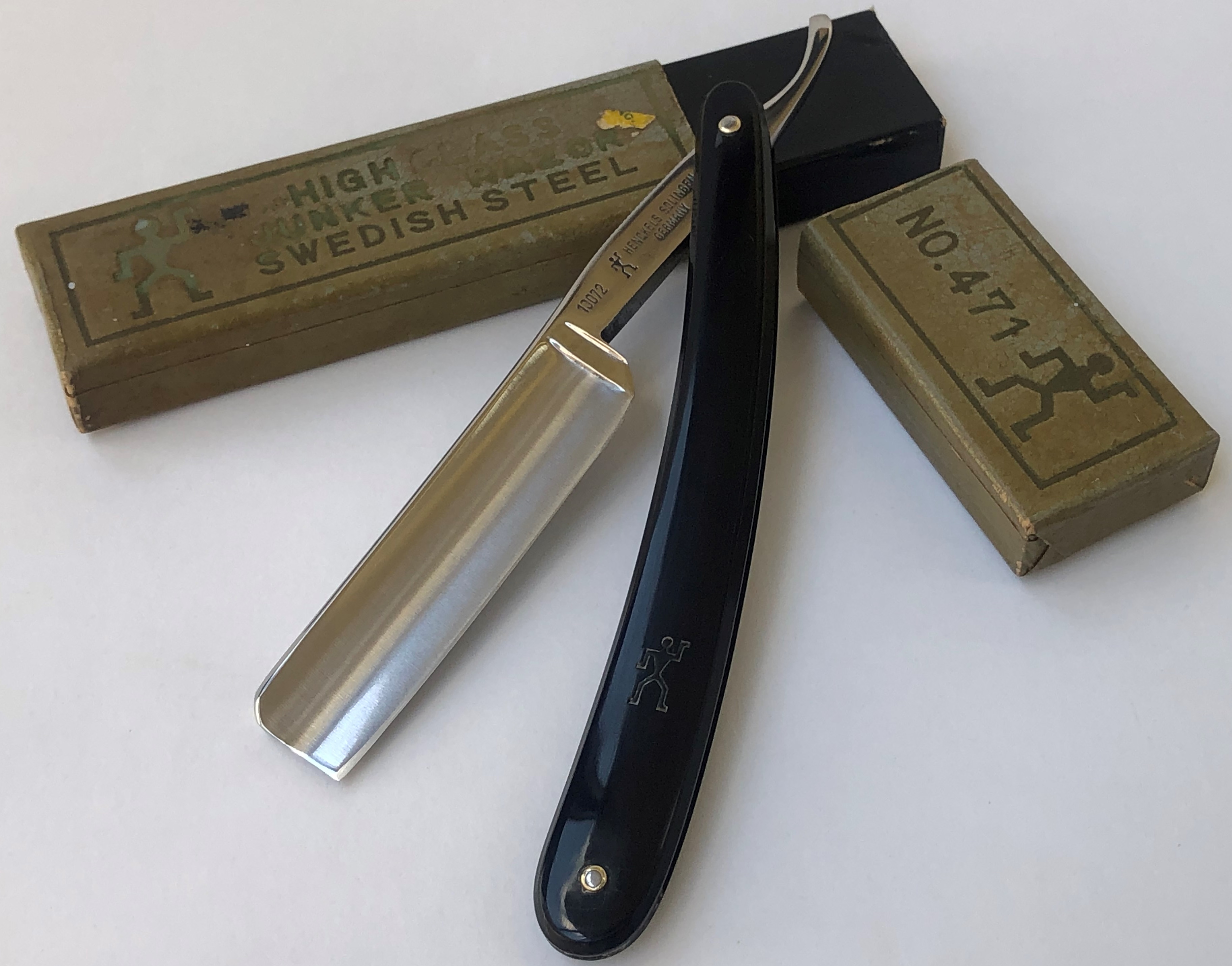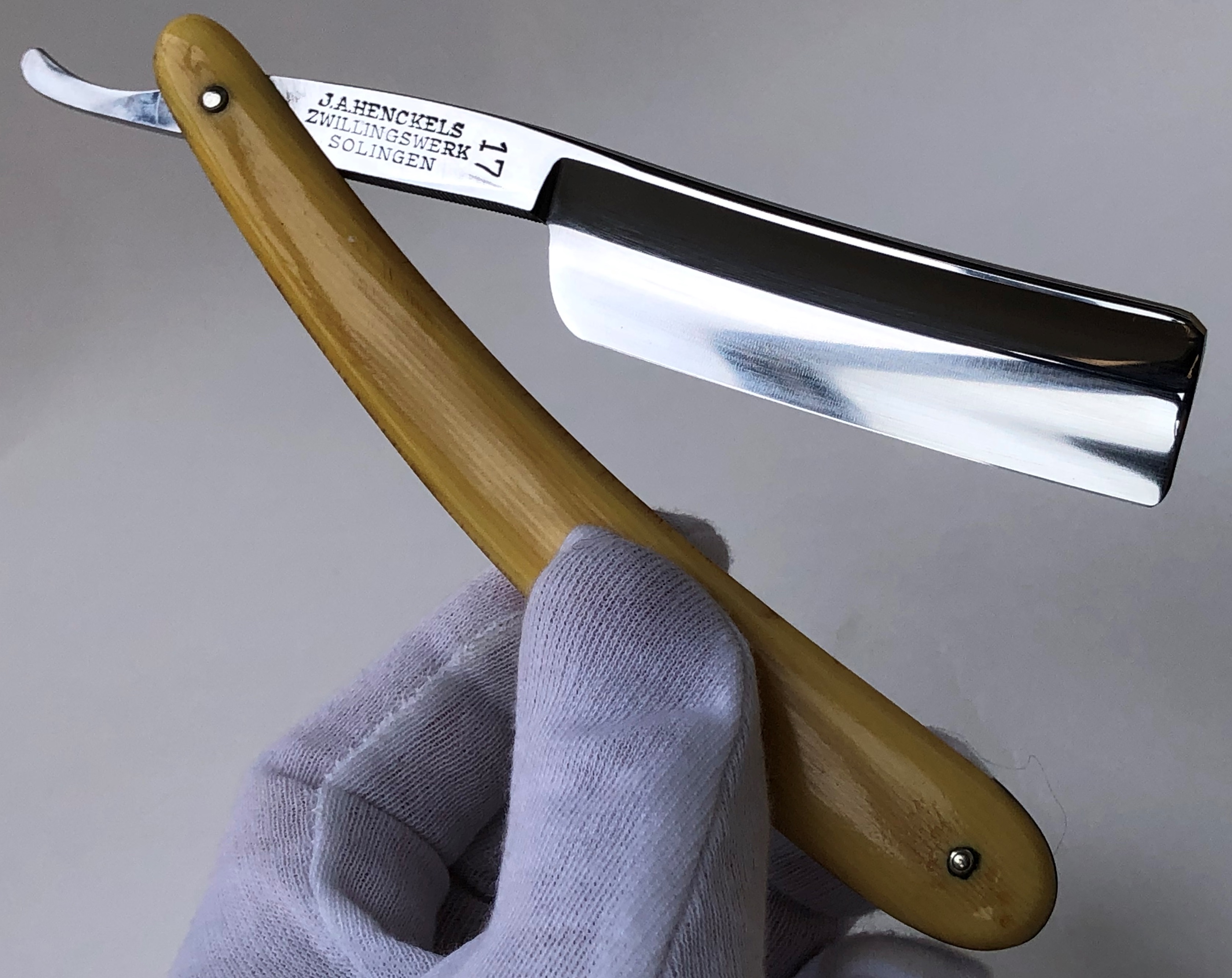 Бритва в очень хорошем состоянии, без активных следов пользования. Была разобрана для минимальных,косметических работ.Еле заметно задранный носик. Умеренная шлифовка и полировка.Кромочка равномерна по всей длине.Хенкельс с одним близнецом встречается реже, чем с двумя. Коробочка от другой модели.Бритва заточена и готова к бритью.