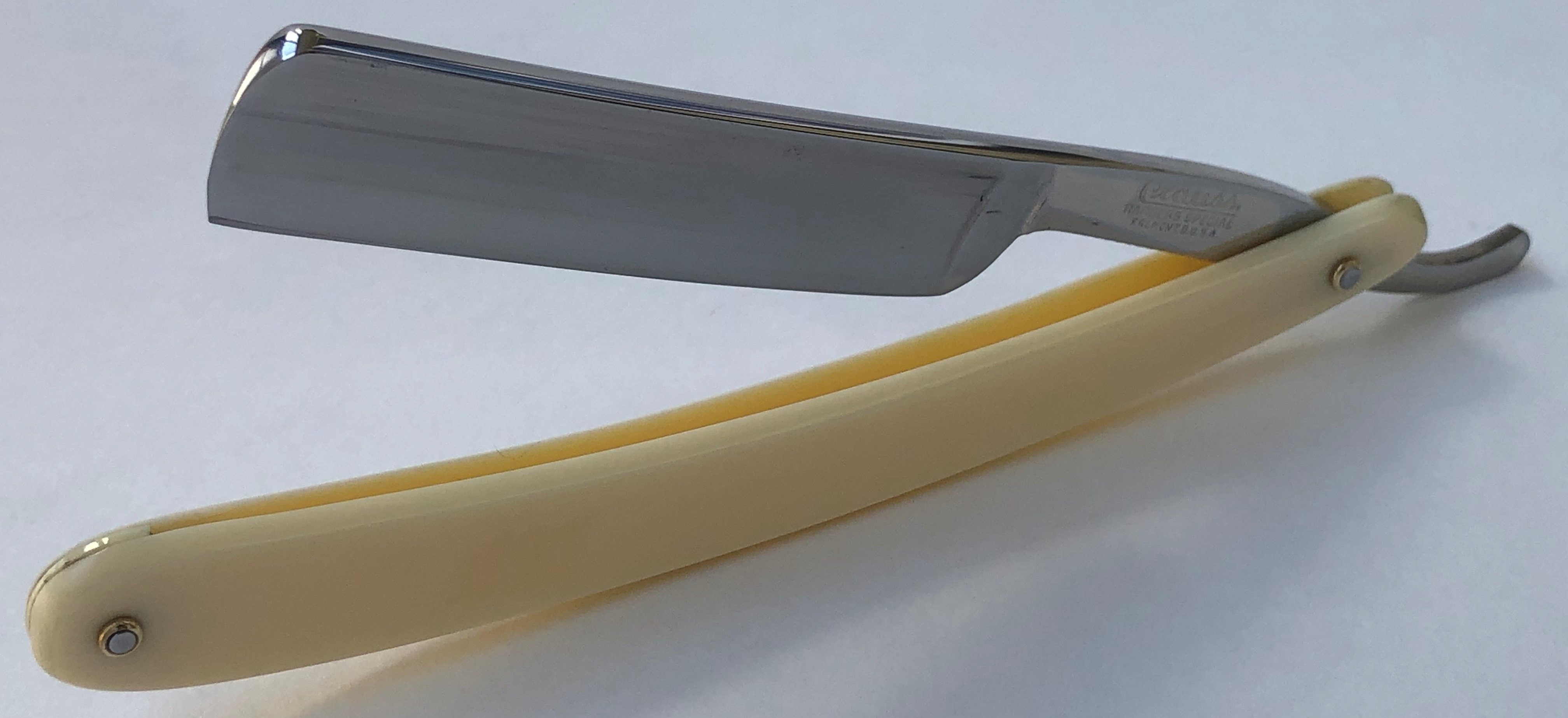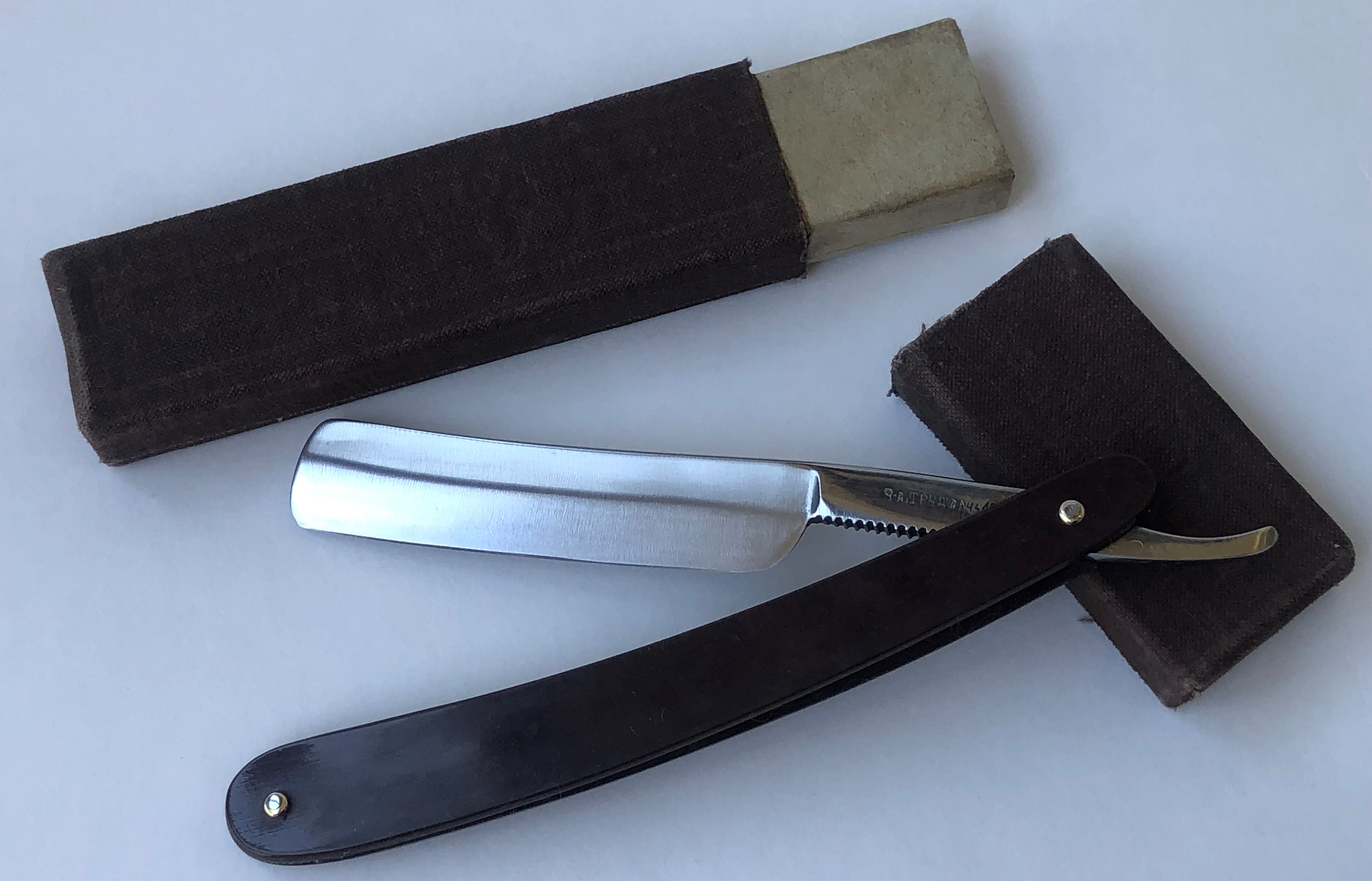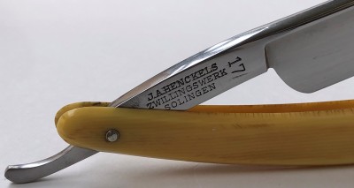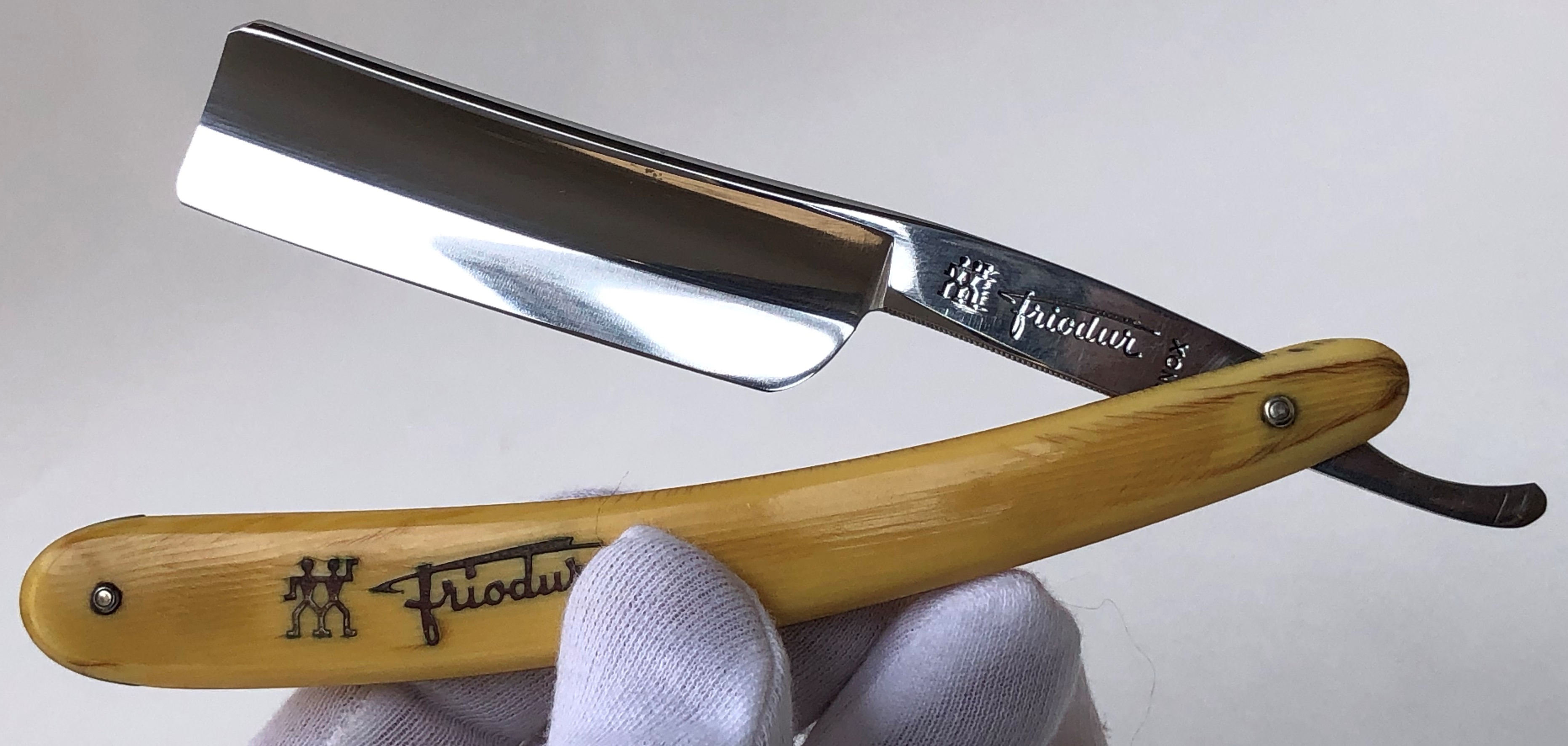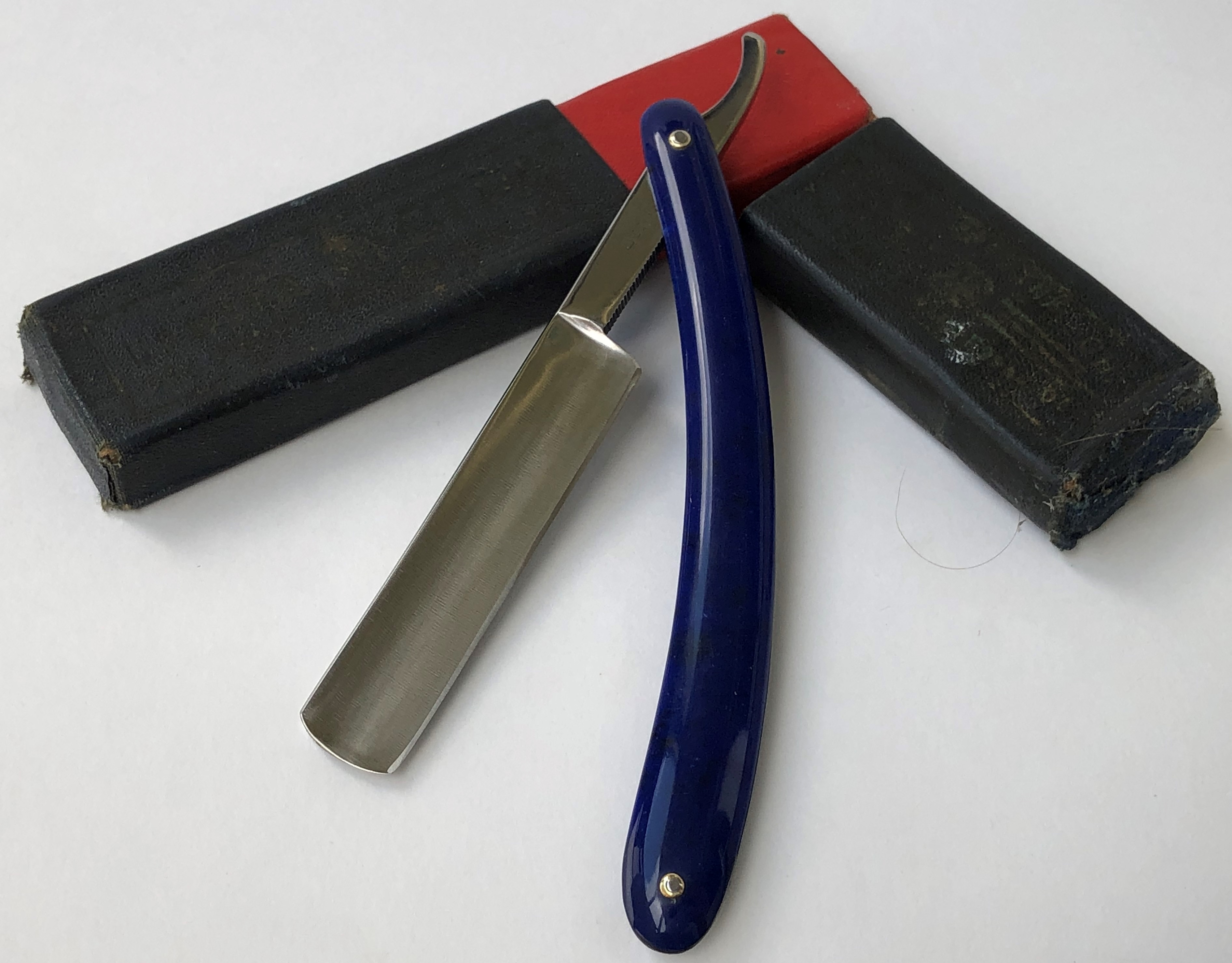 Бритва в очень хорошем состоянии, без активных следов пользования. Была разобрана для минимальных,косметических работ.Еле заметно задранный носик. Умеренная шлифовка и полировка.Кромочка равномерна по всей длине.Хенкельс с одним близнецом встречается реже, чем с двумя. Коробочка от другой модели.Бритва заточена и готова к бритью.