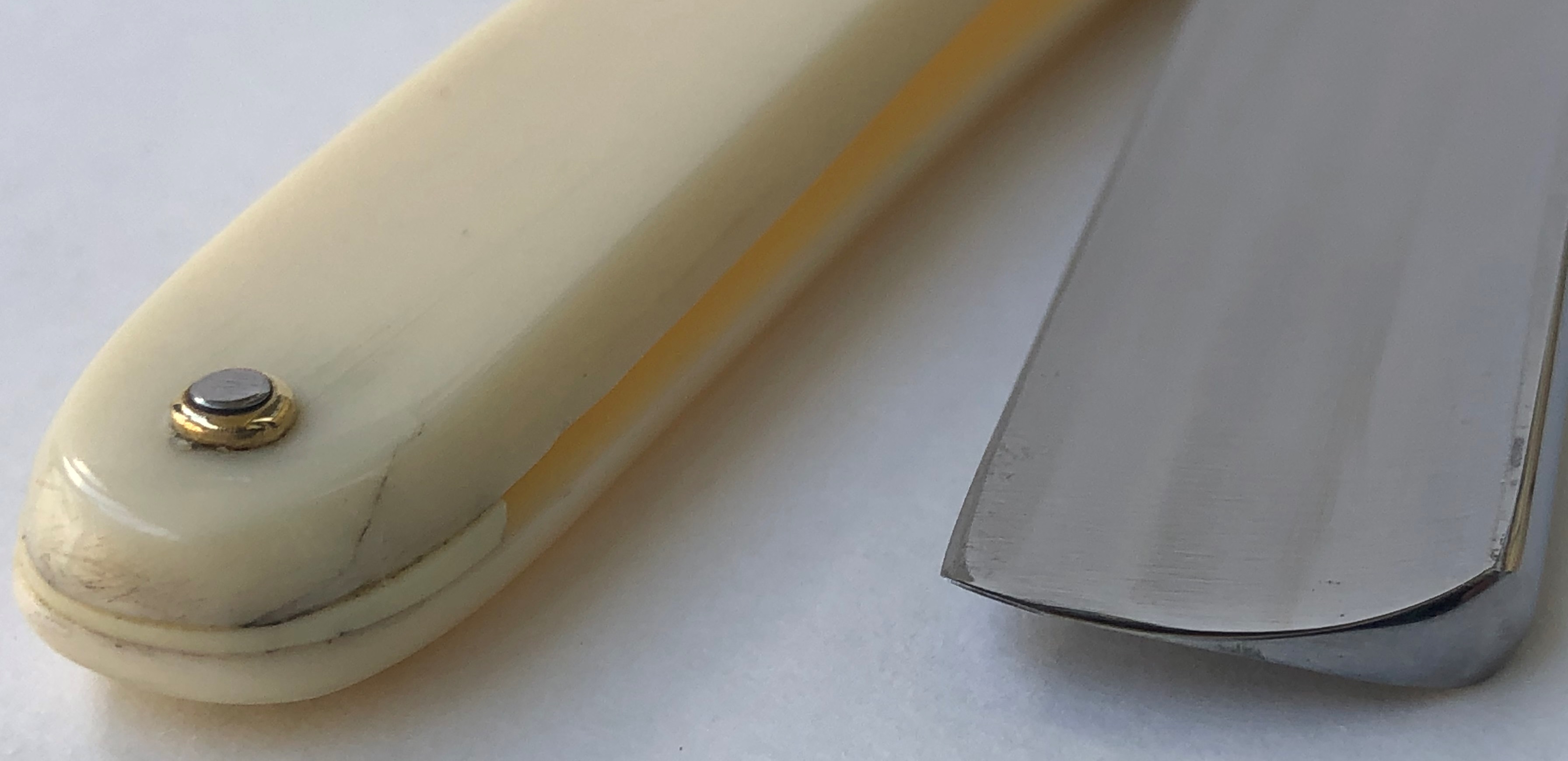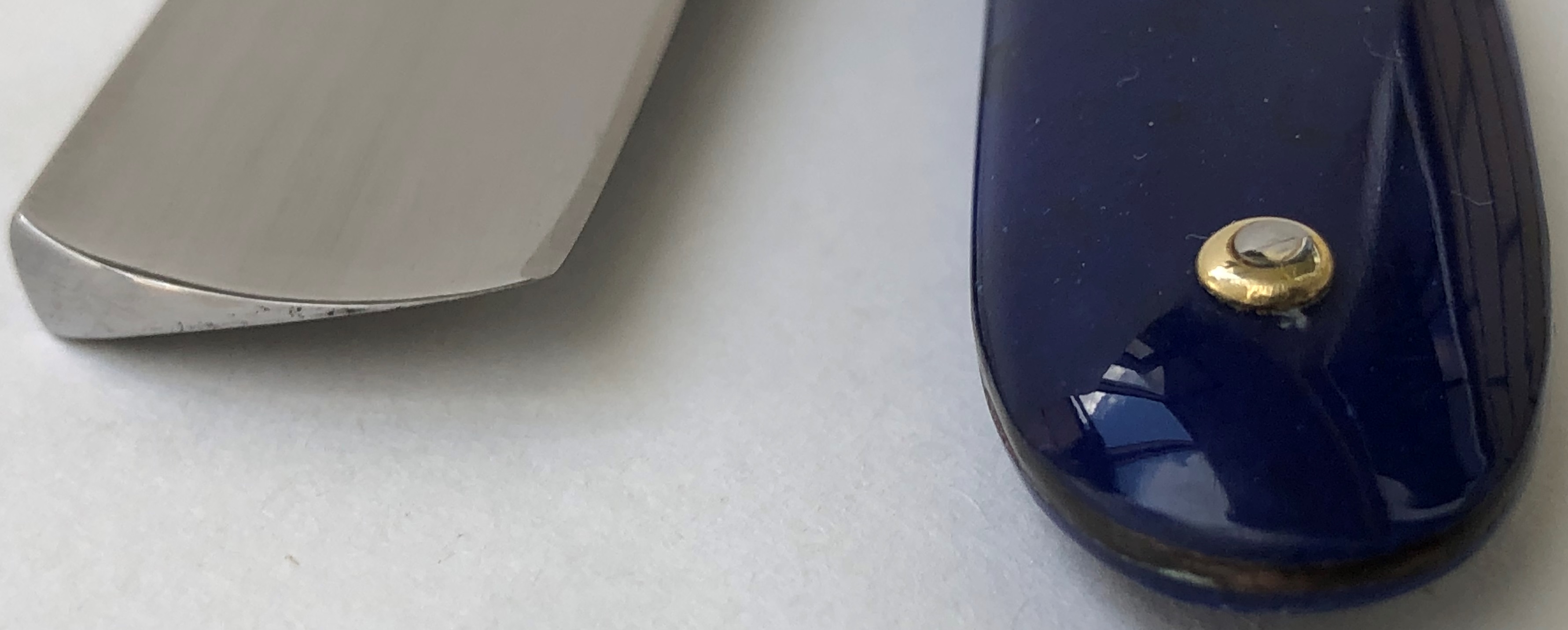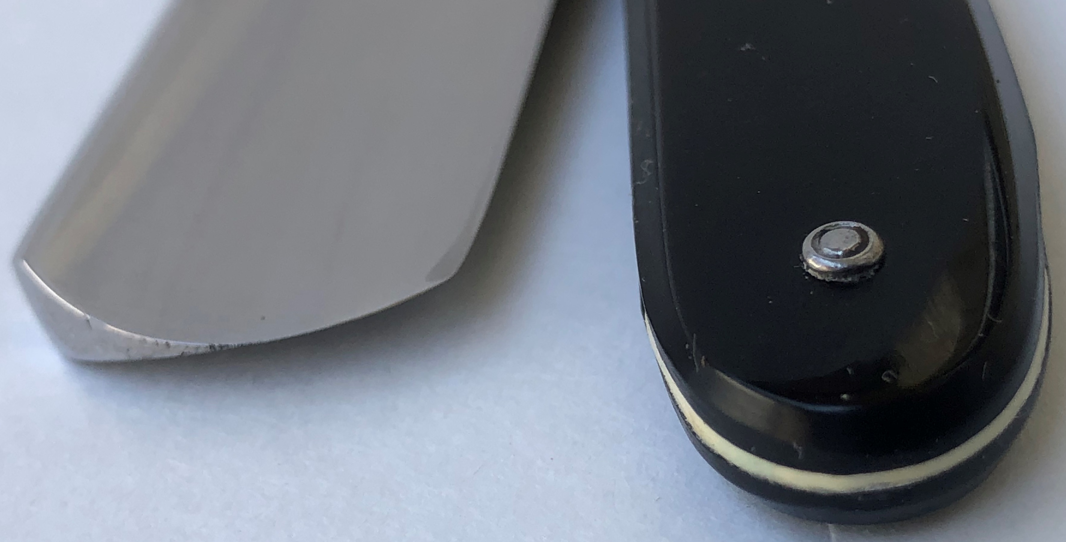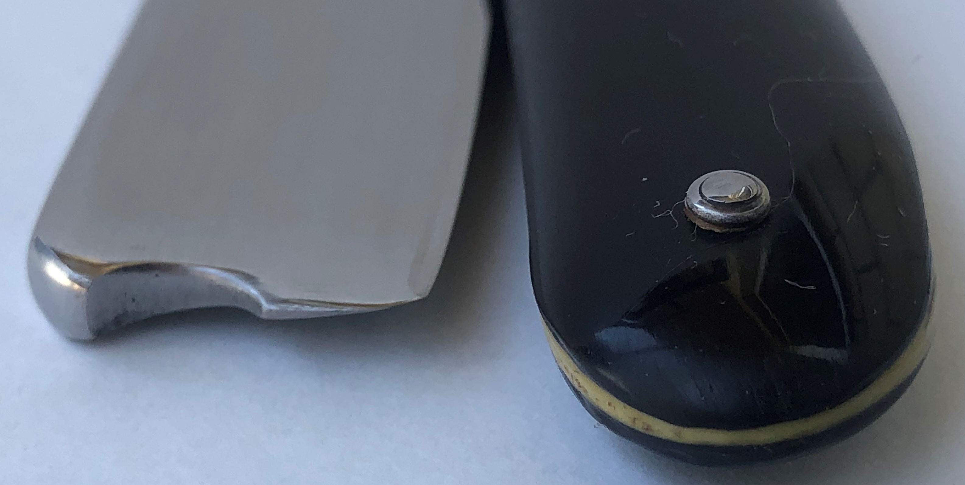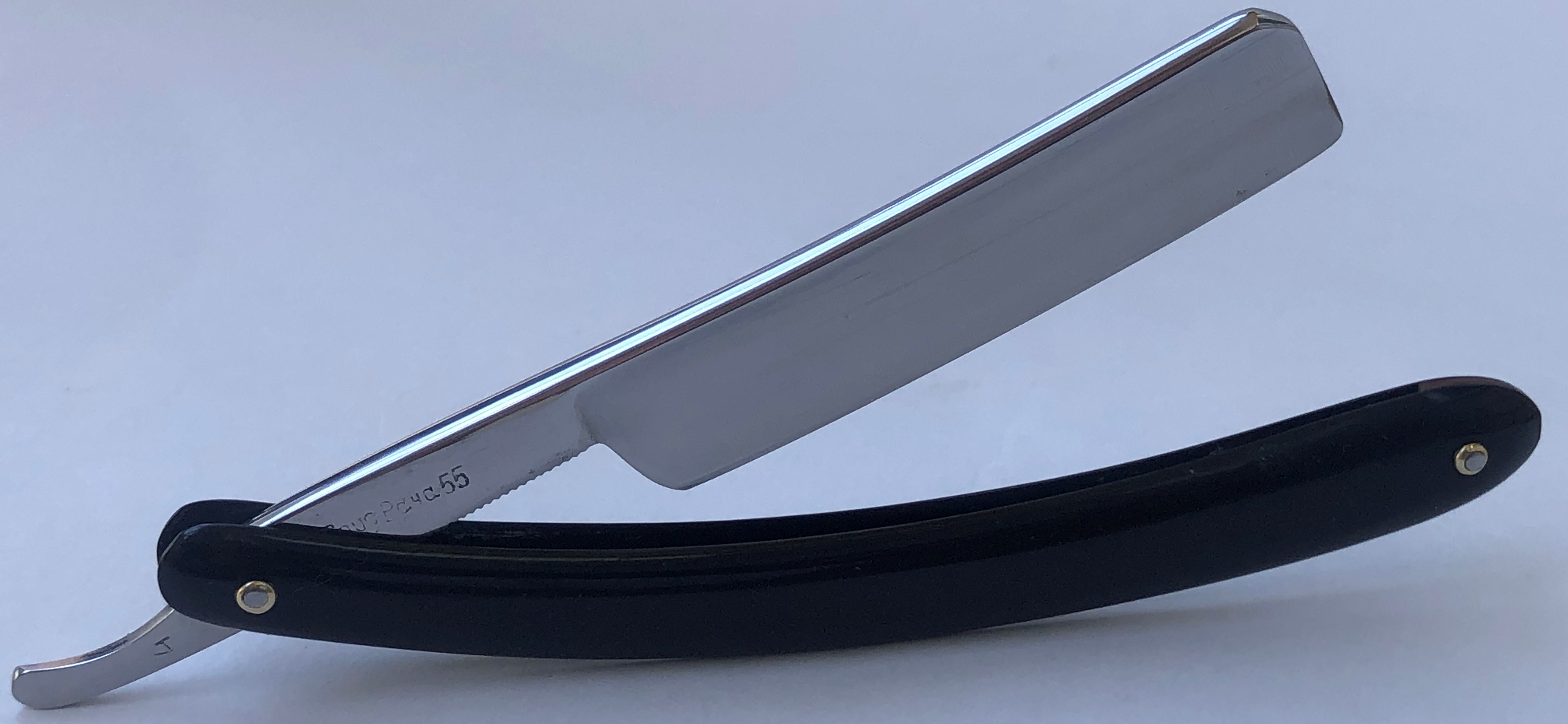 Бритва в пользовании не была,но требовала минимальных косметических работ,с разборкой и сборкой. Замена родных заклепок на двух-цветные втулки, а также с добавлением внутренних шайб,для надёжности.Кромочка равномерна по всей длине.Оригинальная коробочка также 1955 года, что немаловажно! Отличный вариант для новичка.Не пропустите бритву удачного года производства.Заточена и готова к бритью.