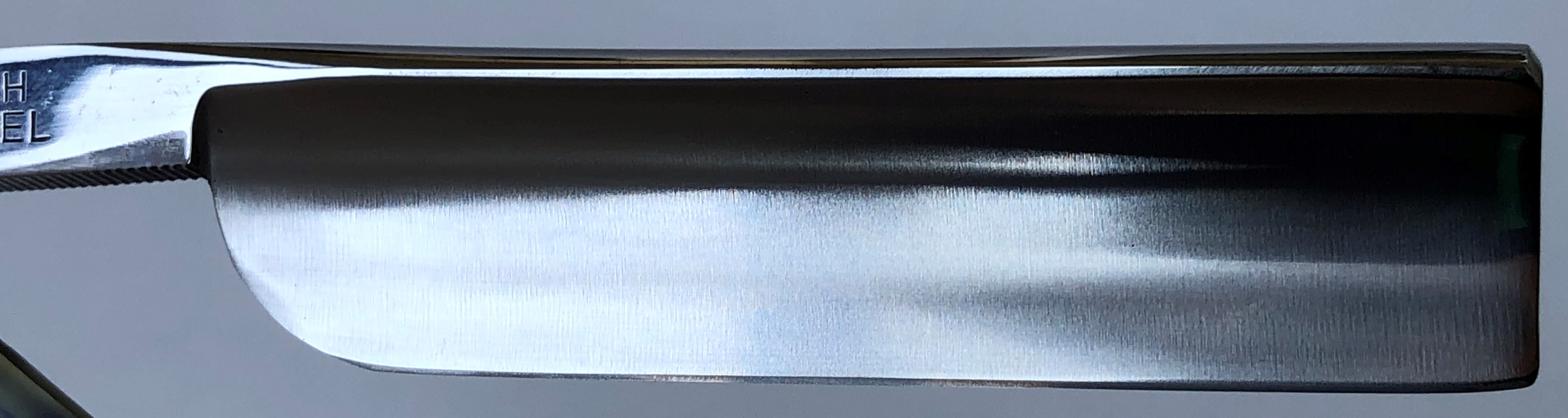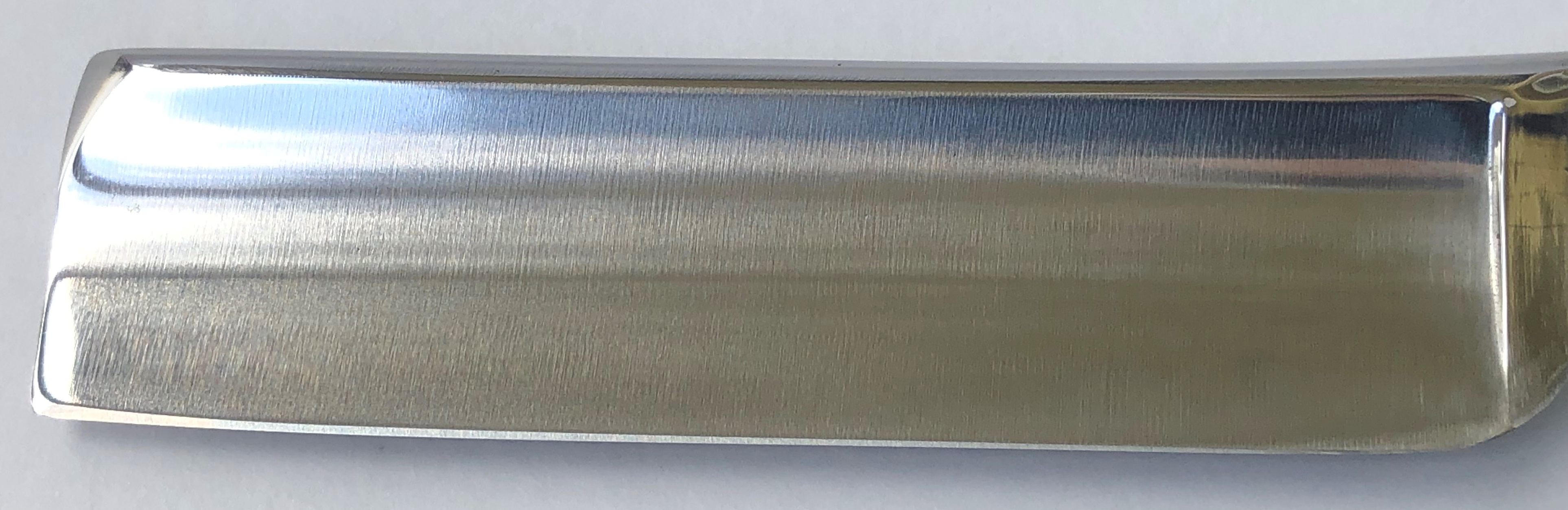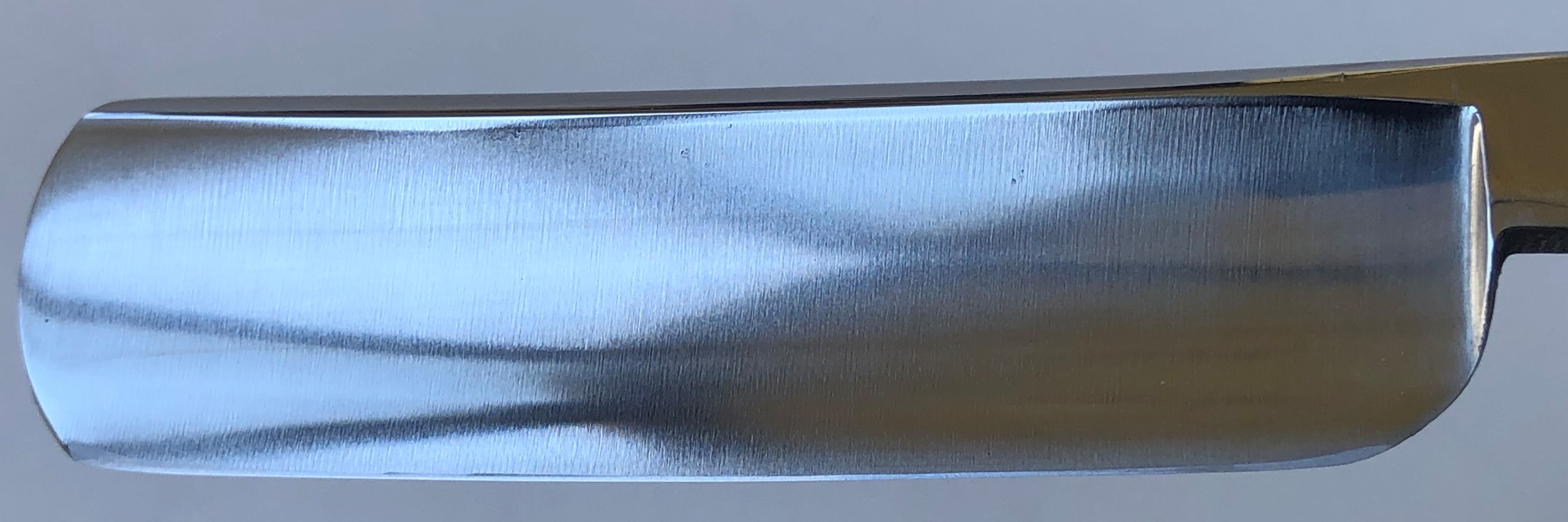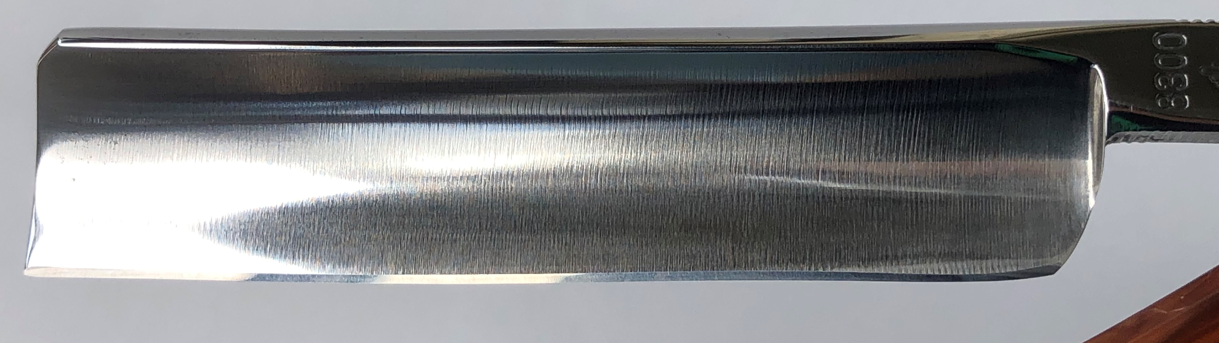 Бритва малопользованная изначально, но имеется небольшая разность в толщине обушка, что привело в неравномерной утОчке полотна.Сама по себе кромка равномерна по всей длине, но наличие небольшой "волны" присутствует, что естественно скажется на конечной стоимости бритвы,без потери качества стали и комфортна бритья. Бритва была разобрана для минимальных косметических работ и заново собрана, с добавлением внутренних шайб.Умеренная шлифовка и полировка.Сталь чистая,без видимых дефектов.Бритва заточена и готова к бритью. Для тех, кому не важна коллекционная стоимость , а именно профессиональные качества предмета стоят на первом месте.Не пропустите именитого японца за совсем бюджетные средства.