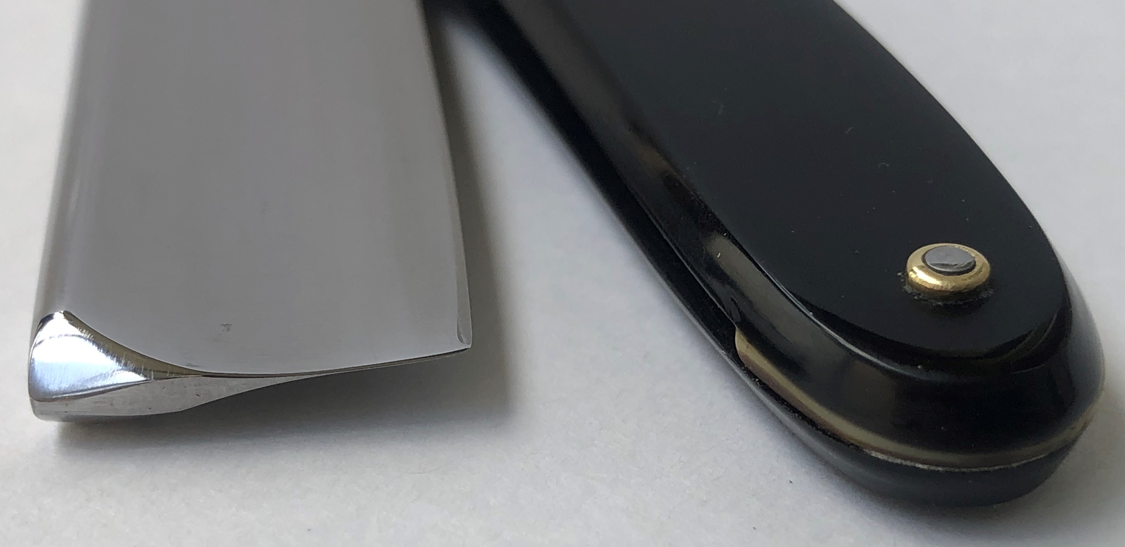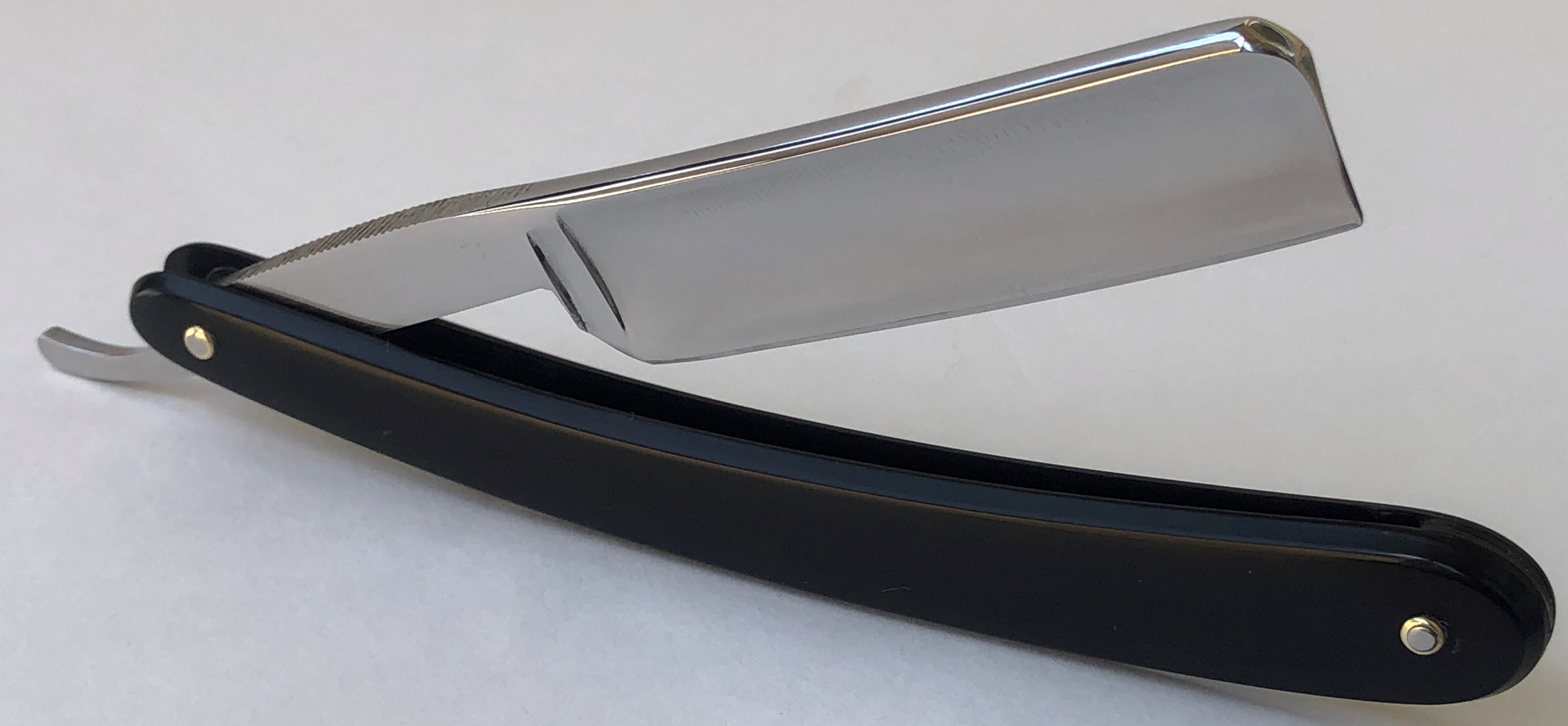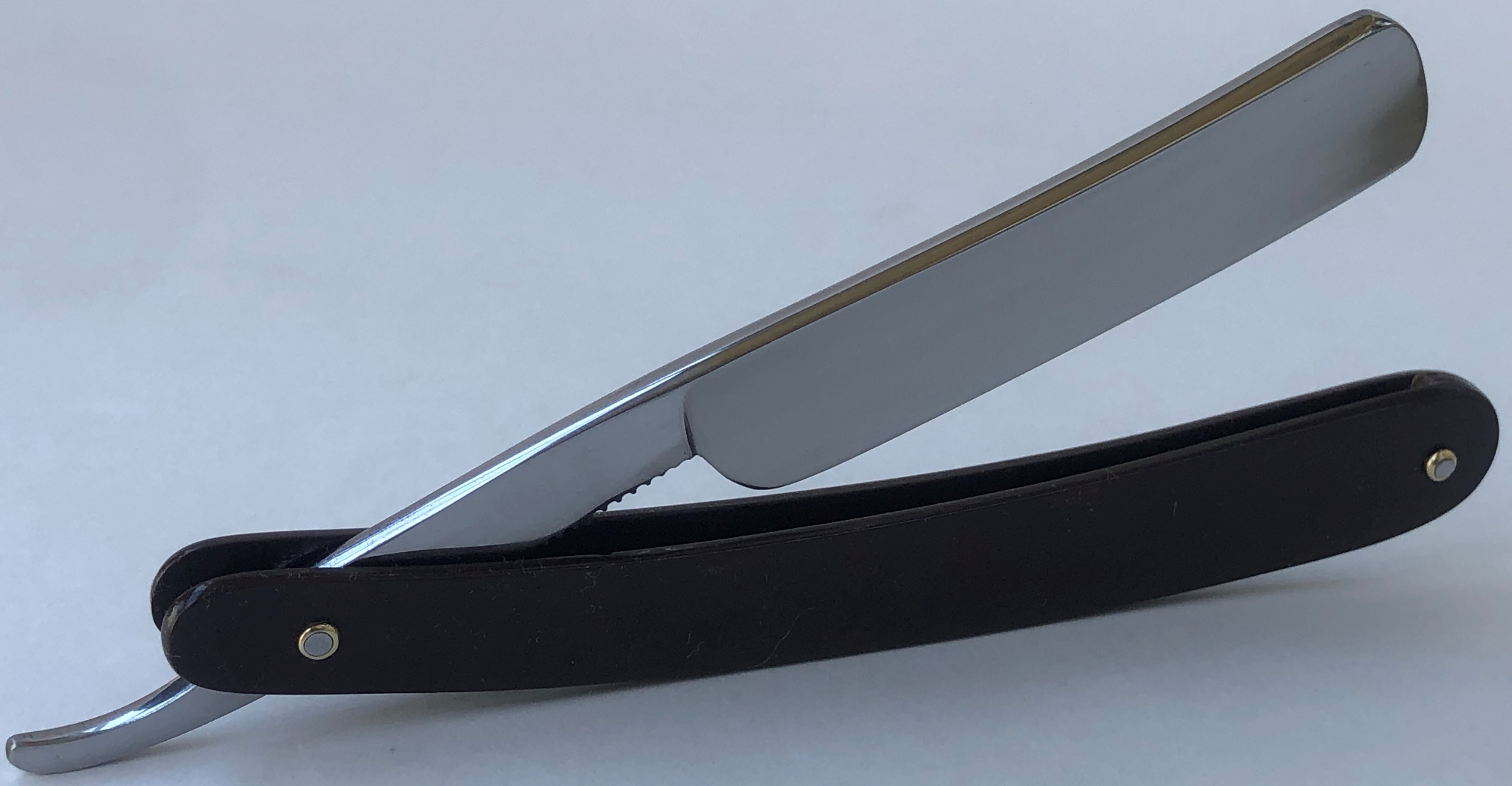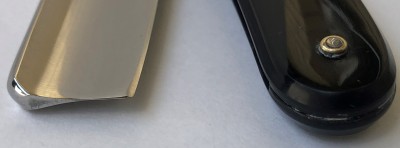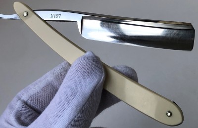 Бритва без следов пользования, скорее всего не точилась вообще. Была разобрана, для минимальных, косметических работ.Новые внутренние шайбы и двух-цветные втулки.Кромочка равномерна по всей длине. Сталь и кромка чистые, без видимых дефектов.Достаточно тяжёлая.