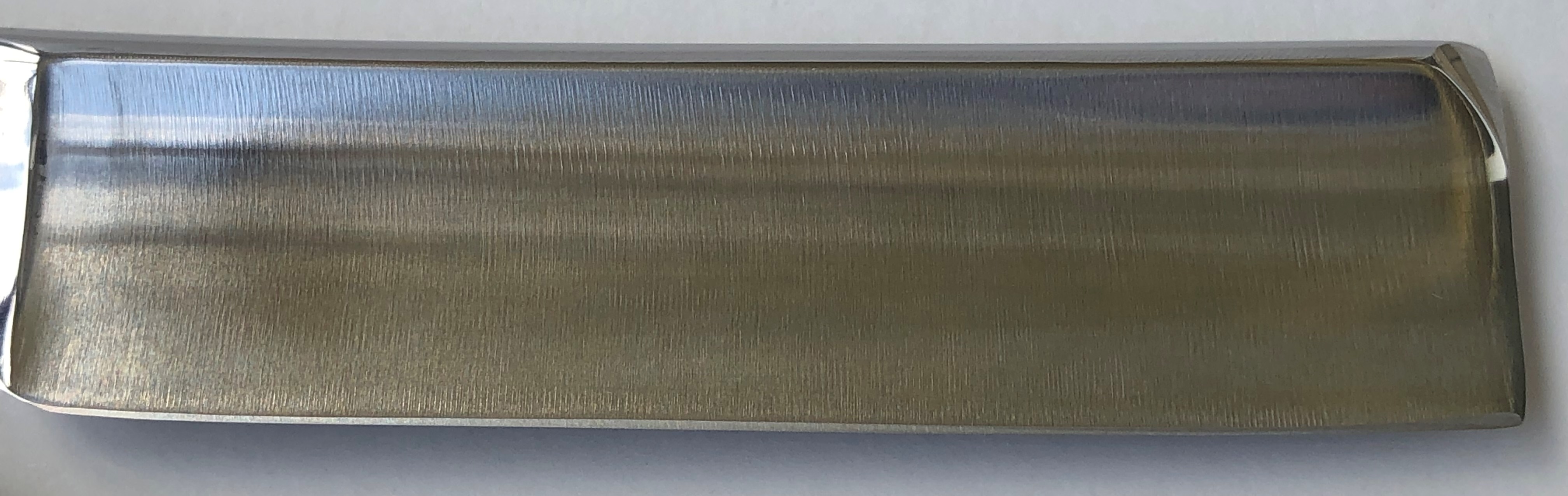 Как и положено, бритва сварена из двух частей. "Тело" бритвы и сама пластина, выходящая на РК.(Фото не смог отобразить место сварки,волнообразной формы, но при детальном изучении все видно).Как пишет мастер, сама вваренная пластина достаточно мягкая, что прекрасно сказывается на комфорте бритья.Эффектное воронение.Полиролью по металлу немного стер избыточную черноту.Тяжёлая, мощная бритва, с идеальной геометрией и равномерной кромкой по всей длине. Сложная , красивая и качественная работа.