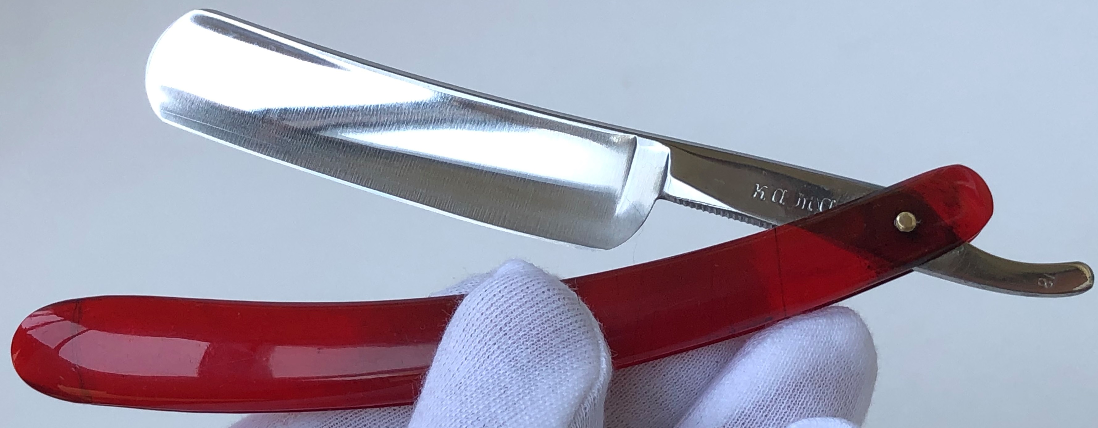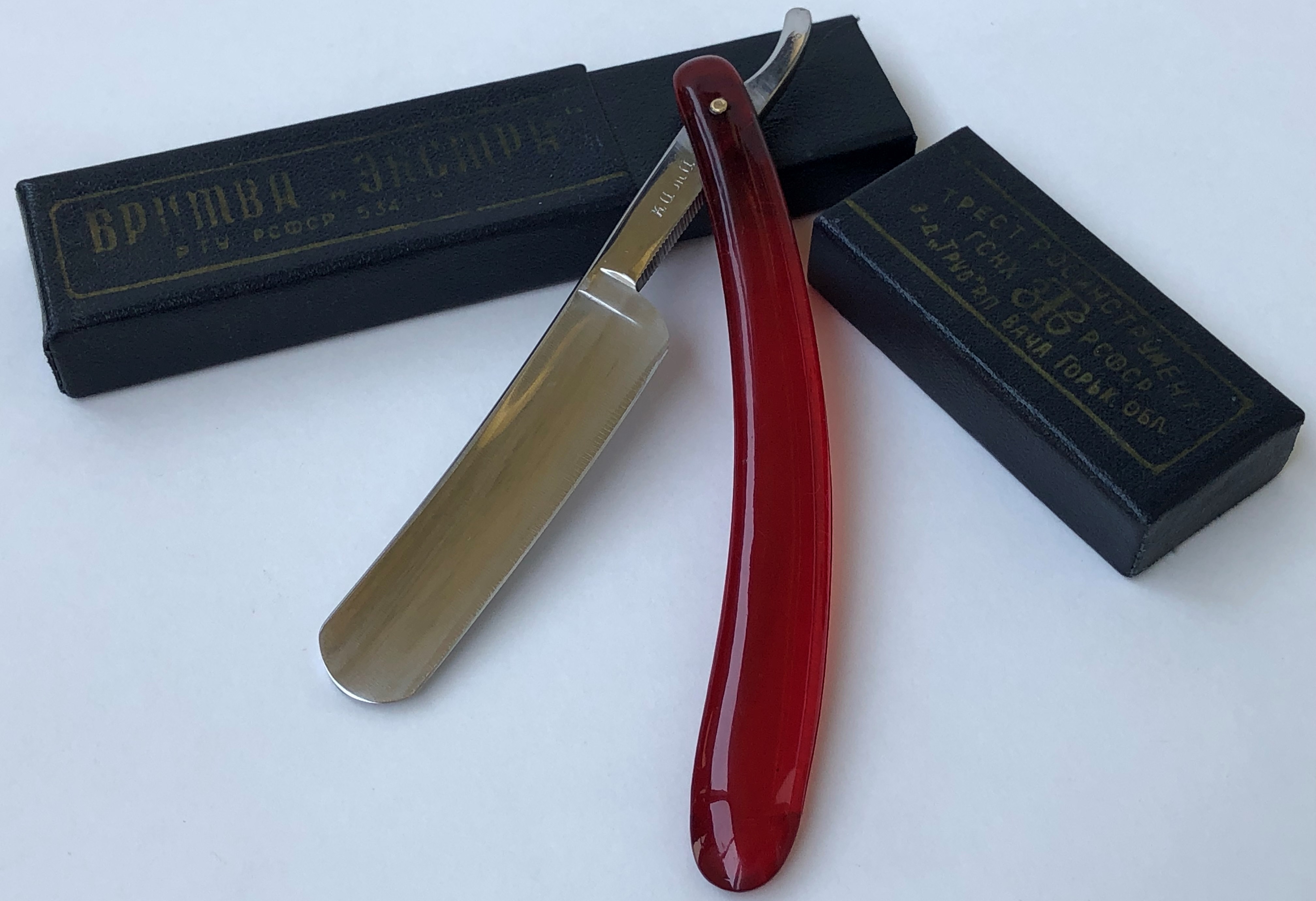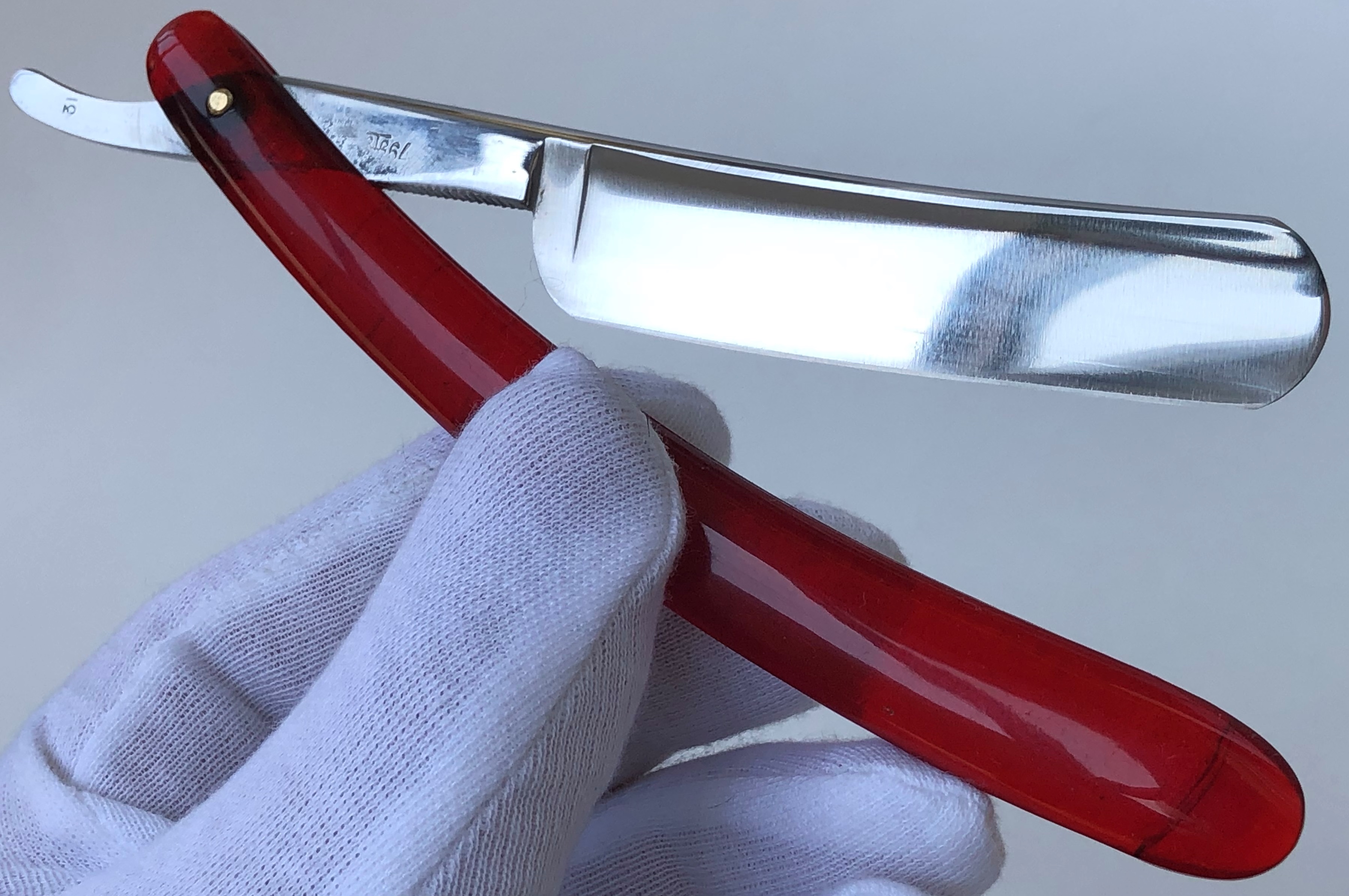 Бритва с хранения. Только оттер от остатков масла и умеренно отполировал клинок.Ничего не реставрировалось и не разбиралось.Остатки следов от электро-химической заточки присутствуют. Идеальная геометрия полотна:кромочка равномерна по всей длине. Эффектна ярко-красная оправа. Коробочка от "ЭКСТРЫ".Бритва заточена и готова к бритью. Отличный и недорогой вариант для новичка.
