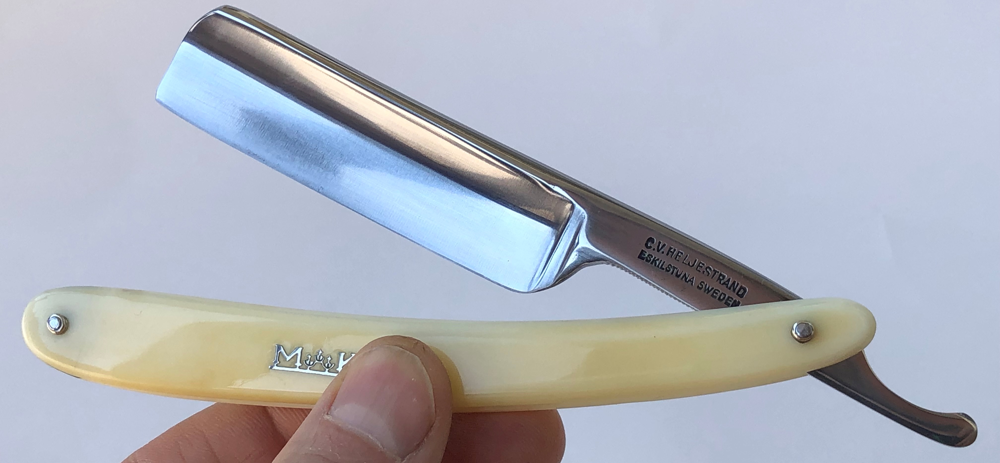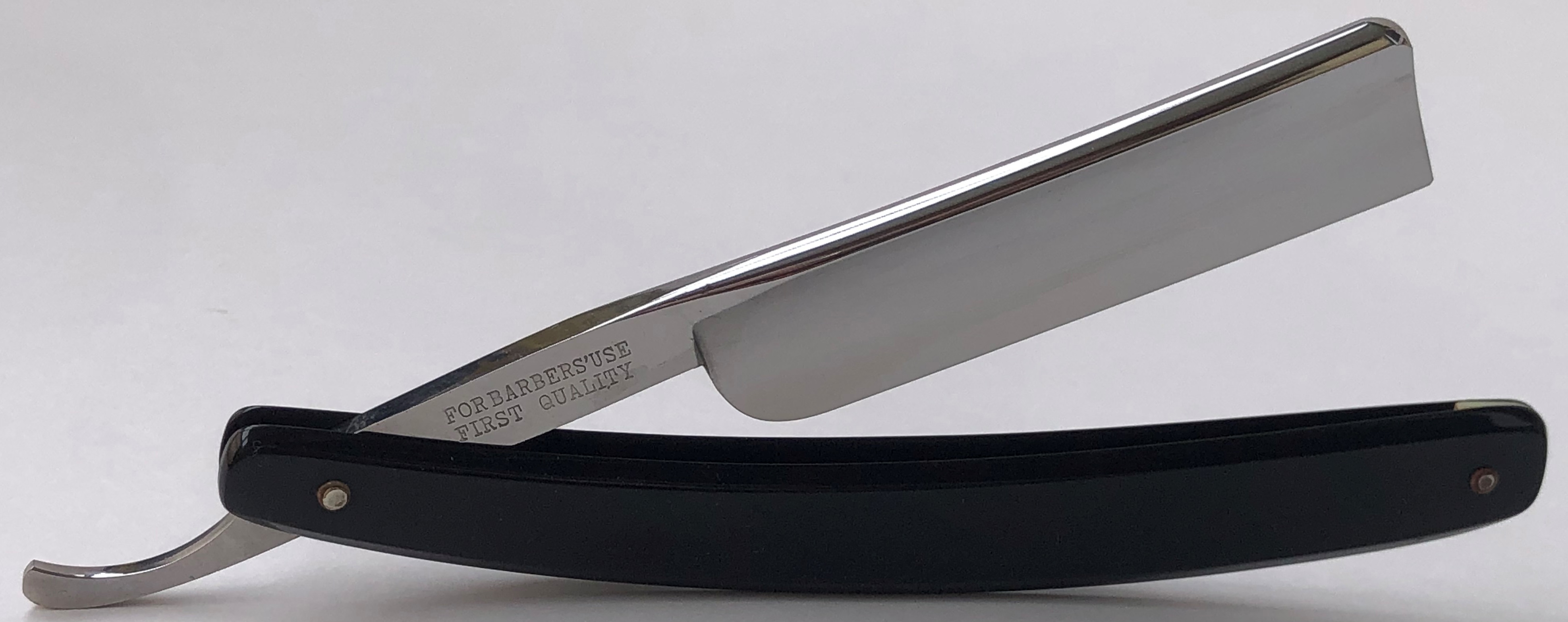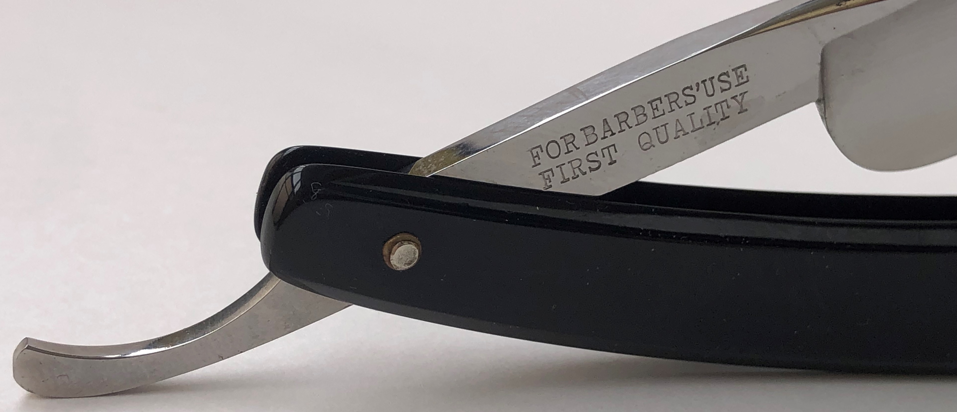 Ширина полотна-20.0 мм. Толщина обушка-6.0 мм. Форма лезвия-полная вогнутость. Углеродистая сталь. Бритва середины прошлого века. Добротный парикмахерский инструмент на все случаи жизни.Высококачественная шведская "звонкая" углеродка на клинке.Толстый обушок даёт возможность не выставлять угол атаки, а класть бритву по-барберски-плашмя на лицо и таким образом брить/бриться. Идеальная геометрия полотна:кромка равномерна по всей длине. Бритву немного освежил от древней патины и окисления,с минимальной шлифовкой и полировкой. Мощную и тяжёлую родную оправу решил все таки сохранить и небольшую трещинку хорошо пропаял с обеих сторон и залил эпоксидной смолой.( Думаю, что намертво).Но, в любом случае,на оправу будет распространяться гарантия. Мало ли что.. Новые внутренние шайбы и двух-цветные пины. В общем и целом,отличная профессиональная бритва, за вменяемые средства. Да, на последнем фото можно увидеть рекламу этой фирмы,с журнала для парикмахеров,1957 года.(каталог из личной коллекции). Бритва заточена и готова к бритью. Цена-11500 р с доставкой.ПРОДАН Внимание! Важная информация! Spoiler Show