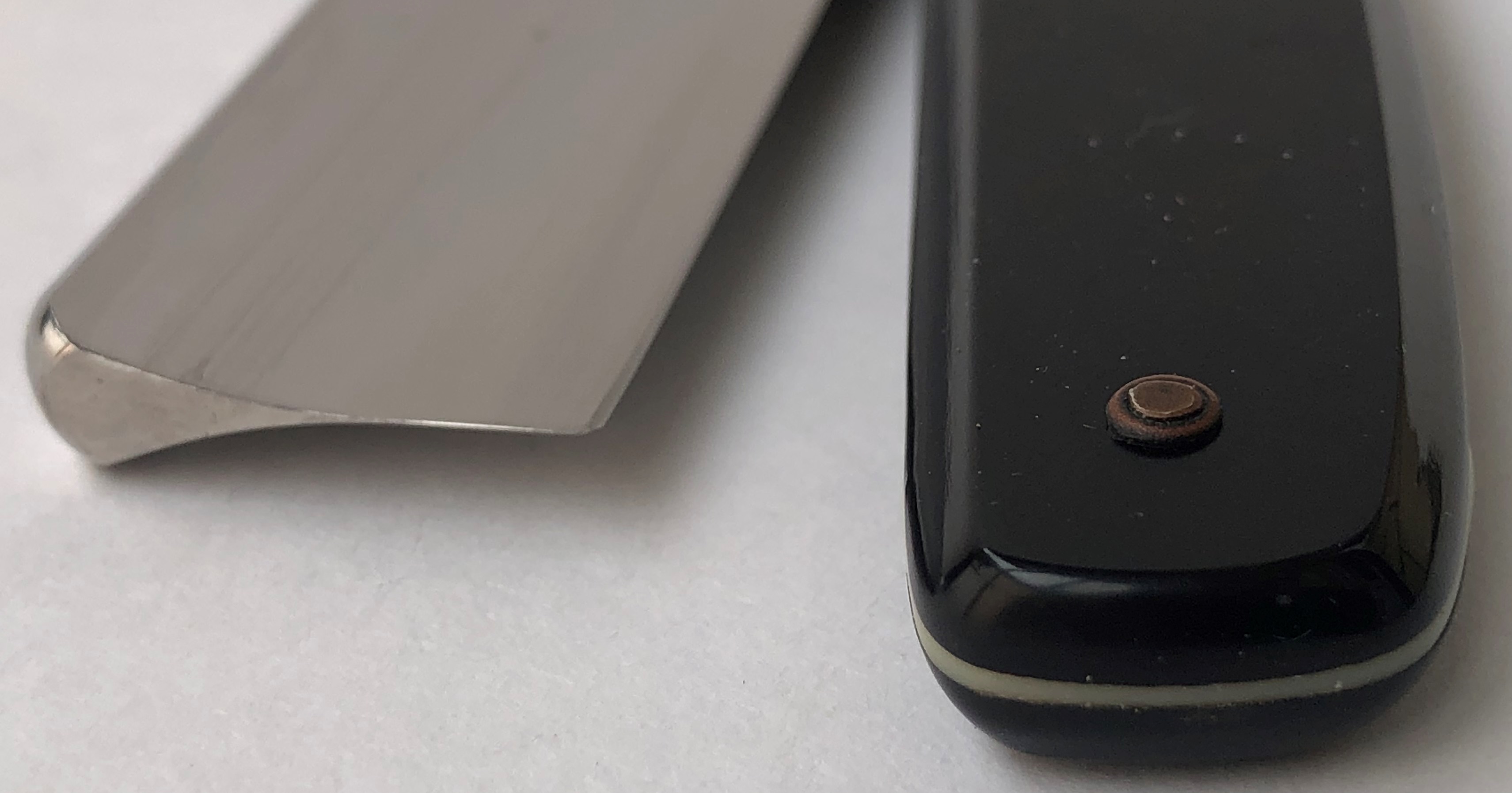 Ширина полотна-17.0 мм. Толщина обушка-4.3 мм. Длина РК-65.0 мм. Форма лезвия ближе к полу-клину. Углеродистая сталь. Барберский вырез. Скорее всего бритва первой половины прошлого века. Компактная и удобная во всех отношениях Ракушка, с прекрасной древней патиной на клинке,которую рука не поднялась вычищать.Поэтому только немного освежил металл полиролью и все.Оставил небольшую и аккуратную утОчку обушка,как дань преклонному возрасту бритвы.К тому же клинок имеет идеальную геометрию:кромочка равномерна по всей длине.Ручка сохранилась прекрасно. Немного полирнул ее тоже,после чего она снова заиграла прежними красками.. . Новые двух-цветные втулки и внутренние шайбы. В итоге получилась отличная Ракушка,совершенно недорогая, но с отличной сталью и,думаю,что в бритье тоже не должна разочаровать.. Да и просто красивая,старинная бритва, так что не пропустите! Заточена и готова к бритью. Цена-6550 р с доставкой.color=#FF0000]ПРОДАН [/color] Spoiler Show Spoiler Show