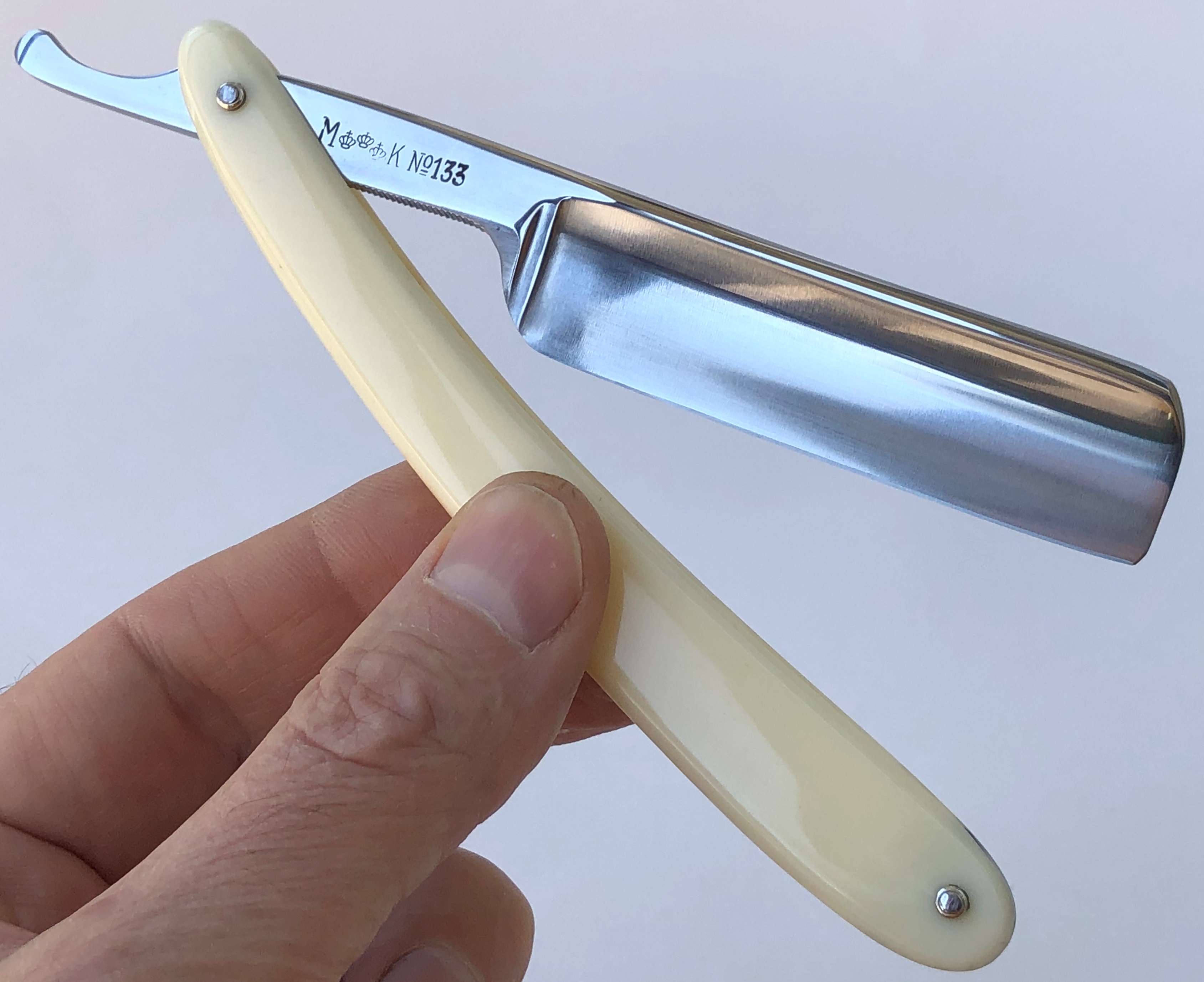 Ширина полотна-18.3 мм. Толщина обушка-4.5 мм. Полная вогнутость. Углеродистая сталь. Бритва совершенно новая и была заточена мной впервые. Ничего не разбиралось и не ремонтировалось.Только немного полирнул 80 летний клинок,чтобы немного вернуть ему былой блеск. Бритву сначала хотел оставить в своей коллекции,но посмотрел,что такая у меня уже есть,поэтому есть возможность стать обладателем достаточно редкой вещи "сталинского" времени.Идеальная геометрия полотна:кромочка равномерна по всей длине и еле заметна.Осевой пин немного подтянул,чтобы клинок не болтался,как обычно они болтаются на новых бритвах. Бритва заточена и готова к бритью. Не пропустите отличную коллекционную бритву ! Цена-12500 р с доставкой. Внимание! Важная информация! Spoiler Show