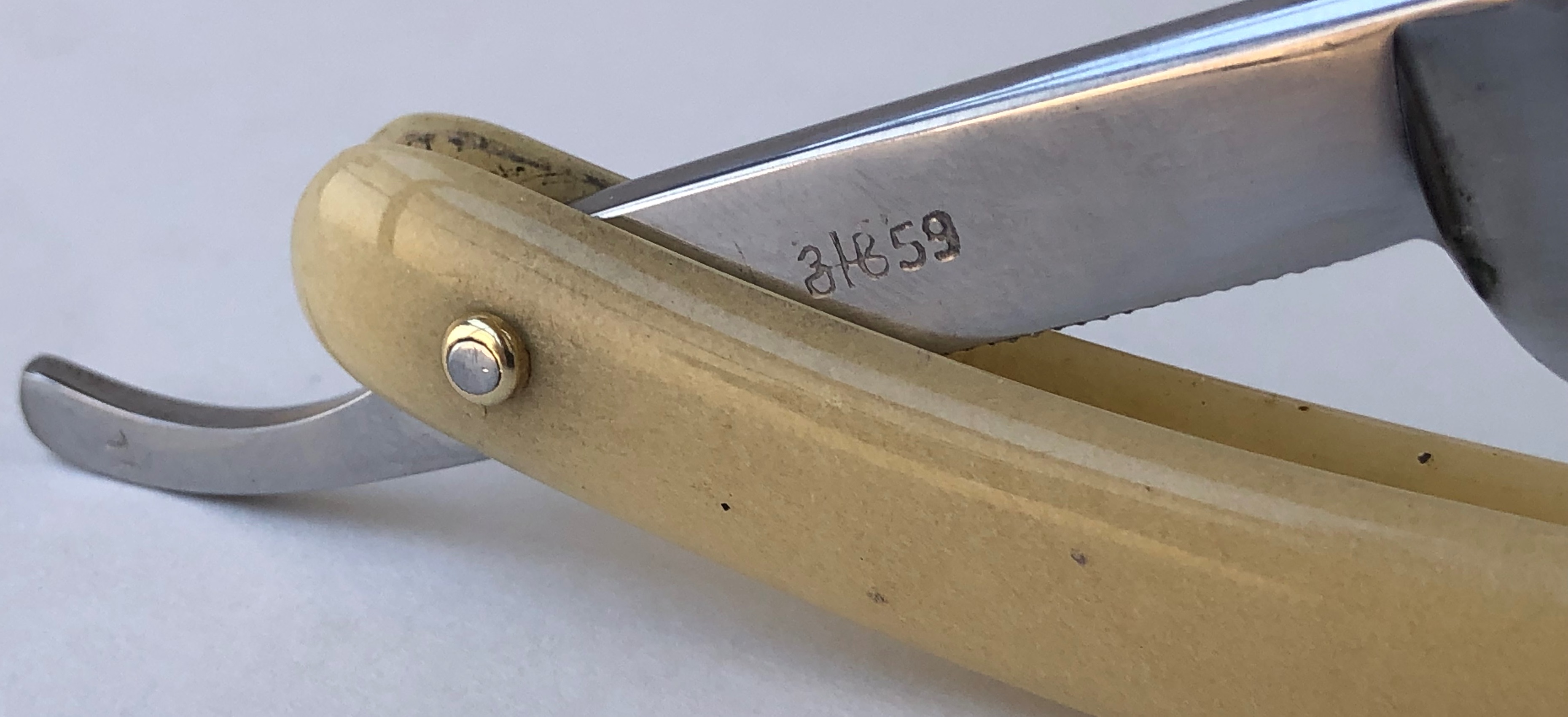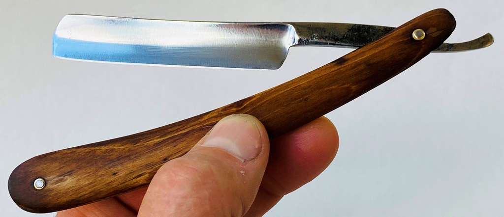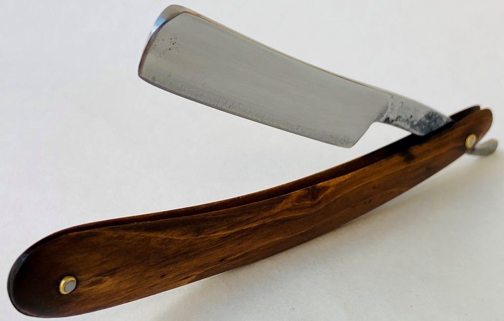 Бритва в пользовании не была,но требовала косметических работ.Минимальная шлифовка и полировка клинка. Геометрия на уровне.Новые втулки, с добавлением внутренних шайб.Родная ручка имеет "рисунок" желтоватого оттенка,по всей видимости заводского происхождения.Заточена и готова к бритью.