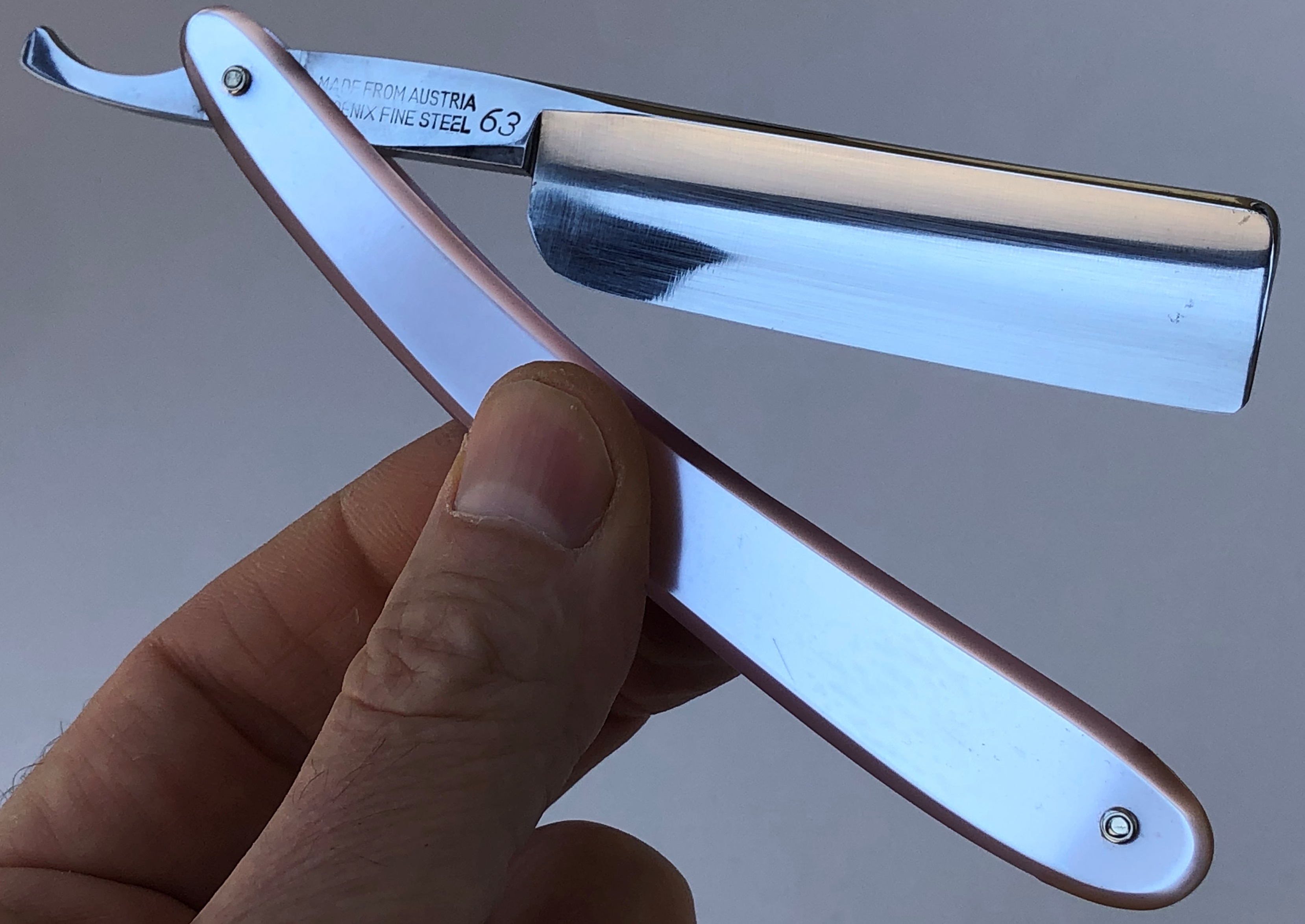 Бритва хоть и была в пользовании,но находится в хорошем,рабочем состоянии. Немного откорректировал утОчку обушка с обратной стороны полотна,а лицевую только немного аккуратно почистил,где достал,чтобы не затронуть родное травление.Шлифовка и полировка клинка ближе в зеркальному,как и должно было бы быть для подобных бритв.Осевой пин был переустановлен заново,с добавлением внутренних шайб.Мощная,родная трёх-пиновая ручка находится в очень хорошем состоянии,без дефектов.Идеальная геометрия клинка:кромочка равномерна по всей длине. Как известно,тут присутствует достаточно твёрдая сталь,так что бритва прежде всего предназначена для барберов,либо для тех,у кого достаточно жёсткий волос. Сталь тут хоть и твёрдая,но всегда шла высококачественной,без исключений.
