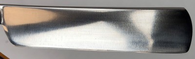 Изготовлена традиционным способом,из двух частей. Немного освежил клинок с обратной стороны. Сторона "УРА" осталась нетронутой. Минимальная полировка,не считая "зеркального" обушка.Бритва достаточно тяжёлая,потому что размер почти 7/8. Очень красивая и мощная бритва, так что не пропустите, кто хочет попробовать японскую классику в деле..