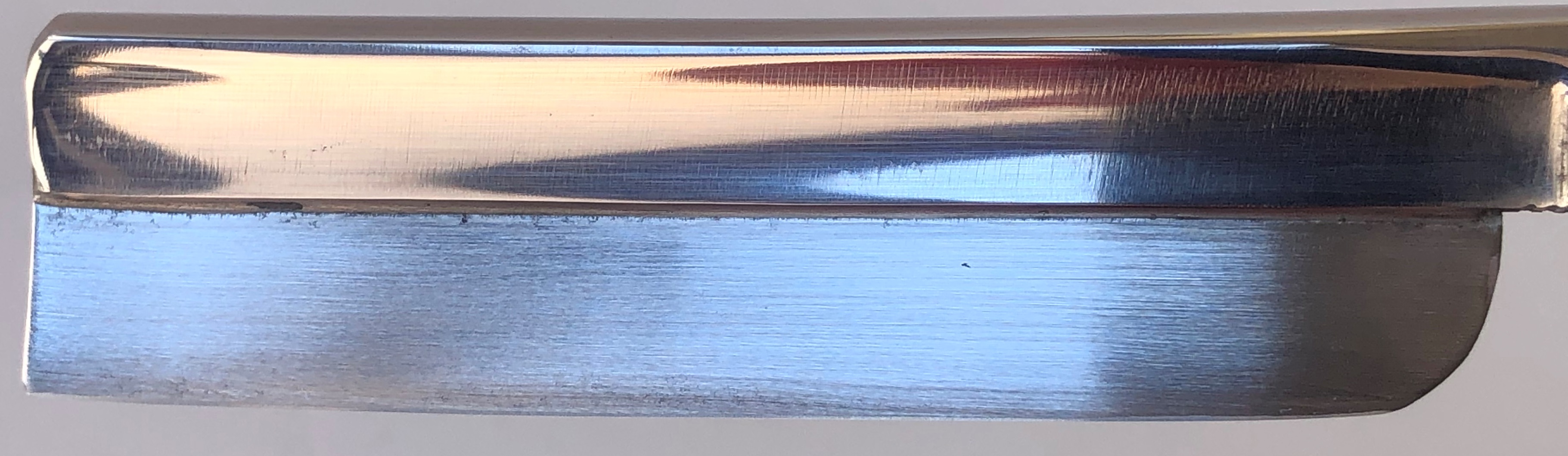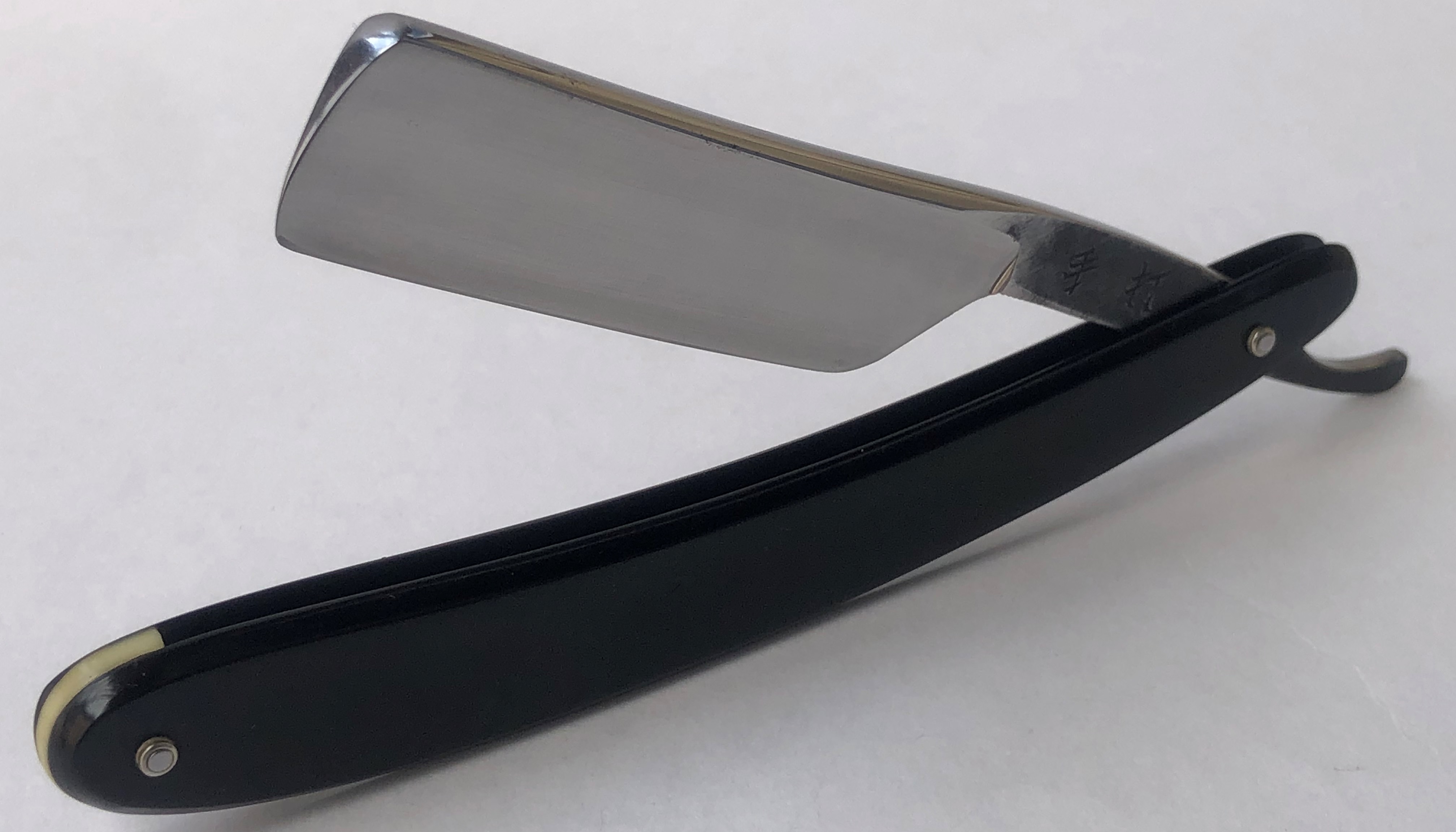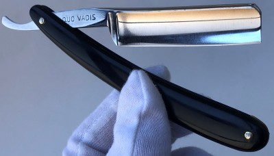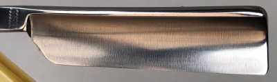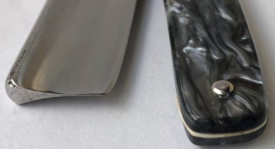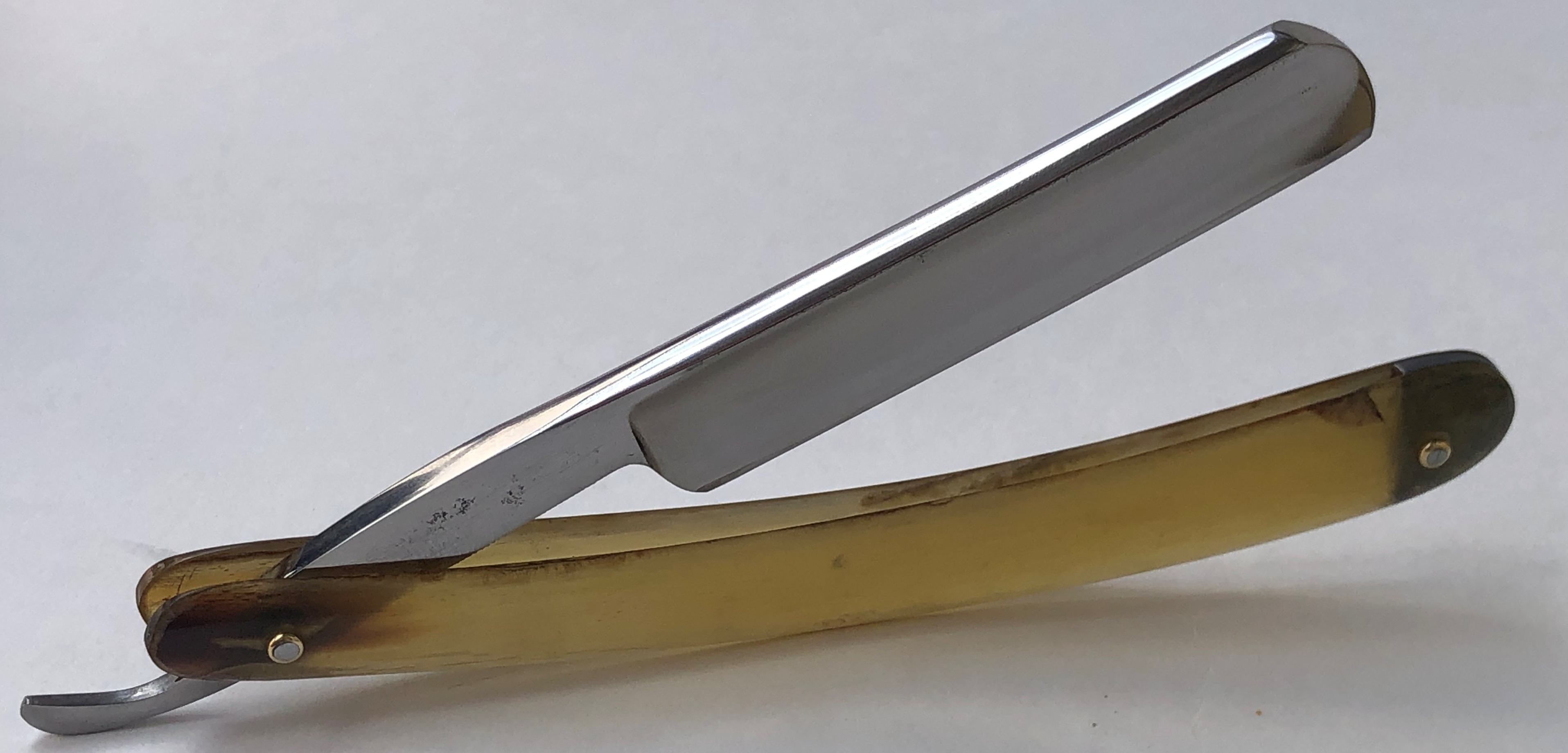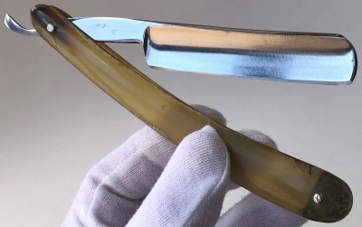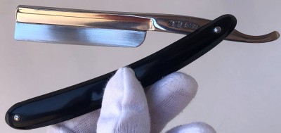 Бритва была разобрана, клинок по мере возможности приведён в порядок.Умеренная полировка. Кромочка немного широковата,но почти равномерна по всей длине полотна.Новые двух-цветные втулки и внутренние шайбы. Родная роговая оправа в хорошем состоянии,без критичных дефектов,но нужно сделать скидку на преклонный возраст материала.Но, внешних расслоений, трещин и разгрызанных мест нет.Удобная форма лезвия клинка. Бритва достаточно тяжёлая.