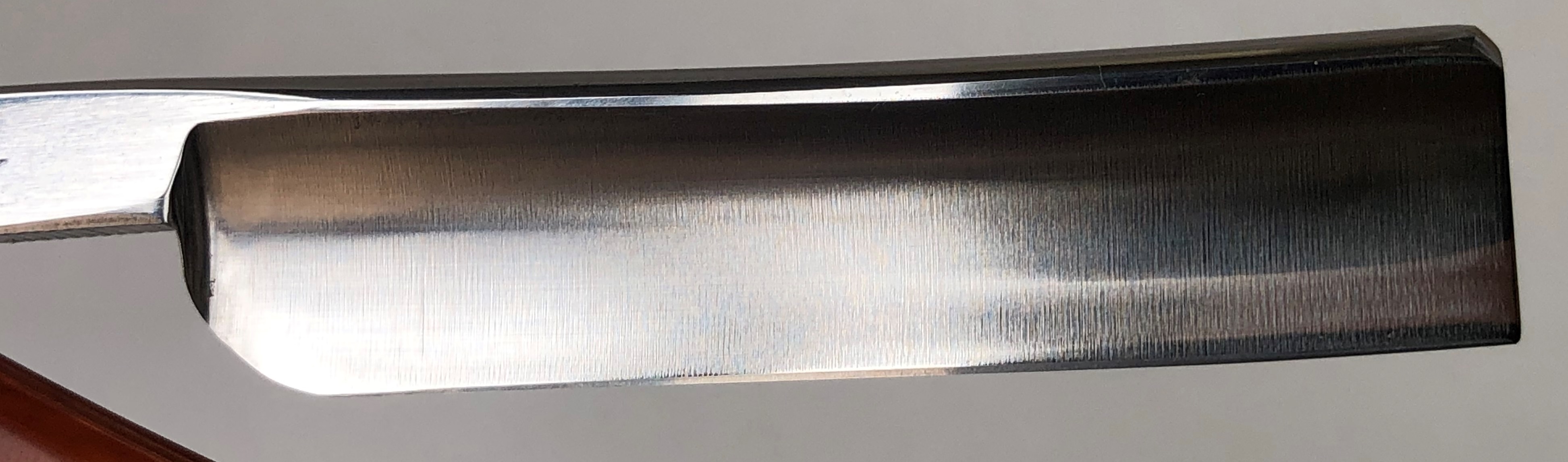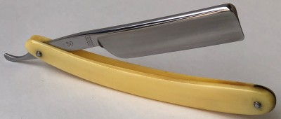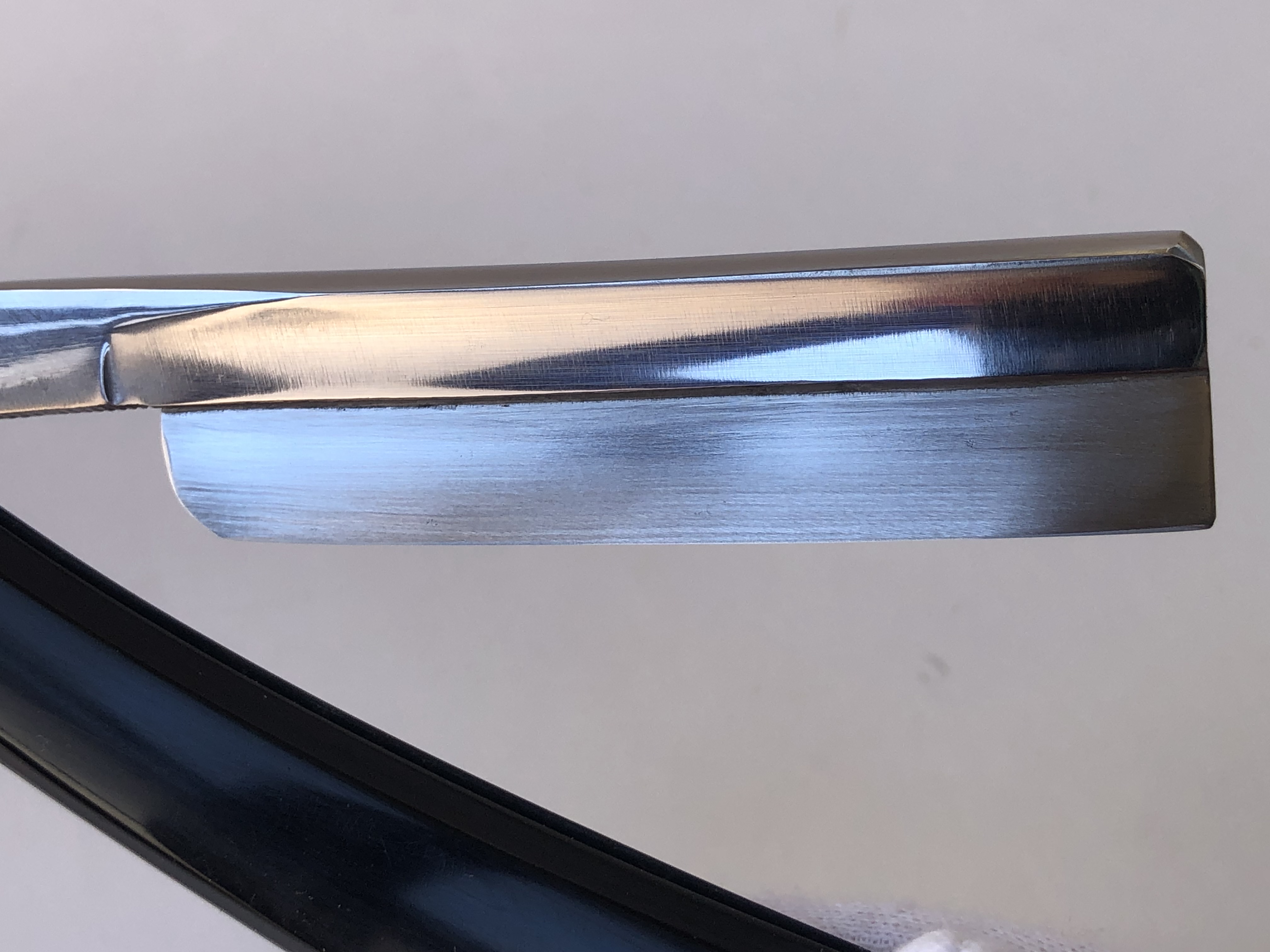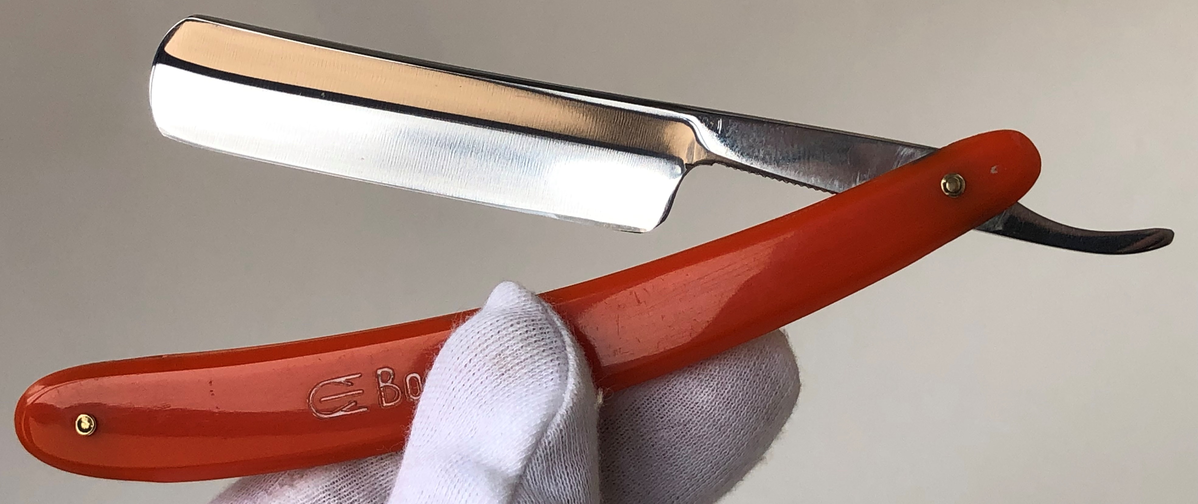 Бритва была разобрана, клинок по мере возможности приведён в порядок.Умеренная полировка. Кромочка немного широковата,но почти равномерна по всей длине полотна.Новые двух-цветные втулки и внутренние шайбы. Родная роговая оправа в хорошем состоянии,без критичных дефектов,но нужно сделать скидку на преклонный возраст материала.Но, внешних расслоений, трещин и разгрызанных мест нет.Удобная форма лезвия клинка. Бритва достаточно тяжёлая.
