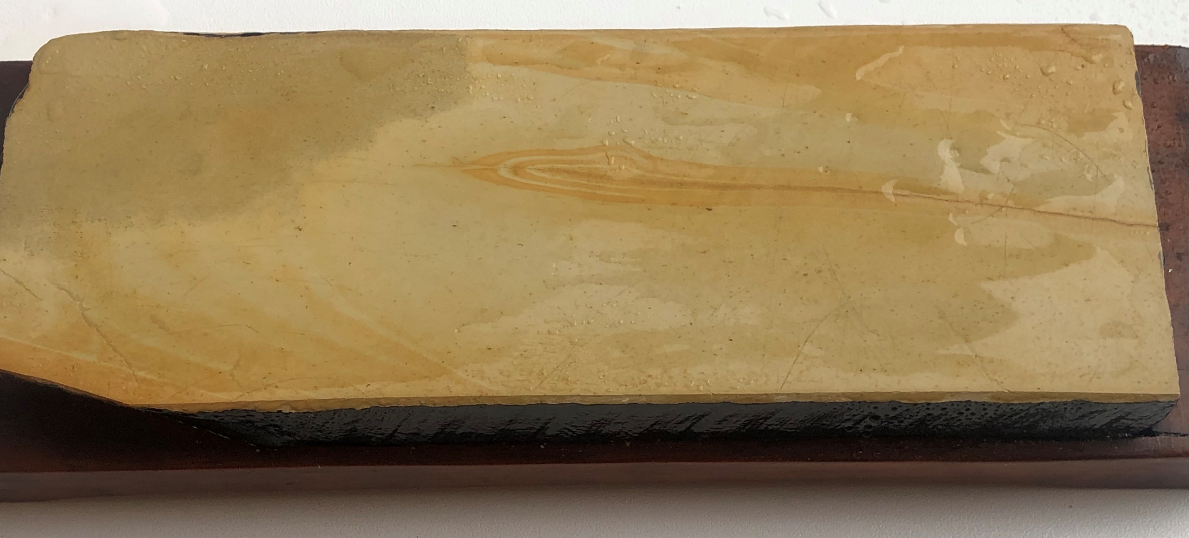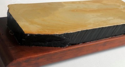 Камень из старой японской парикмахерской.Высокого качества.Притерт. Очень твердый и практически не выдаёт собственной суспензии, но прекрасно работает с Асано нагурами разной зернистости. Очень тонко работает, быстро выглаживается и начинает "зеркалить". Фирменный характер торцевого распила. Торца и обратная сторона покрыты лаком в три слоя.Родная деревянная подставка приведена в порядок и покрыта датским маслом, для красоты.