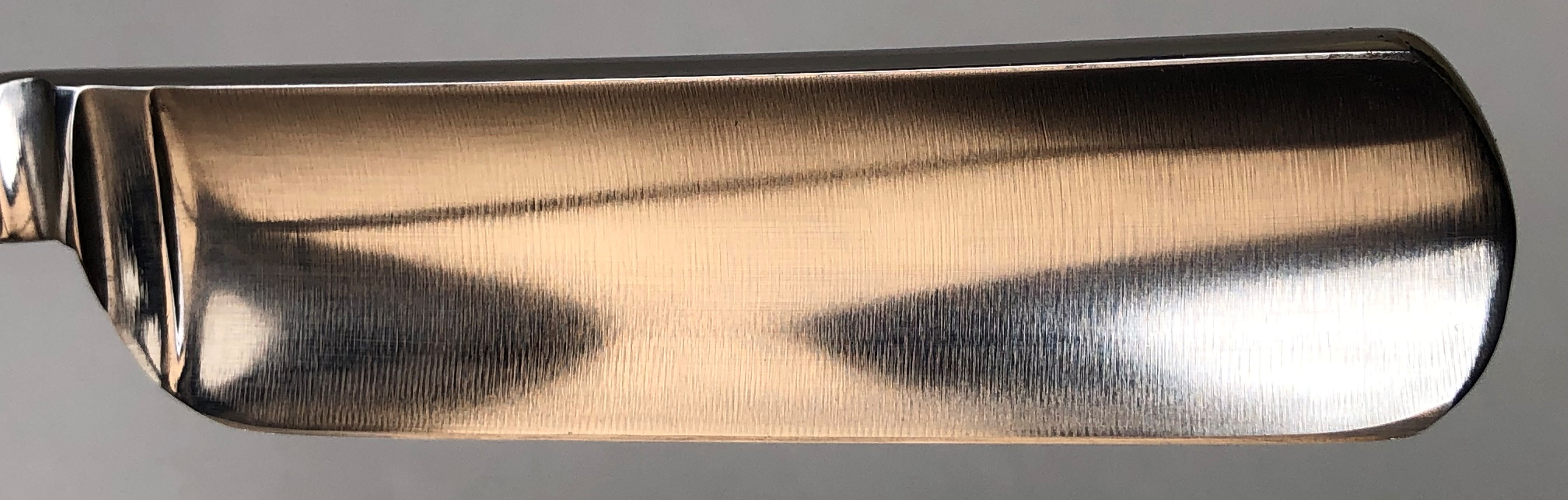 Данный экземпляр сохранился в прекрасном состоянии и по всей видимости, до последнего времени была заточена не более 1-2 раз,судя по практически незаметной "площадке" на обушке от заточных камней. Оригинальная шлифовка и полировка самого полотна! Четкая и нетронутая гравировка. Бритва была разобрана для удаления окисления в районе осевого пина, а также замены родных пинов на более практичные двух-цветные втулки, с добавлением внутренних шайб.Идеальная геометрия клинка:кромочка равномерна по всей длине и еле заметна.