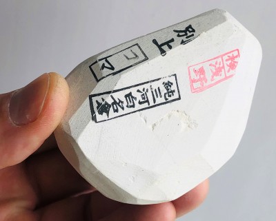 Тут можно сделать две вещи:либо все оставить как есть,при работе просто " не заступая" за границы пятна,благо размеры позволяют, либо распилить его на части, примерно 6 см от стороны пятна и получить обычный финишный наладонник, примерно стандартного размера. А оставшуюся часть камня использовать в качестве томо-нагуры, либо для чистки синтетиков от засаливания.