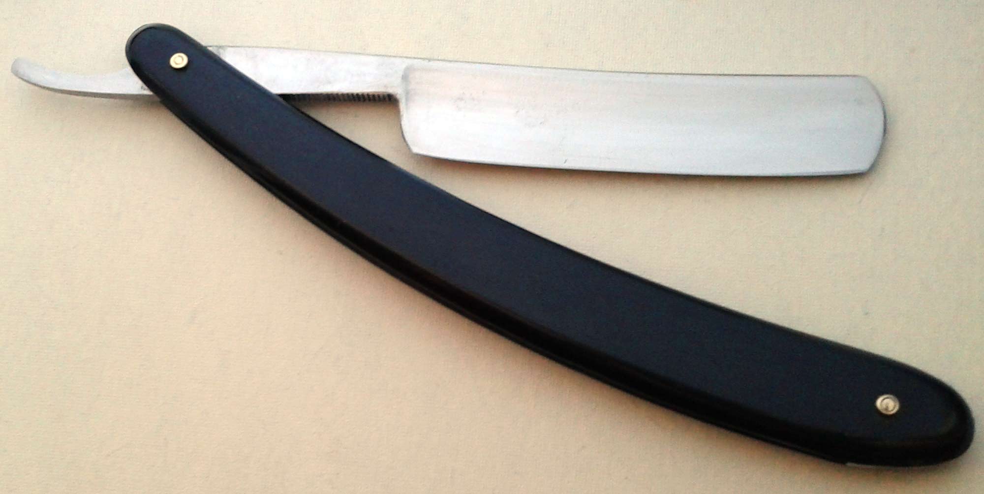 Сведения о производителе: http://britva.ru/forum/viewtopic.php?f=28&t=1663" onclick="window.open(this.href);return false; Ручка - эбонит, в приличном состоянии, клинышек из металла. По-видимому, ручка и пины родные. На полотне присутствуют небольшие "следы времени". Заточена и полностью готова к бритью. Ширина полотна 16,5 мм, толщина в обушке 4,5 мм. Цена 60 евро, доставка включена. Spoiler Show