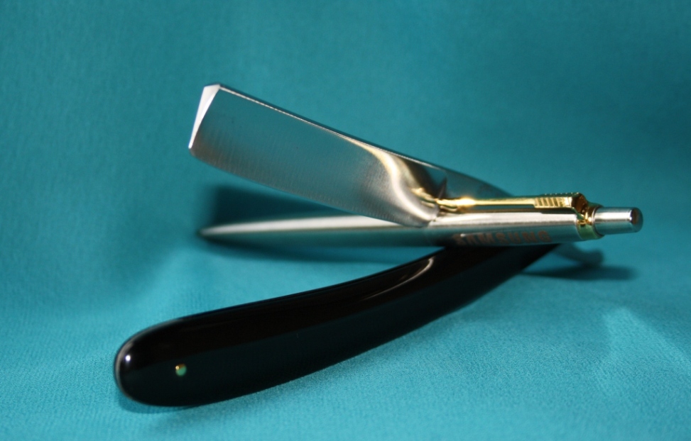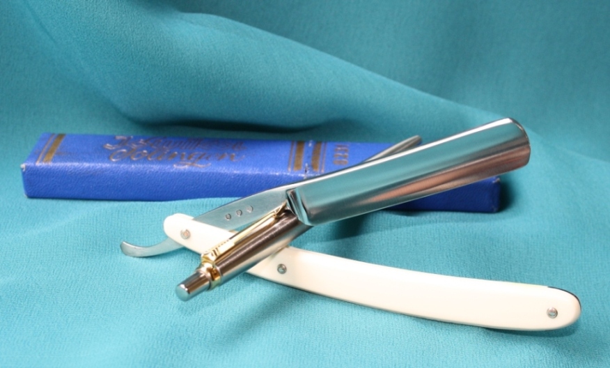 Производитель: J.A.Henckels. Twin Works. Solingen. Germany. Model 415 Размер: 5/8 ( а точнее ширина 16.5 мм.) Состояние: минимальное б.у., сохранность очень приятная, заточена и готова к бритью. Ручка из пластика, перламутровая, с медными наконечниками, одним словом -красивая. Цена: проданы близнецы Henckels Show
