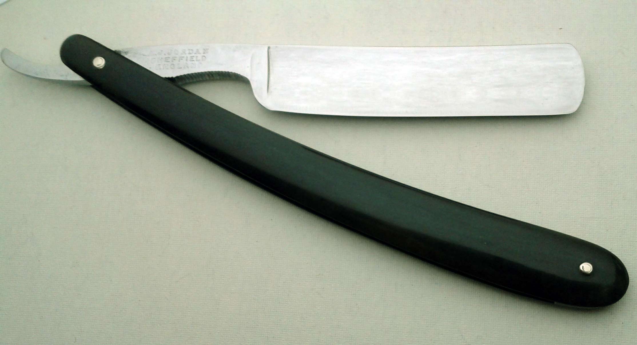 Spoiler Show Дальнейшая надпись читается плохо, но можно предположить что-то типа POND WORKS, SHEFFIELD. Надпись на полотне ROXO Сведения о производителе: http://britva.ru/forum/viewtopic.php?f= ... ers#p50963" onclick="window.open(this.href);return false; Ручка - натуральный рог в хорошем состоянии. Клинышек - металл. Свинец/олово клинышка окислилось и имеет неровности, однако свою функцию выполняет исправно. По-видимому, ручка, клинышек и пины родные. Заточена и полностью готова к бритью. Ширина полотна 16.5 мм, толщина в обушке 4.5 мм. Цена 70 евро, доставка включена.