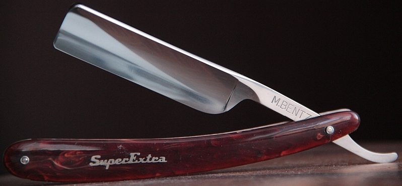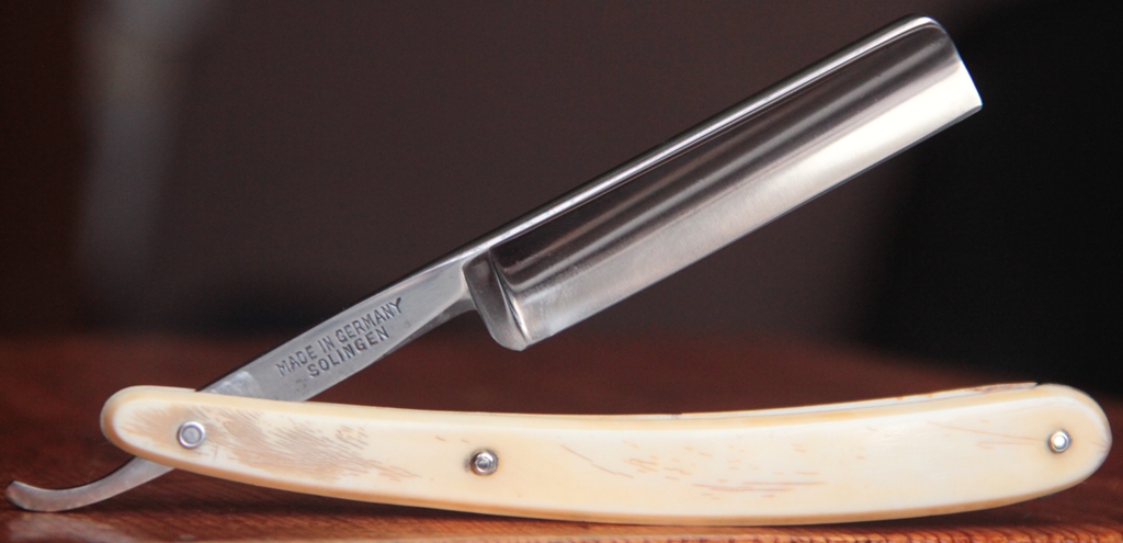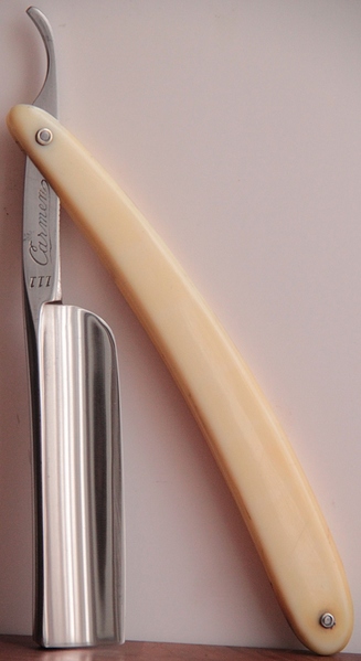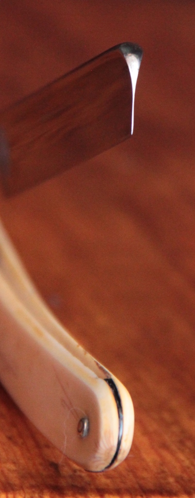 Совершенно нетронутая бритва ни временем, ни заточными камнями. Как по мне, так не только исключительная по красоте бритва, но также и отличный инструмент в опытных руках. Прекрасное, мягкое бритьё. Проверено не раз.
