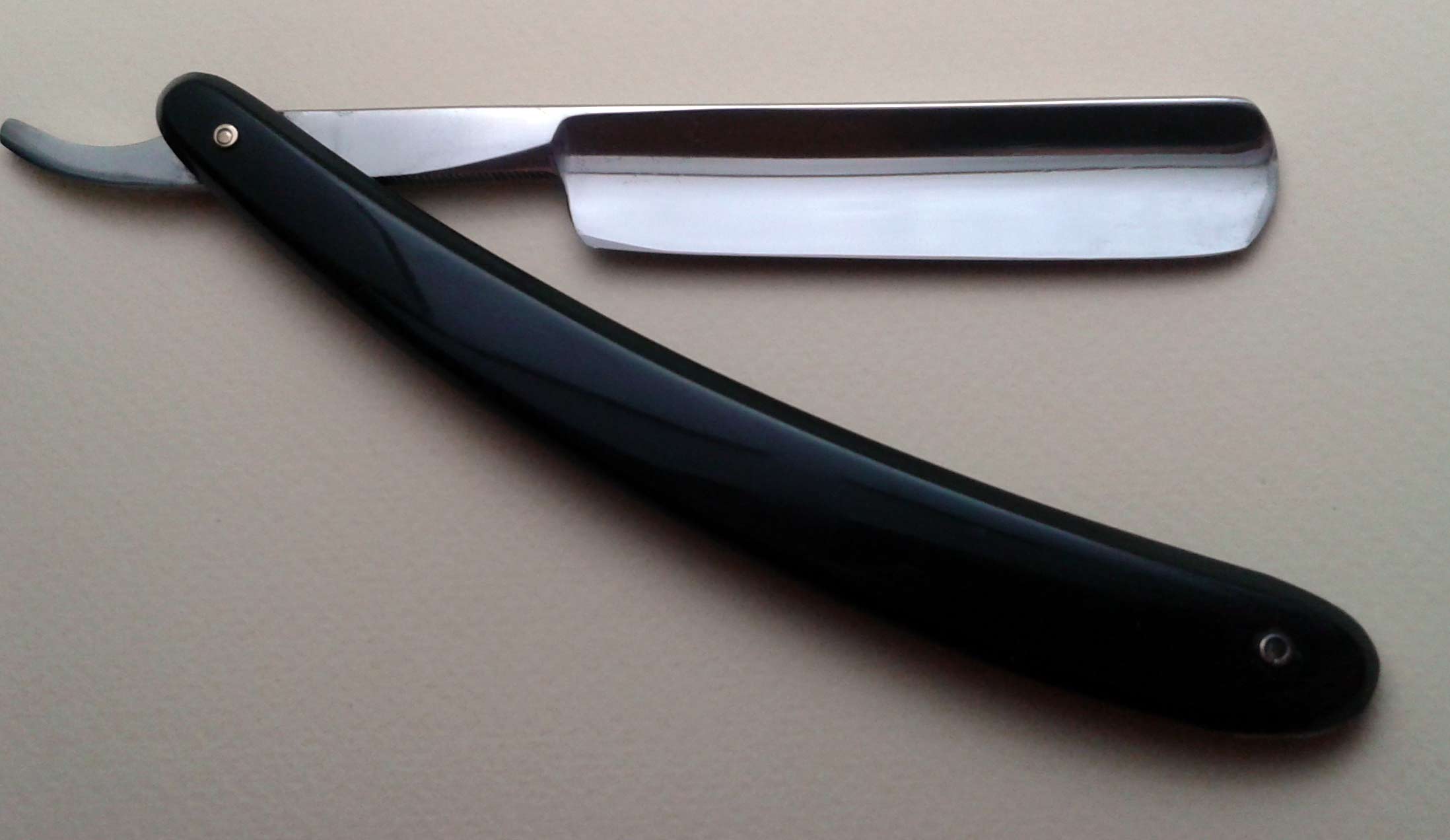 Довольно старый холлоу граунд - по форме хвостовика и надписи можно говорить о конце XIX-начале XX века. А если судить по инфе из http://britva.ru/forum/viewtopic.php?f= ... ilit=Allen" onclick="window.open(this.href);return false;, то бритва произведена до 1890 года. Ручка - эбонит, в отличном состоянии, есть коричневый "налет времени", клинышек - металл. Заточена и полностью готова к бритью. Ширина полотна 19 мм, толщина в обушке 5 мм.