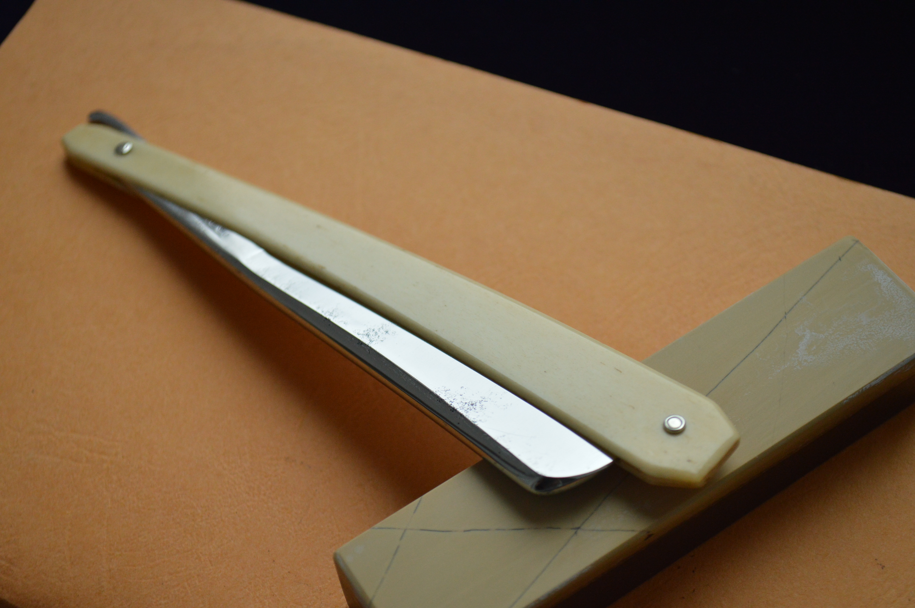 Бритва в строение клин. Ширина полотна – 7/8. Сама сталь в лучших традициях французских бритв: вязкая, мелко-зернистая, бритье превосходно мягкое и чистое. Ручка кость в замечательнейшем состоянии.