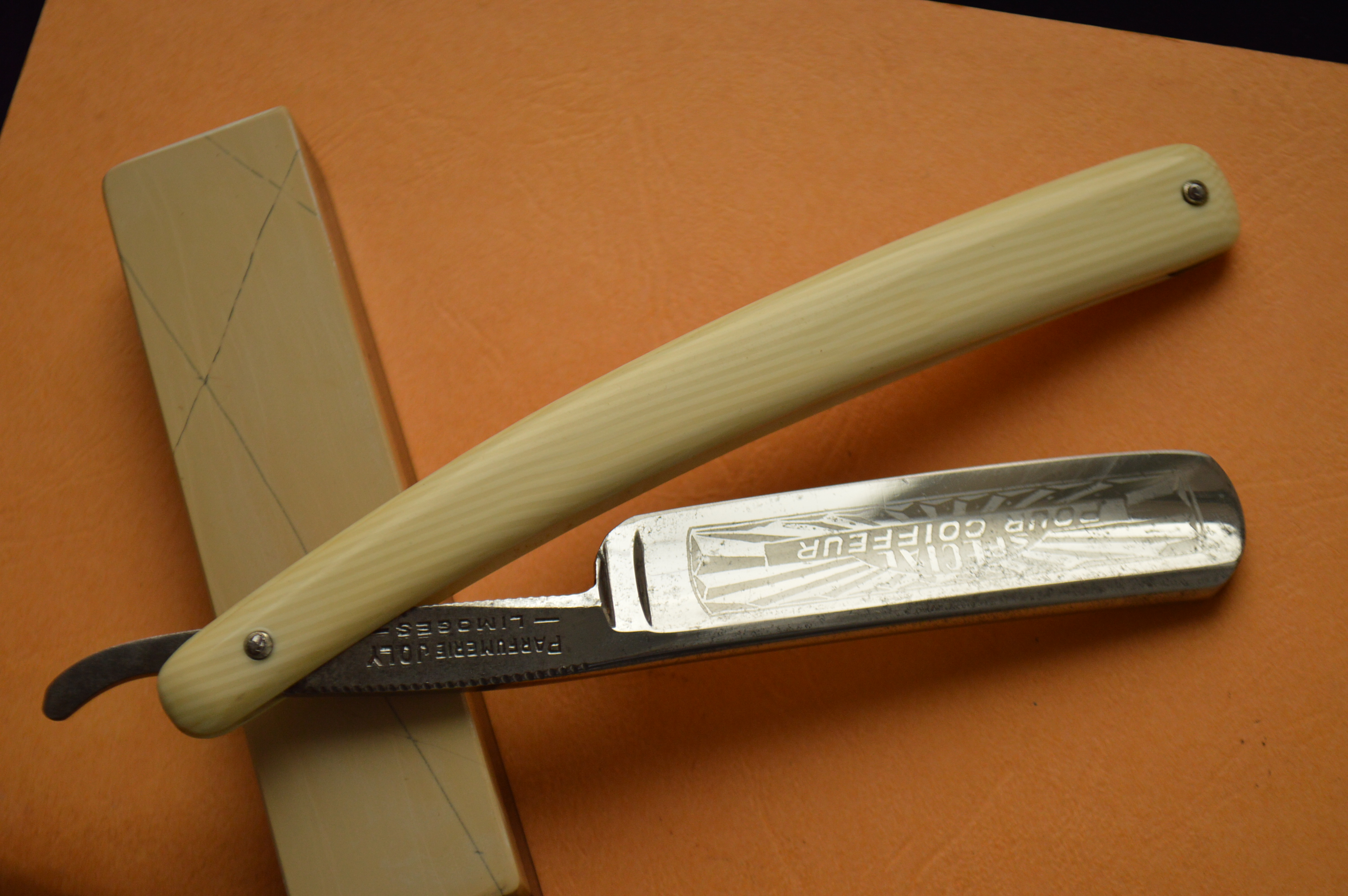 Антикварная французская бритва, сделанная производителем с торговой маркой, которая выбита на эрле с обратной стороны: @130@ для продавца: магазина Parfumerie Joly из видного французского города Лимож Традиционно были развиты коннозаводство, производство фарфора, сукна, полусукна, фланели, полушерстяных тканей, свечей, обуви и т. п. Город был важным складочным местом для товаров, идущих из Парижа в Южную Францию. В XIV—XVIII веках славился лимозинами — эмалированными вещами. Наивысшая точка развития промышленного сектора городской экономики Лиможа пришлась на период с 1850 года по 1930-е годы, о чём свидетельствует создание больших фарфоровых заводов Haviland в 1852 году на месте современного Торгового центра Centre commercial Saint-Martial, а в 1892 году в квартале Mas-Loubier. Последний из этих заводов вскоре стал самой крупной фарфоровой фабрикой в городе, имея к 1907 году, 17 печей и 800 рабочих. Параллельно формированию этих крупных промышленных объектов в Лиможе развивалась сеть малых предприятий по изготовлению фарфоровых изделий, к примеру фабрика Labesse, где в период между 1873 и 1938 годами трудились 90 человек .