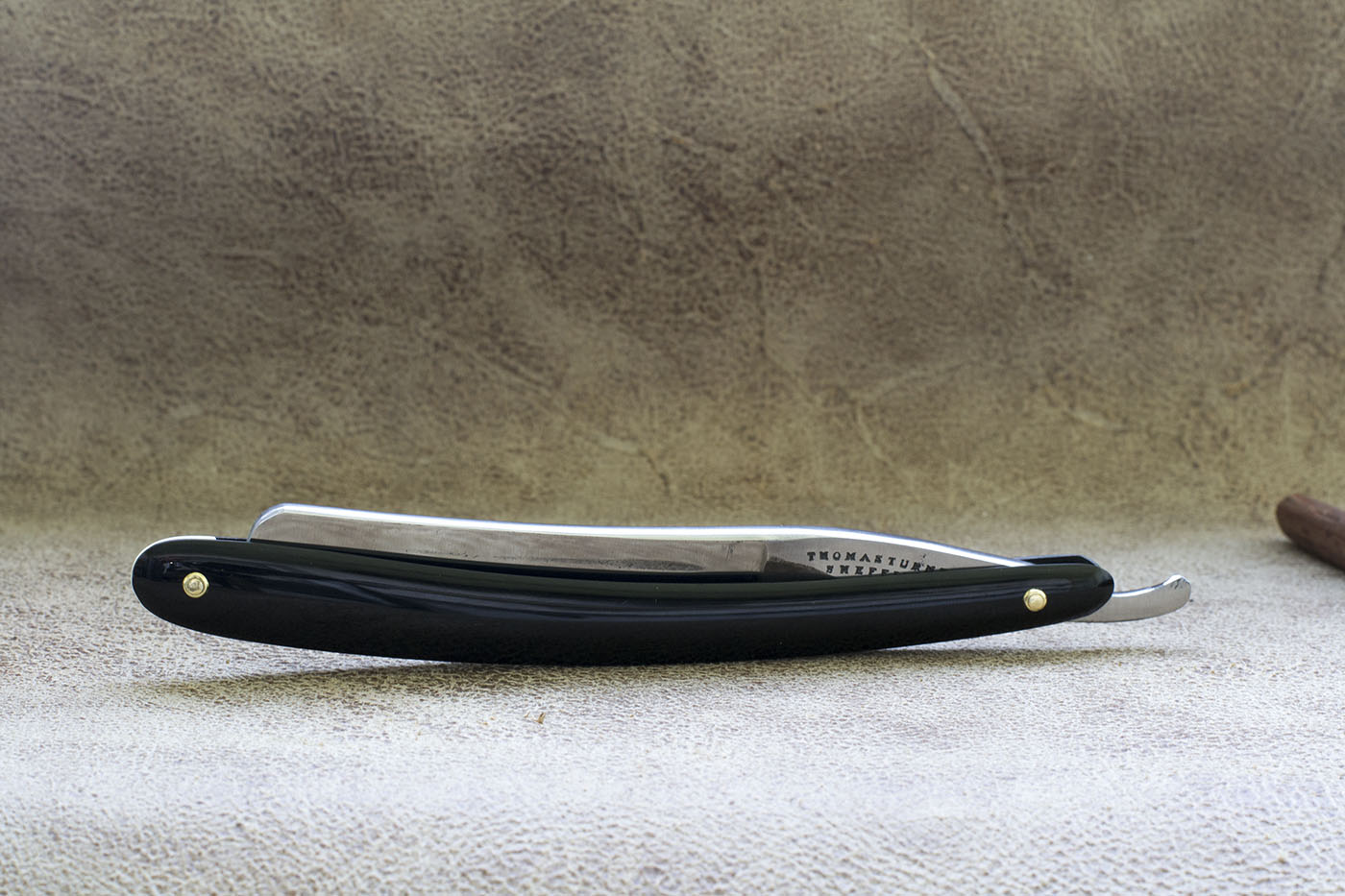 Английский Бенгалл времен Томаса Рэдли Кадмана. Рукоять из рога, протравленного под черепаху, родные латунные шайбы, ширина полотна 5/8 дюйма, клин. Период изготовления конец 19 - начало 20 века. На бритве были некоторые следы от камня на обухе и кромке, я считаю это заводской заточкой, кромка не была сведена и бриться с такой заточкой было невозможно. По сути это NOS бритва, по моим заключениям не находившаяся в использовании. Состояние полотна великолепное, заводской сатин,который намного грубее того что можно встретить на более современных бритвах, видна грубая риска от камня, полотно отполировано мной вручную. Бритва заточена и готова к бритью. Продано Spoiler Show