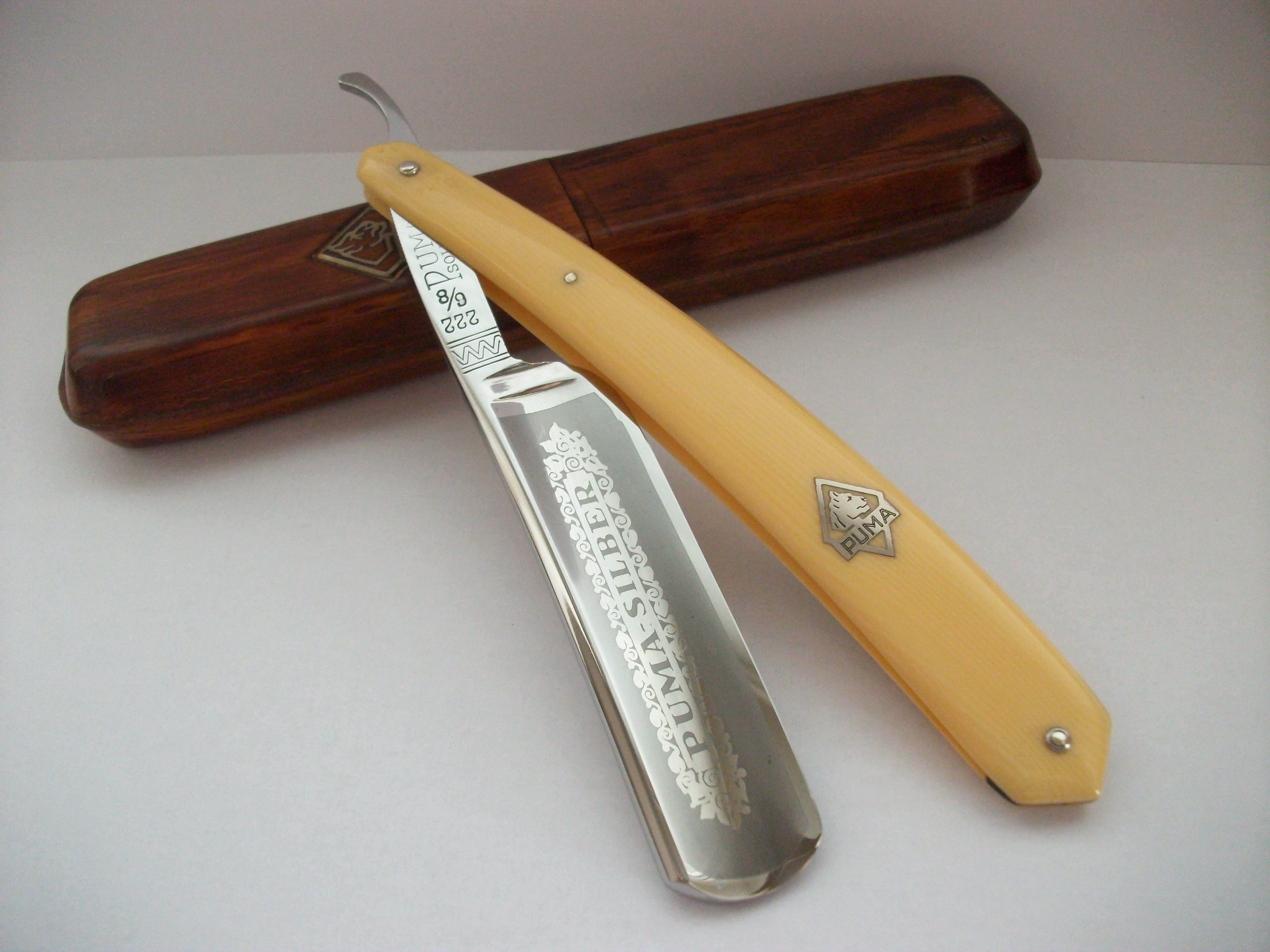 Хорошая бритва от легендарной фабрики Puma-Werk. Углеродистая сталь (на эрле указано Puma steel к сожалению не могу сказать какие особенности она в себе несет), ширина полотна 21мм, длинна режущей кромки 73мм, форма полотна имеет еле заметную улыбку, ручка - целлулоид. В комплекте фирменный футляр. Продано Spoiler Show