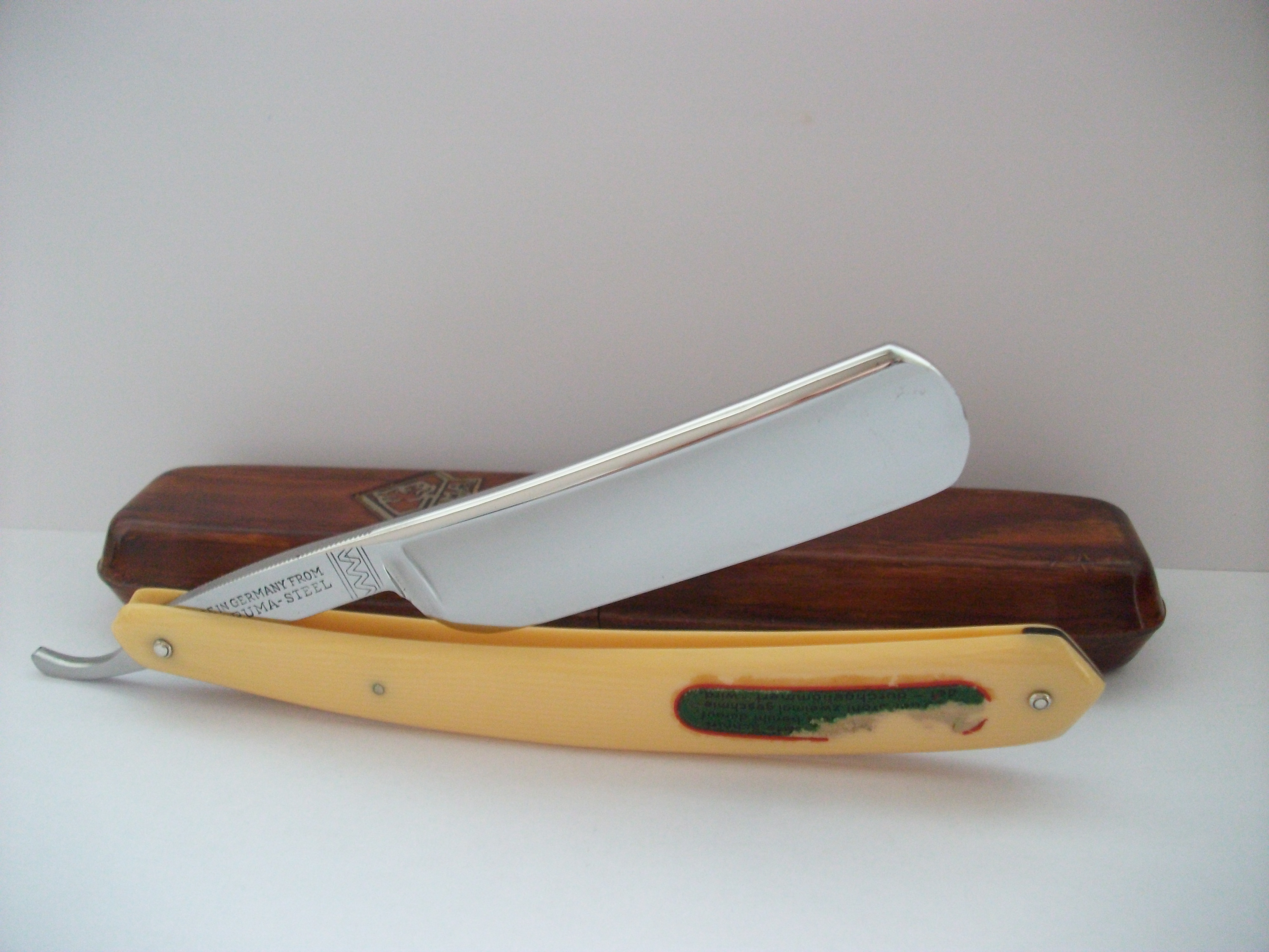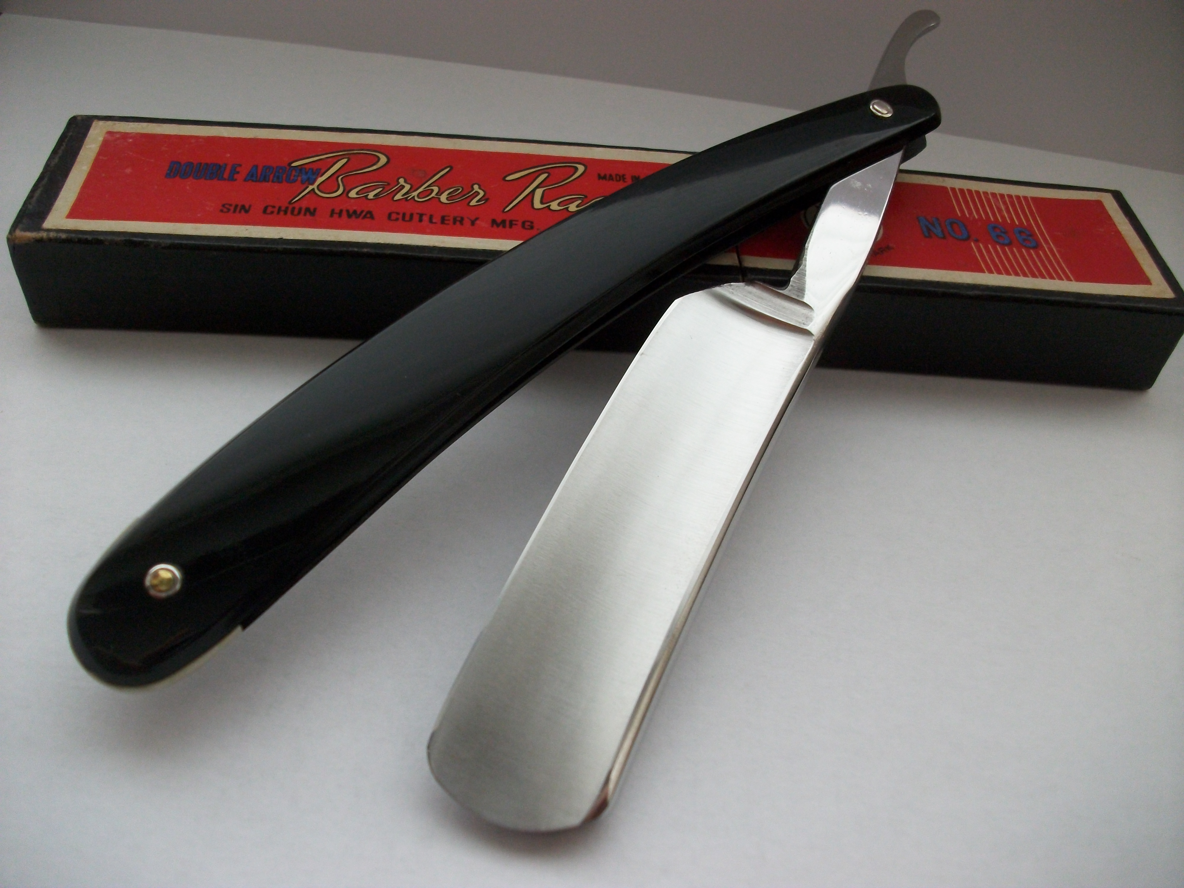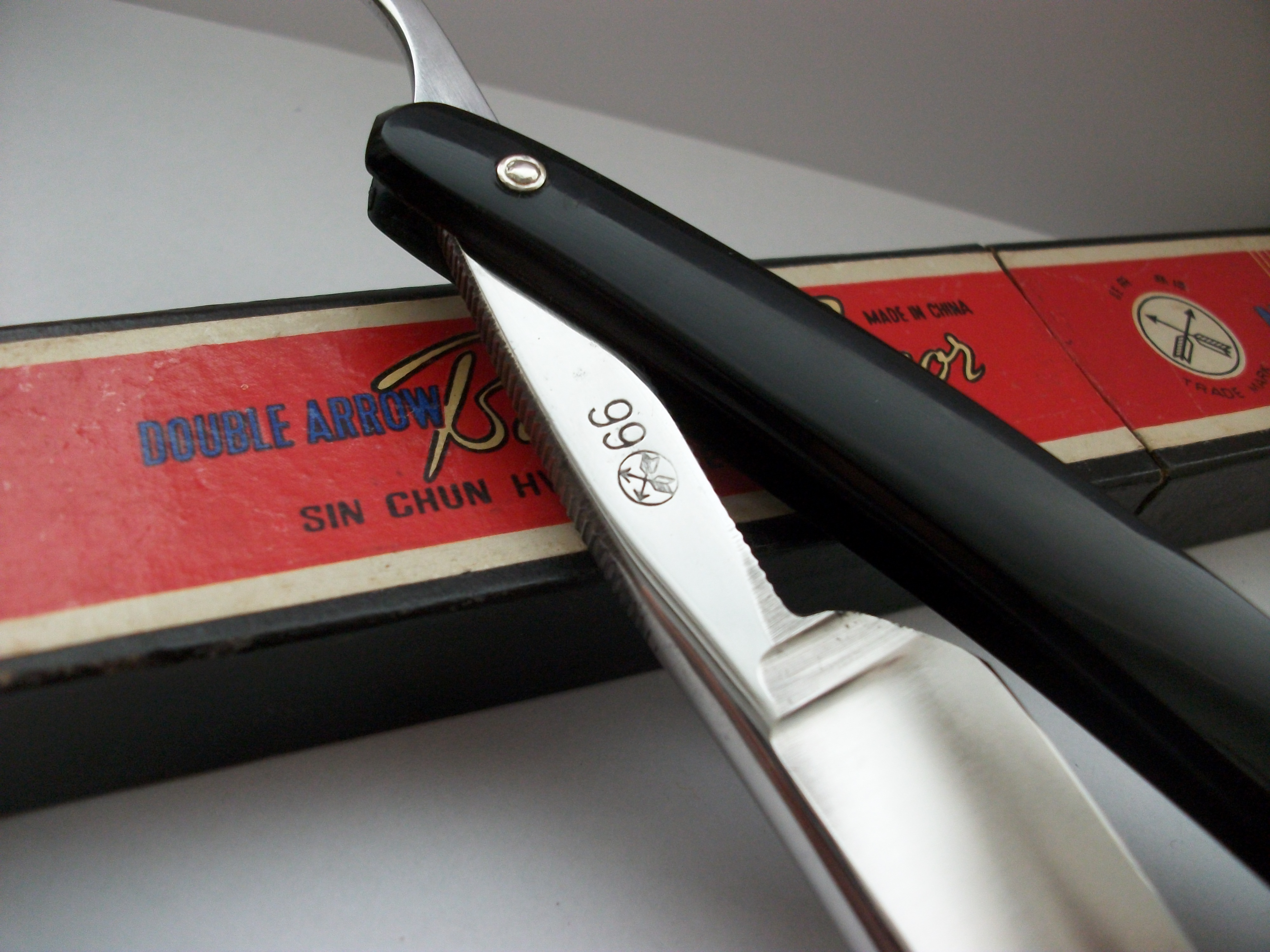 Экземпляр сочетающий такие несовместимые определения как Китай, качество, винтаж... Бритва имеет хорошую геометрию, углеродистая сталь, ширина полотна почти 21мм, длина режущей кромки 68мм, ручка пластик. Примерно 50-70 года ИМХО. Заточена и готова к бритью. Продано Spoiler Show