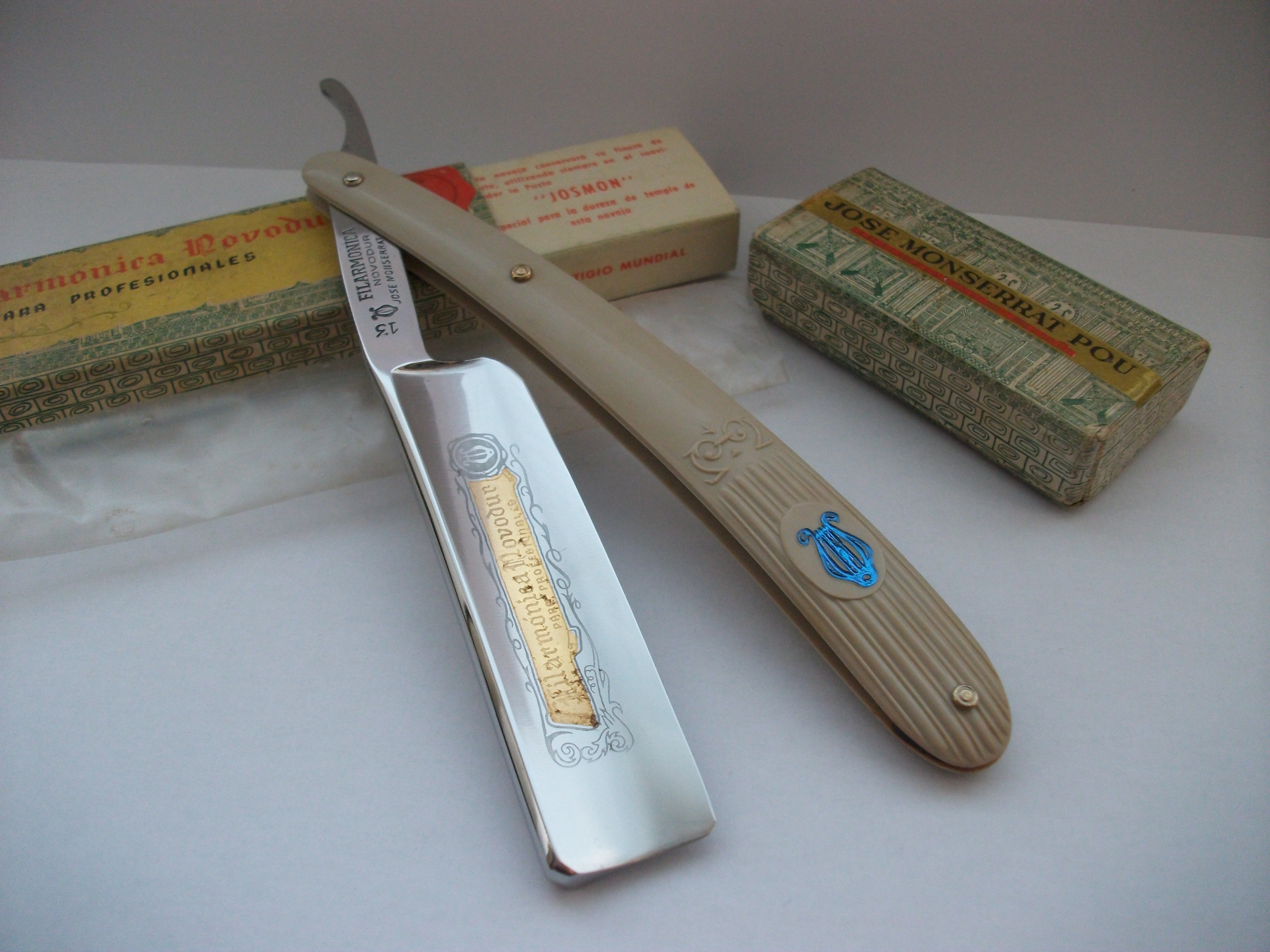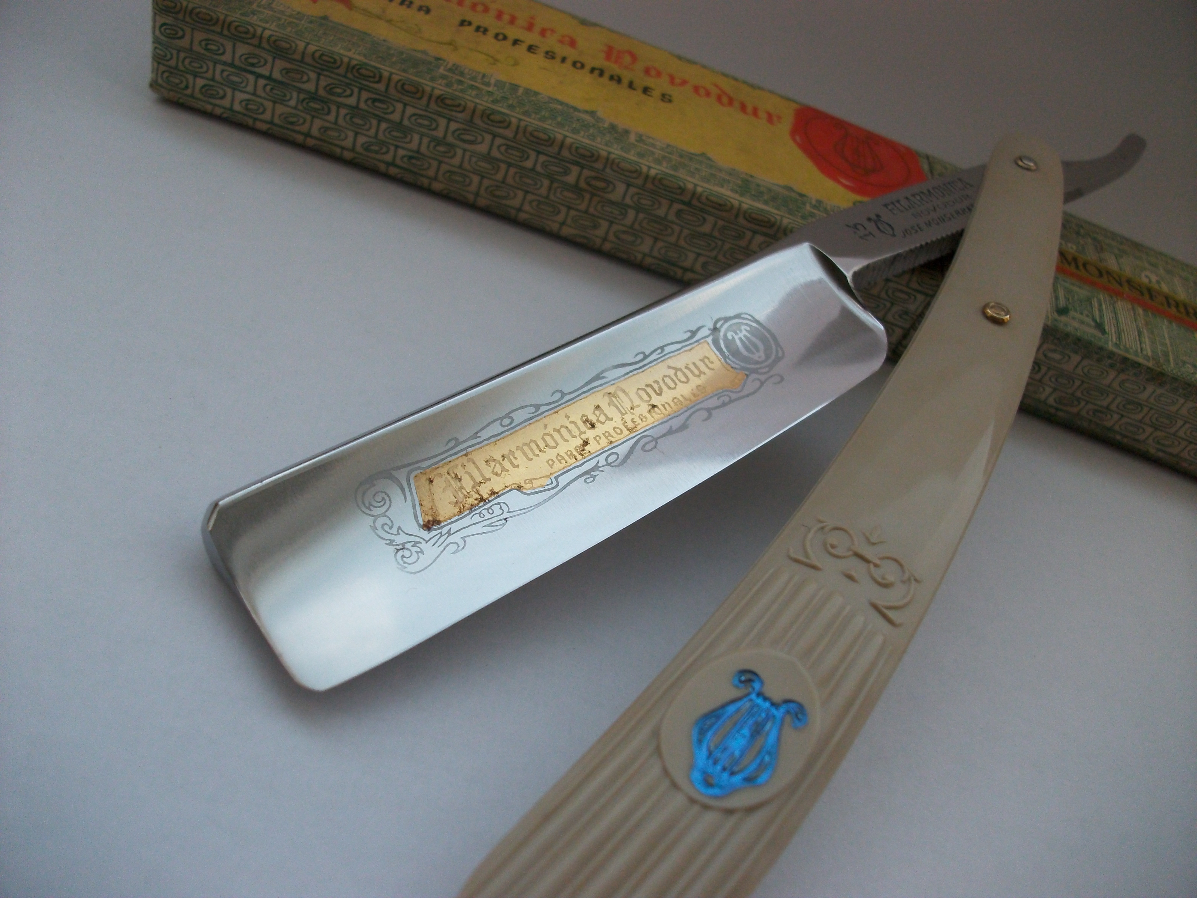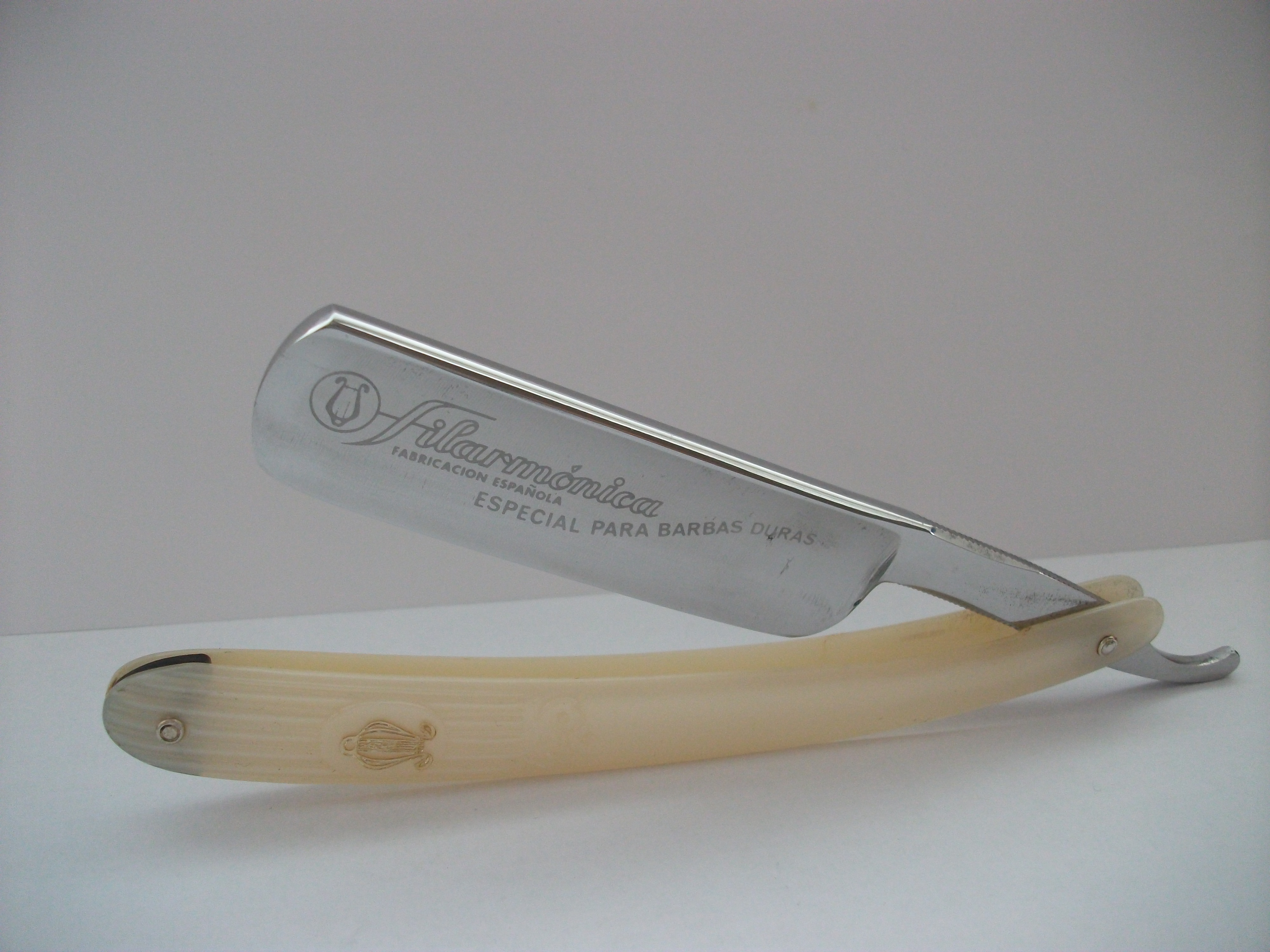 Модель Especial Para Barbas Duras. Углеродистая сталь , ширина полотна 20мм, длина режущей кромки 72мм, ручка - пластик. Бритва должна иметь резинку на эрле, но таковая отсутствует (причем не было даже следов ее присутствия). Снято с продажи. Spoiler Show