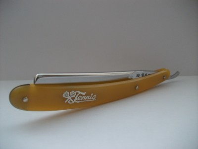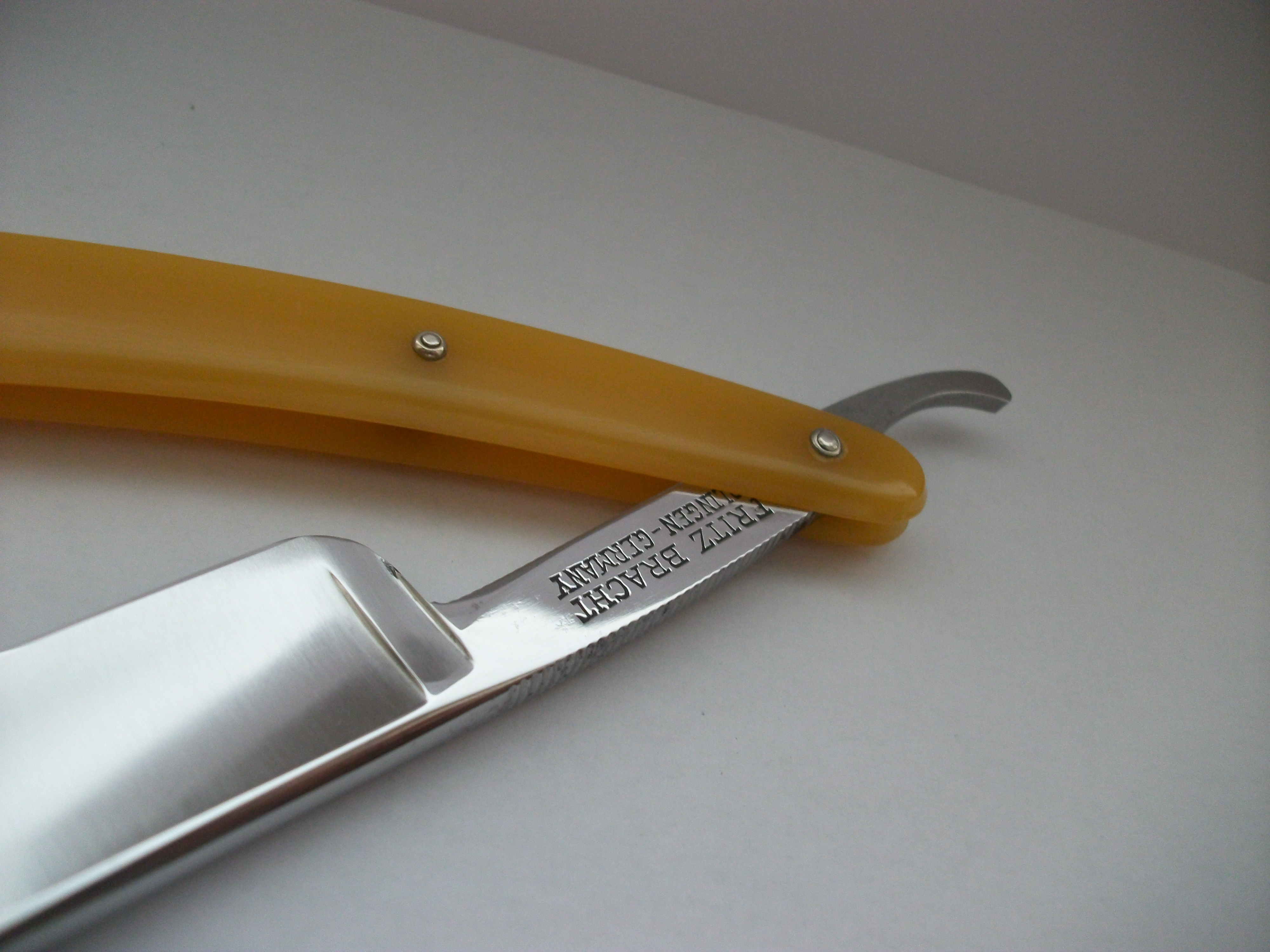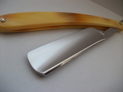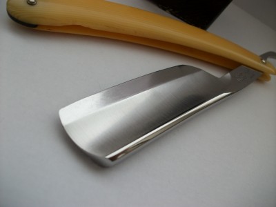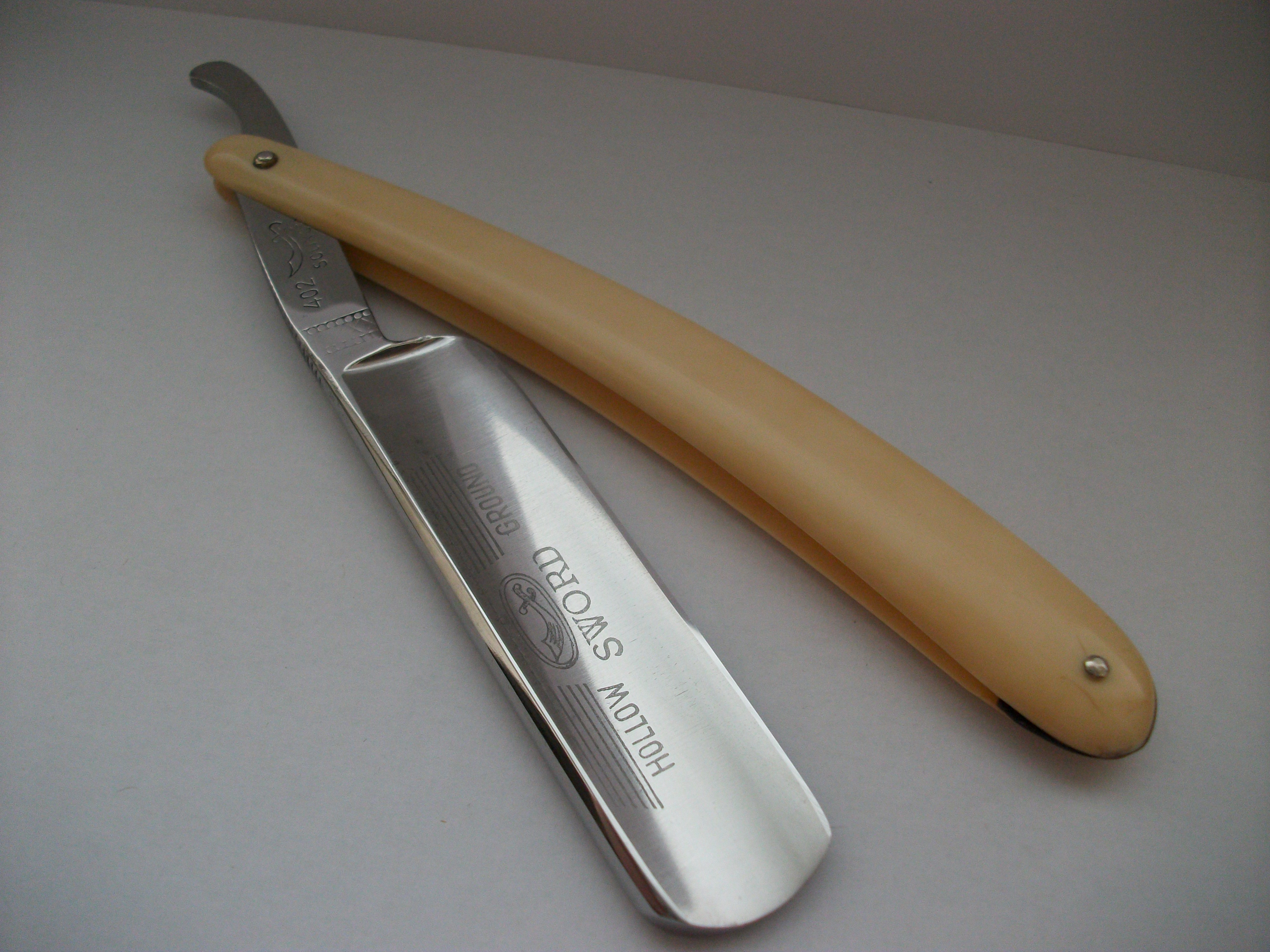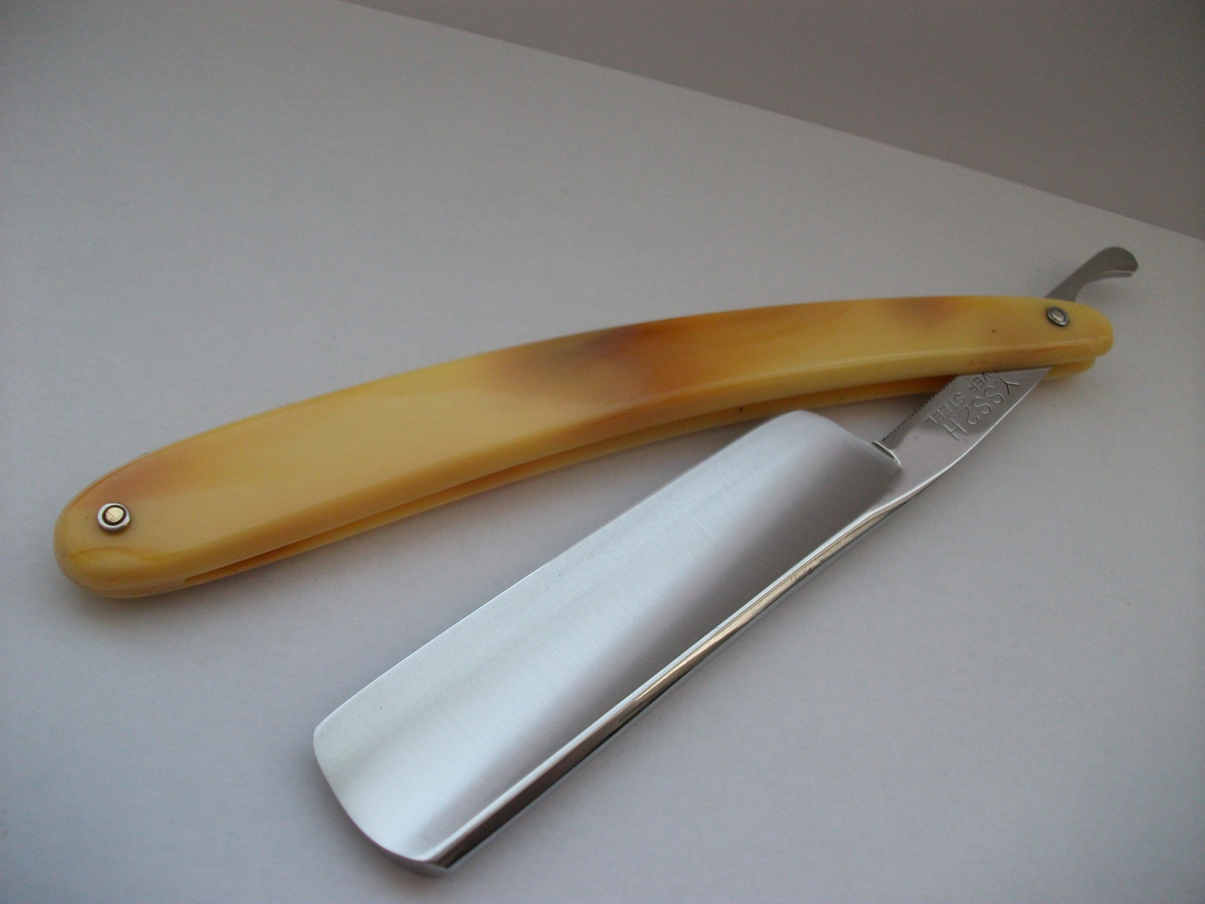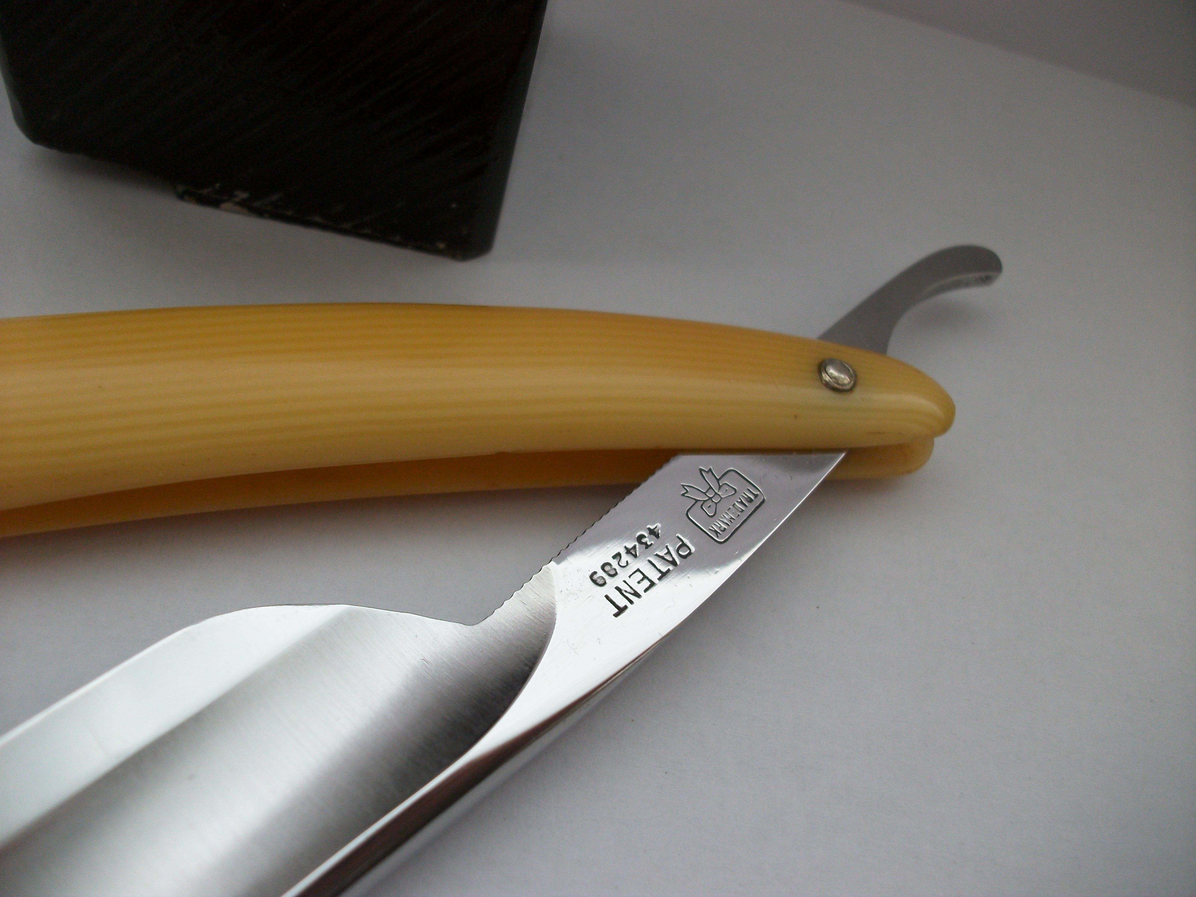 Клеймо в виде одного меча без короны встречается довольно редко. Клинок из углеродистой стали, ширина полотна 21мм, длина режущей кромки 74мм, ручка целлулоид . Думаю бритва изготовлена до 1950 года. Бритва заточена и готова к бритью.