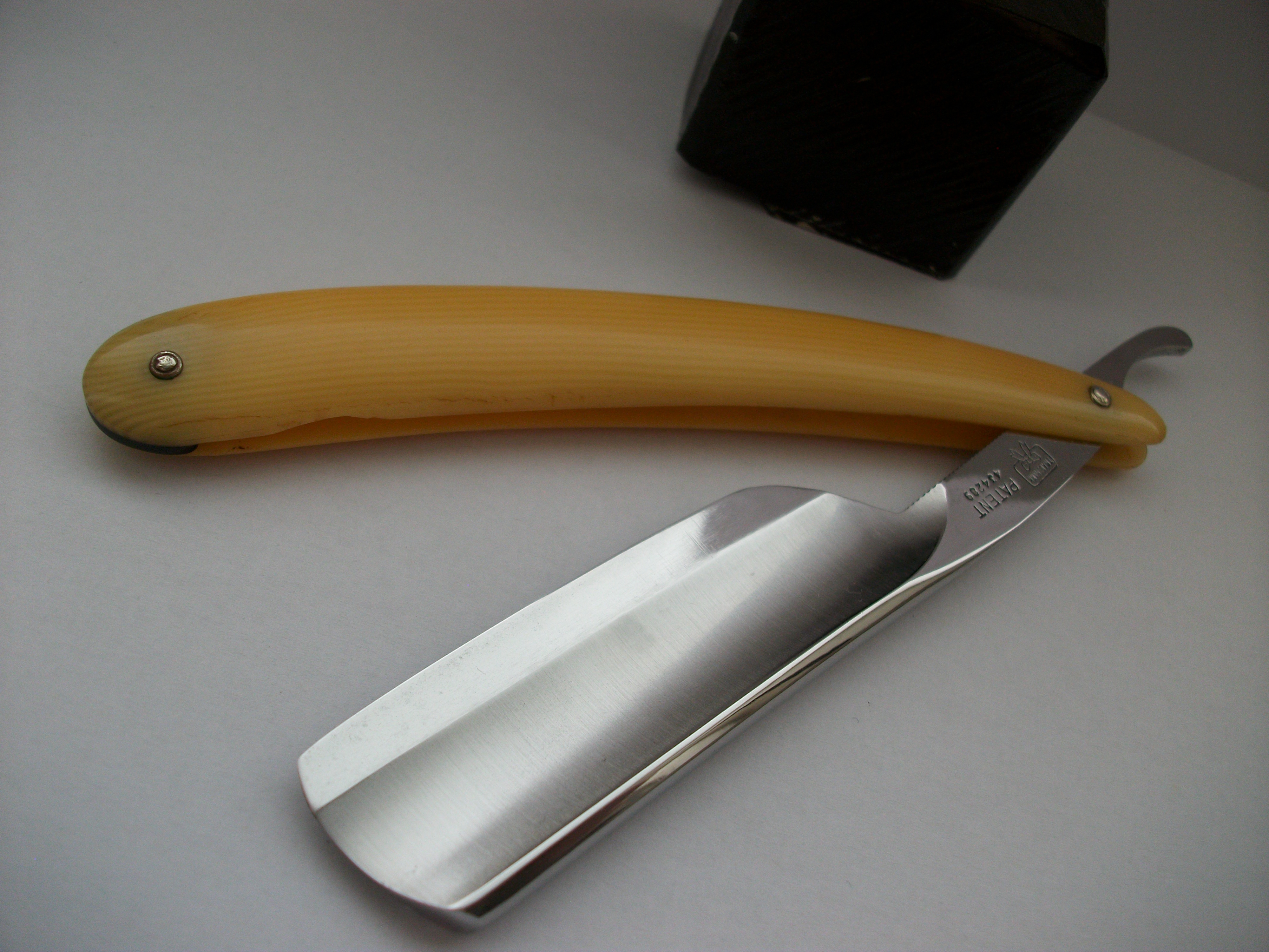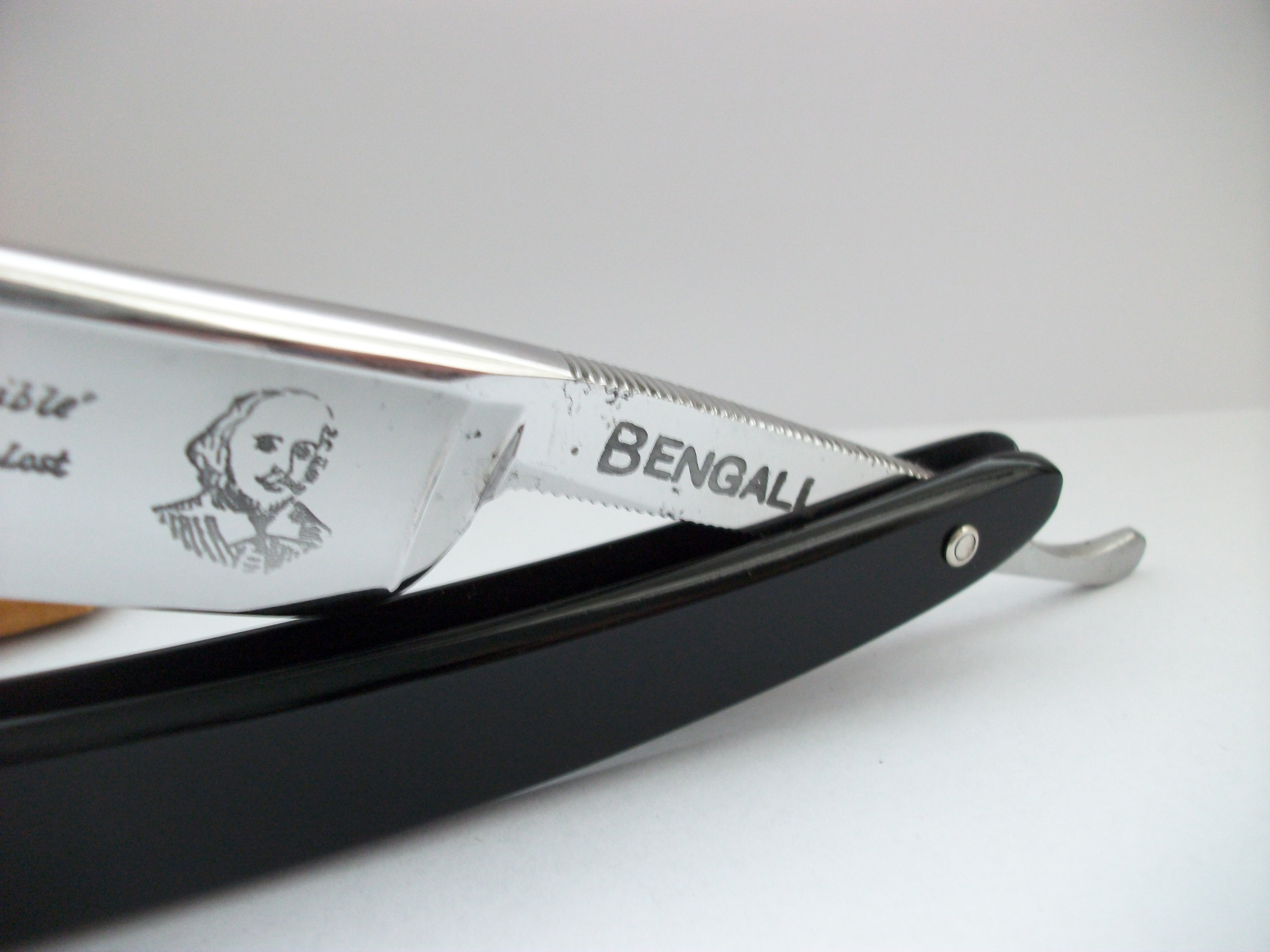 Пора замахнутся на Вильяма нашего Шекспира в лице Bengall от Cadman и сыновей Шеффилд. Углеродистая сталь, ширина полотна 21мм, длина режущей кромки примерно 72мм, вогнутость полная, ручка - пластик. Бритва не была в пользовании, но годы взяли свое, бритву пришлось почистить от точечной ржи (не разбиралась). Небольшие царапки присутствуют. Отличная сталь.