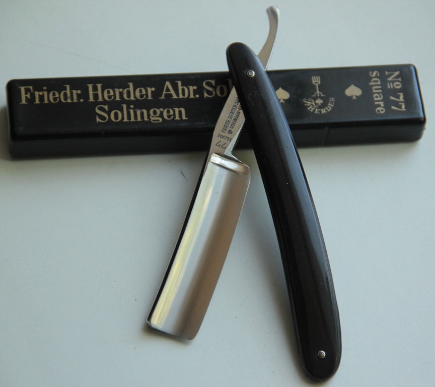 Ну а я продолжу с бритвами... Непользованная немка от известной фирмы FRIEDR.HERDER ABR.SON,SOLINGEN, 77 модель. Ширина полотна-21 мм. Толщина обушка-5.8 мм Полная вогнутость Углеродистая сталь. Середина 20-го века. Почитать о бренде можно тут https://straightrazorpalace.com/razors/ ... ition.html" onclick="window.open(this.href);return false; Также есть тема и здесь. Бритва находится в первозданном виде, как вчера с завода. Только масло стер с полотна.Естественно, ничего не разбиралось и не ремонтировалось. Идеальная геометрия. Заводская заточка. Сталь и кромка находятся в идеальном состоянии.Родная пластиковая коробочка в комплекте! Бритва будет заточена перед отправкой и доведена до комфортного бритья. Настоящее коллекционное качество. Не пропустите и сделайте себе летний подарок.. Цена-14500 р с доставкойПРОДАН Внимание! Важная информация! Spoiler Show