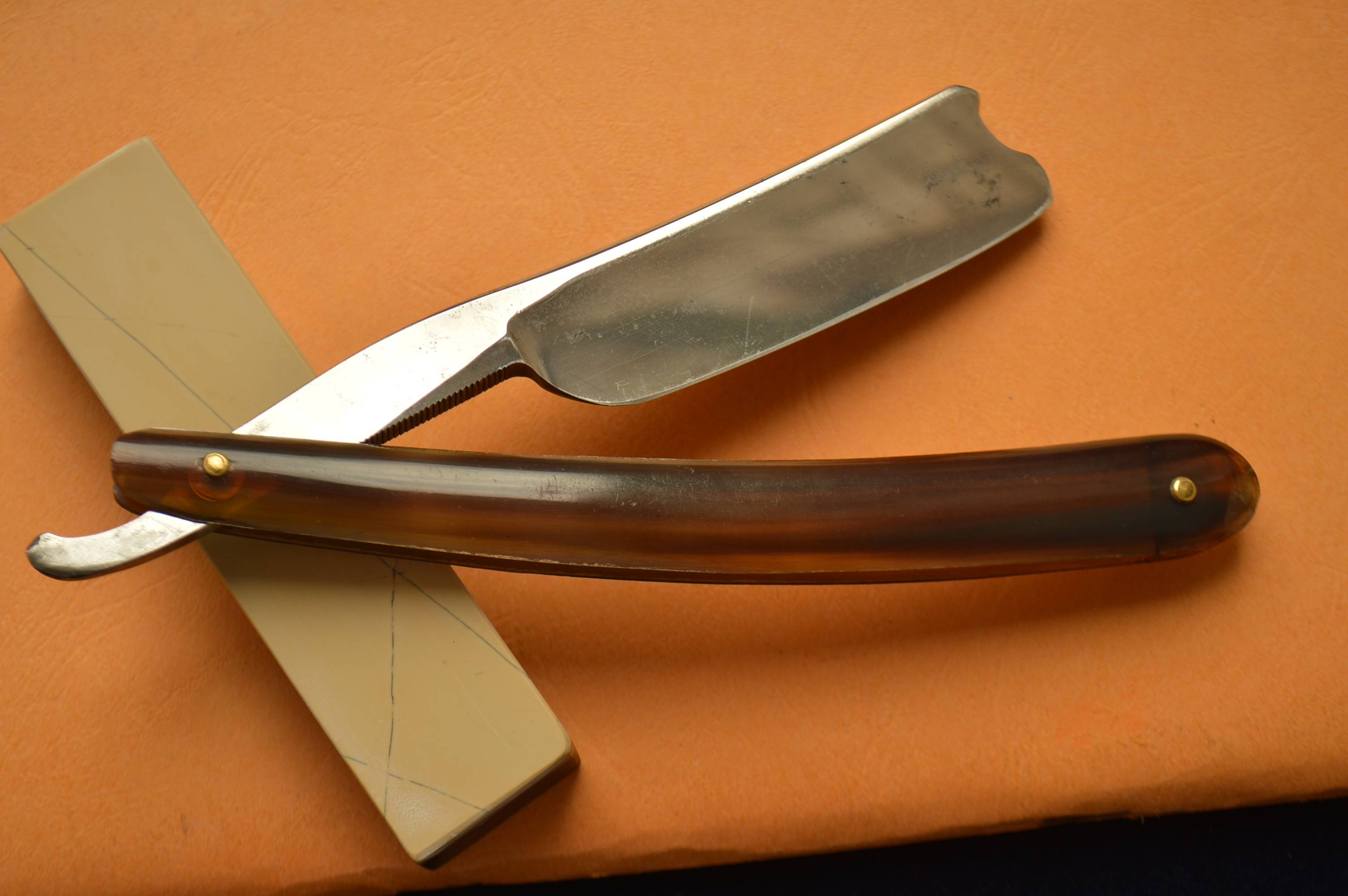 Spoiler Show Один из тех производителей, который имеет очень большую армию поклонников по всему миру, бритвы пользуются спросом среди почитателей бритья клинковой бритвой по всему миру. При этом в продаже появляются крайне редко. Бритва клин в хорошем состоянии ширина полотна – 6/8, длина по кромке 8 см, массивный образец старой Англии, очень редкая и в то же время удобная форма полотна имеет правильную легкую улыбку, которая образуется посредством сужения полотна к носику, что лучшим образом влияет на комфорт при бритье. Редчайший испанский носик, обратные спуски по обуху к его вершине, ручка рог изумительной формы и исполнения украшена инкрустацией. Бритва заточена для бритья, а не для полки. Бритва, как и все иные бритвы этого производителя, бреет прекрасно, сделанная из лучшей английской литой уклеродки готова мягко выбрить любую щетину. Очень редкий экземпляр, который станет прекрасным украшением любой коллекции, будет отличным вариантом в повседневной работе. Бритва полностью разбиралась и чистилась с последующей сборкой, ручка рог имела потери, сейчас все восстановлено и будет служить долго и надежно, Сама бритва несет в себе всю всою историю, все отметки времени на ней оставлены сознательно, все это и добавляет шарма и дает понимание того, что в руках действительно незаурядная 200-летняя вещь. Spoiler Show