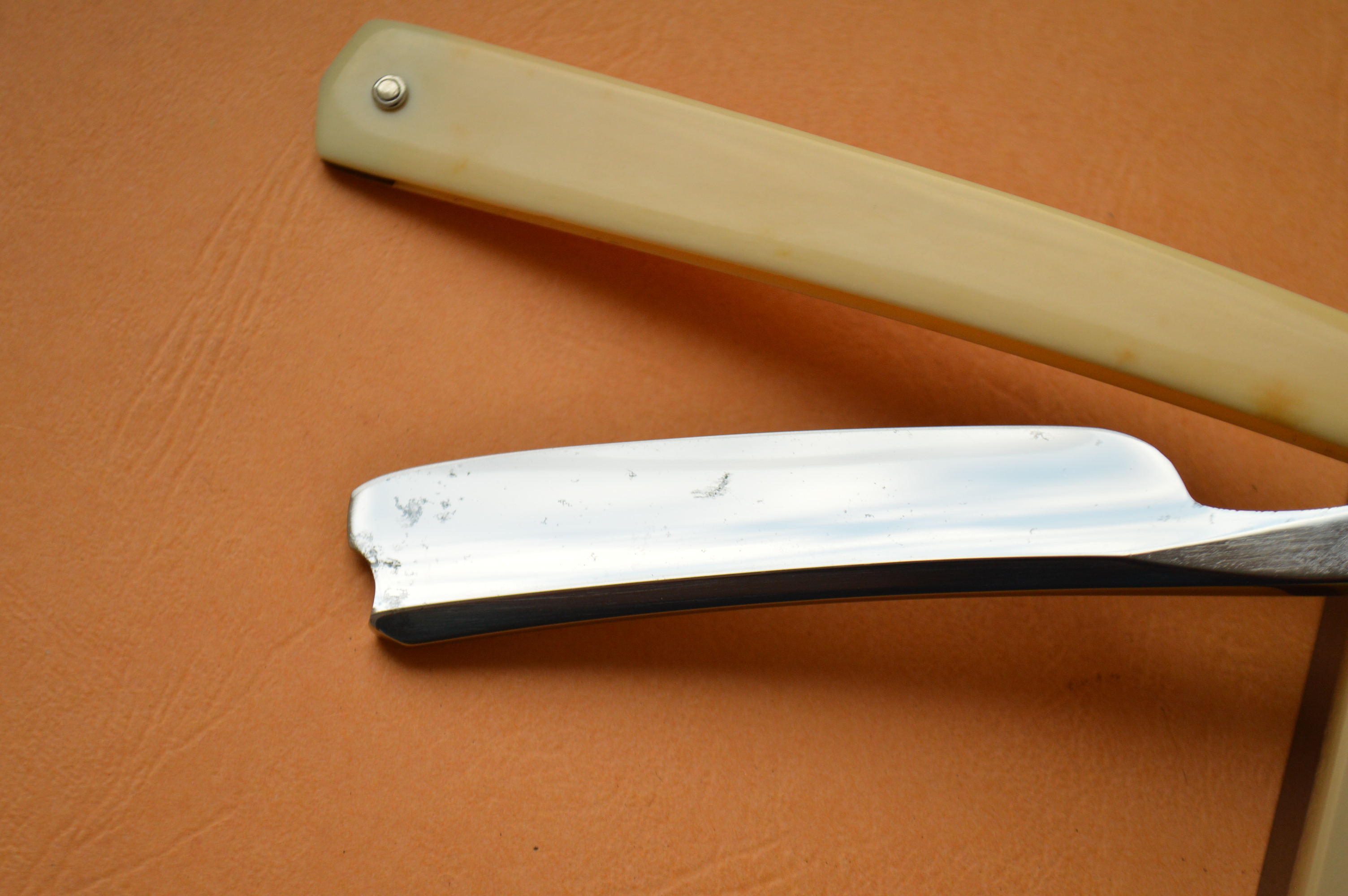 Spoiler Show Бритва в отличном состоянии ширина полотна – 7/8, имеет барберский вырез на носике, оправа синтетика в замечательном состоянии. На полотне гравировка гласящая о том, что эта "прославленная бритва" (имеется ввиду как бренд) на полной выборке, хотя по факту выборка англичан того времени весьма условная, в даном случае выборка приблизительно на четверть. Повсеместно встречаются потемнения, среди прочего в районе осевого пина. Отдельного внимания заслуживает форма полотна, которое имеет сильно выраженную улыбку, что лучшим образом скажется на бритье, также привлекает свой взор отсутствие ребра жесткости, потому что оно там не нужно в условиях соразмерности ширины полотна к выборки бритвы (будет важным для тех, кто устал смотреть ютуб и наблюдать там в продажах Батчеры-франкенштейны, когда делают из убитых клинов Холлоу Граунды и подают это под соусом оригинального состояния Замечательный экземпляр, который станет прекрасным украшением любой коллекции, будет отличным вариантом в повседневной работе. Spoiler Show