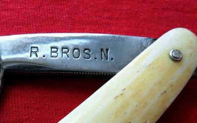 Ручка - натуральный рог в неплохом состоянии, клинышек из металла. По-видимому, ручка родная, пины тоже. Исходя из этого, предполагаю, что бритва относится к концу XIX-началу XX века.