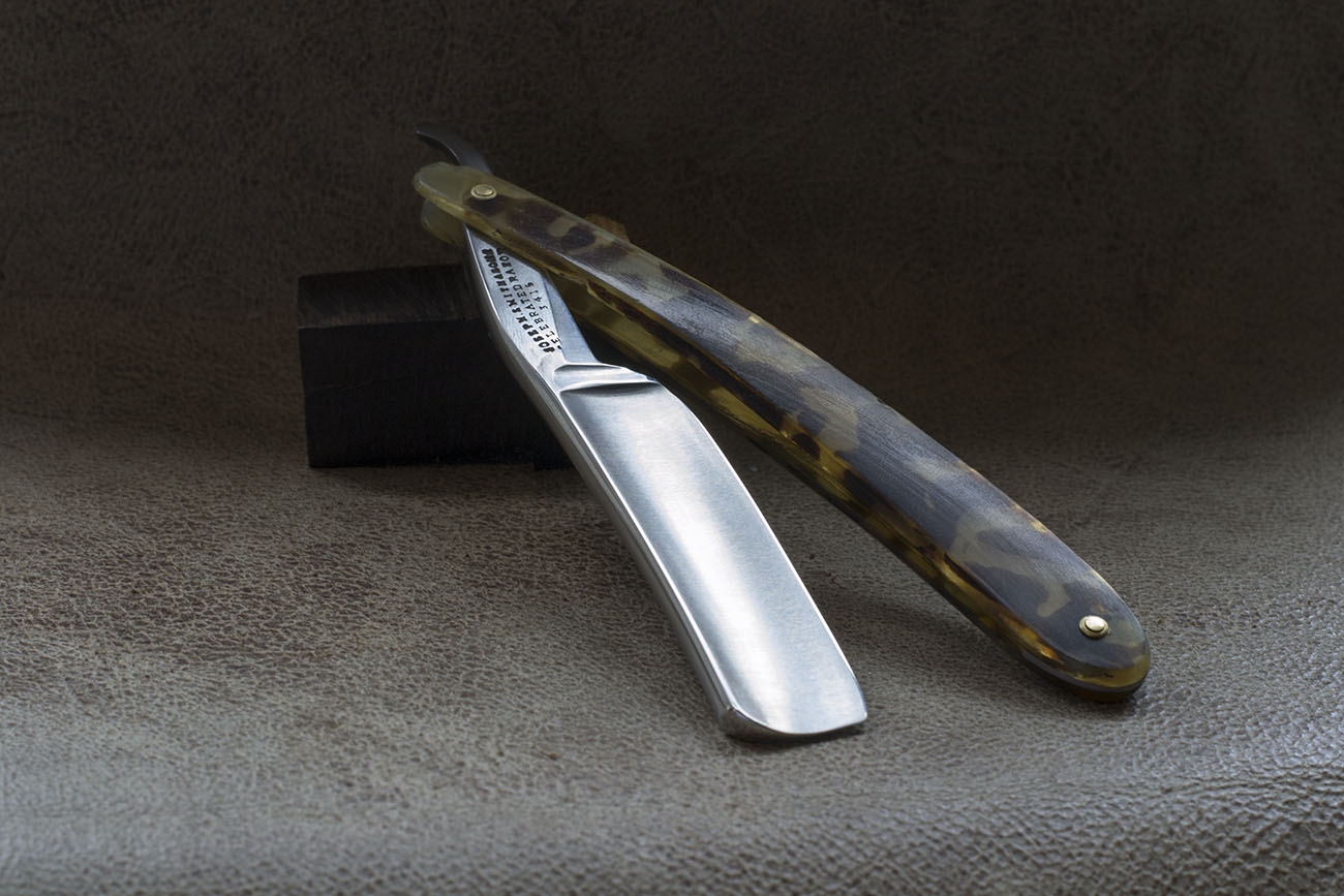 Немецкая опасная бритва, изготовленная для рынка США. The Commander довольно редкая марка, по крайней мере, я встречаю ее впервые. Ширина полотна 16 мм (5/8), спинка - 4.3 мм., рукоять изготовлена из эбонита. Кроме того стоит обратить внимание на закругленный эрль бочонком, что является не частым решением, обычно во избежание закусывания при закрывании на эрле снимаются фаски. Бритва изготовлена из качественной углеродистой стали, имеет хорошую геометрию – фаска режущей кромки тонкая и равномерная. Отличное решение для новичка. Продано The Commander Show