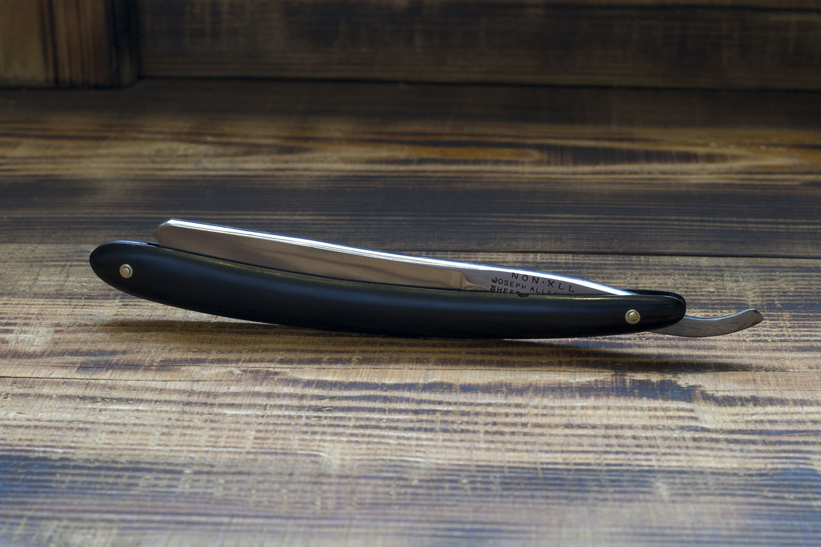Бритва из Англии конца 19 века. Эбонитовая рукоять, вогнутость близкая к клину, парикмахерский вырез на полотне, ширина 5/8 (17 мм.) Джозеф Аллен основал свою компанию в середине 19 века, производил широкий ассортимент режущего инструмента, столовых приборов и опасных бритв. Данный экземпляр изготовлен из качественной шеффилдской углеродистой стали, имеет хорошую геометрию полотна и по ряду причин может быть порекомендован новичку в качестве первой бритвы, кроме того отлично подойдет для окантовки и регулярного бритья не слишком запущенной щетины. Бритва заточена и готова к бритью. Продано XLL Show