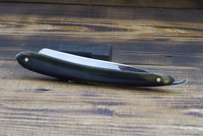 Французский клин от Vincent et Veuve Pény торговой марки IC Vincent Garanti. Прекрасный французский клин сильно улыбчивой формы, ширина 22.5 мм. родная роговая рукоять, шайбы конусом. Долго думал стоит ли выставлять бритву на продажу так как полотно имеет существенный дефект в виде трещины, выходящей на режущую кромку в 13 мм. от пяточки. Решился взять бритву на тест и после испытаний хочу сказать что вовсе не почуствовал какого то дискомфорта, волос не цепляла, после использования не образовались сколы по краям трещины и тд., т е все мои опасения оказались излишними, бритва вполне годна для использования. Кроме того, трещина расположена довольно близко от пятки, на участке который в бритье используется исключительно редко. Примечательно что трещину обнаружил только на позднем этапе работ, не было сколов и прочих признаков ее наличия, вероятно образовалась из за возможных нарушений в процессе ковки, думаю что просто лишний раз стукнули по остывающей заготовке. Бритва имеет прекрасную геометрию, сталь французская литая углеродка высочайшего качества. Отличный вариант для тех кто желает попробовать нечто подобное, бритва выставлена с огромной скидкой из за небольшой трещины возле пятки. Заточена и готова к бритью. Продано IC Show