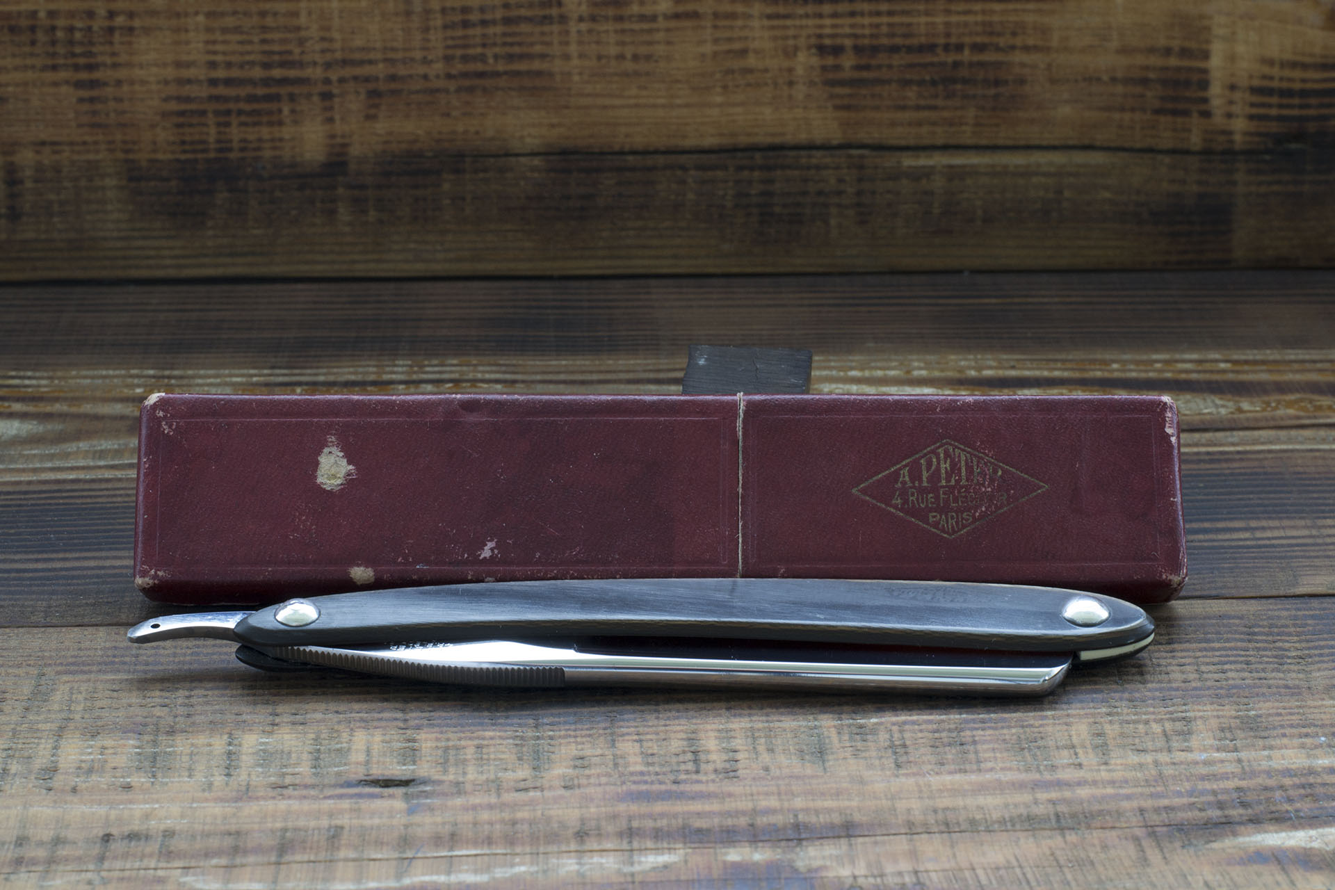 Опасная бритва от известной династии французских ювелиров, ведущей свою историю с первой мастерской Жана Фредирика Петера в Дорлисхайме на юге Франции 1785 года. Позднее в 1887 - м, потомок Жана Фредерика - Густав Эмиль (Gustave Emile) переезжает в Парих, основывая там мастерскую и небольшой магазин на улице Флеше, который быстро становится популярным среди обеспеченных слоев общества. Французы очень гордятся своими ювелирами семьи Петер, это относится и к Эмилю Густаву и в неменьшей степени к его потомку Фредерику Альберту, изделия этого семейства по праву считаются произведениями искусства в области режущего инструмента, это и уникальные столовые приборы , различные ножи, дорогие маникюрные наборы и конечно же опасные бритвы, утонченные в своей отделке дорогими материалами. К счастью не все эти вещи сейчас являются музейным достоянием и время от времени удается найти что то приличное из средней и недорогой линейки Peter. Данная бритва изготовлена во времена Эмиля Густава Петера, к сожалению я не могу точно сказать когда Эмиль Густав передал дела Фредерику Альберту, но думаю что бритва все относится к периоду конца 19 века. Рукоять изготовлена из рога буйвола, клинышек - кость, с этой точки зрения все по классике. Но отдельно стоит упомянуть огромные шайбы, которые скорее всего являются трехслойными, верхний слой вероятно из серебра. Сдерживая себя, я все же решил не разбирать бритву, очень хотелось разглядеть строение шайб, но я оставил все в оригинальном виде. Так же от производителя установлены внутренние шайбы и отдельно стоит упомянуть качество исполнения рукояти - , плашки очень ровные, симметричные и рог совсем не повело от времени, действительно ювелирная работа. Полотно бритвы имеет полную вогнутость, что для того времени было нечастым явлением. Качество слесарных работ на высоте, геометрия идеальна и я никогда не видел столь качественно выполненых французских бритв с вогнутостью. На момент поступения имела незначительные следы заточки и несколько темных пятен на полотне и зрле, вероятно точилась еще в начале 19 века. Эрль под осевым пином был чистым, поэтому бритву не разбирал, лишь произвел полировку и заточку. Бритва предположительно не использовалась. Ширина 21.2 мм, удобнейшая двустороняя насечка с подпальцевой выемкой. Редкий и отлично сохранившийся экземпляр с родной коробкой. Бритва заточена и готова к бритью. Продано Peter Show