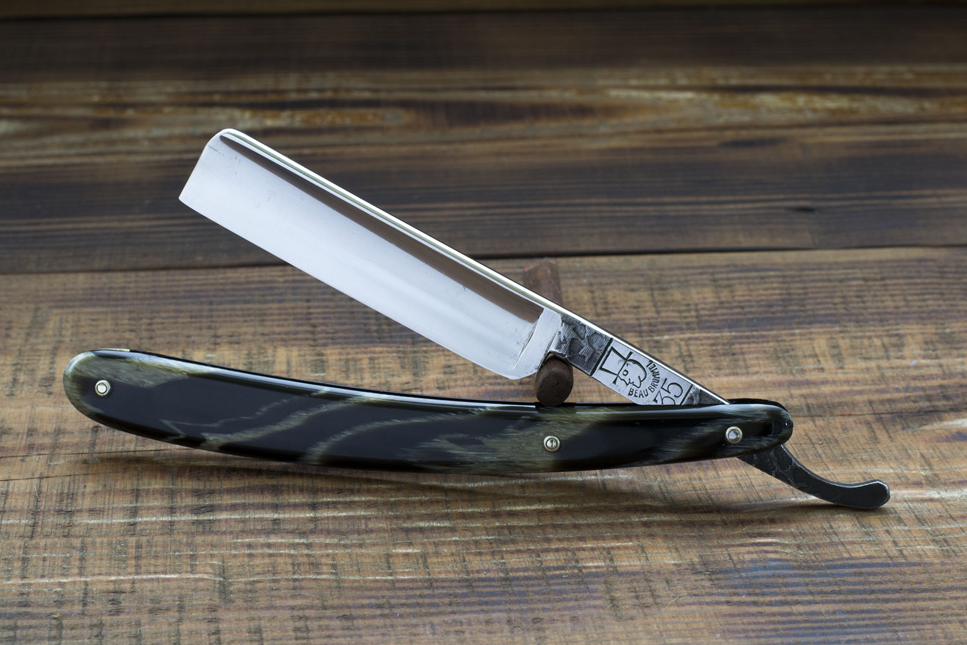 Опасная бритва торговой марки Beau Brummel, выпущенная в Германии для рынка США. Из информации в сети - изначально Beau Brummel не имел постоянного дистрибьютора в США и продавался несколькими компаниями, после этого бритвы бренда стали эксклюзивно продаваться такой компанией как BRESDUCK INC., вместе с другими марками - "DUBL-DUCK", "LIFETIME", "NAPOLEON", "DEUTSCH", "SATINEDGE". Из интересных особенностей - бритва снабжена эрлем с выраженными следами ковки, на мой взгляд это прекрасно смотрится, кроме того позволяет более надежно фиксировать бритву при бритье а так же предохраняет от коррозии. Ширина полотна бритвы 18 мм., вогнутость полная. Бритва в прекрасном состоянии - из произведенных работ только полировка полотна, заточка и ремонт рукояти - проклеена и отполирована трещина в р-не осевого пина. Торговая Марка Beau Brummel вероятно имеет исторического прародителя и получила свое название в честь англичанина George Bryan "Beau" Brummell (7 July 1778 – 30 March 1840). Бритва заточена и готова к бритью. Отличная немецкая бритва высочайшего качества. Продано Spoiler Show