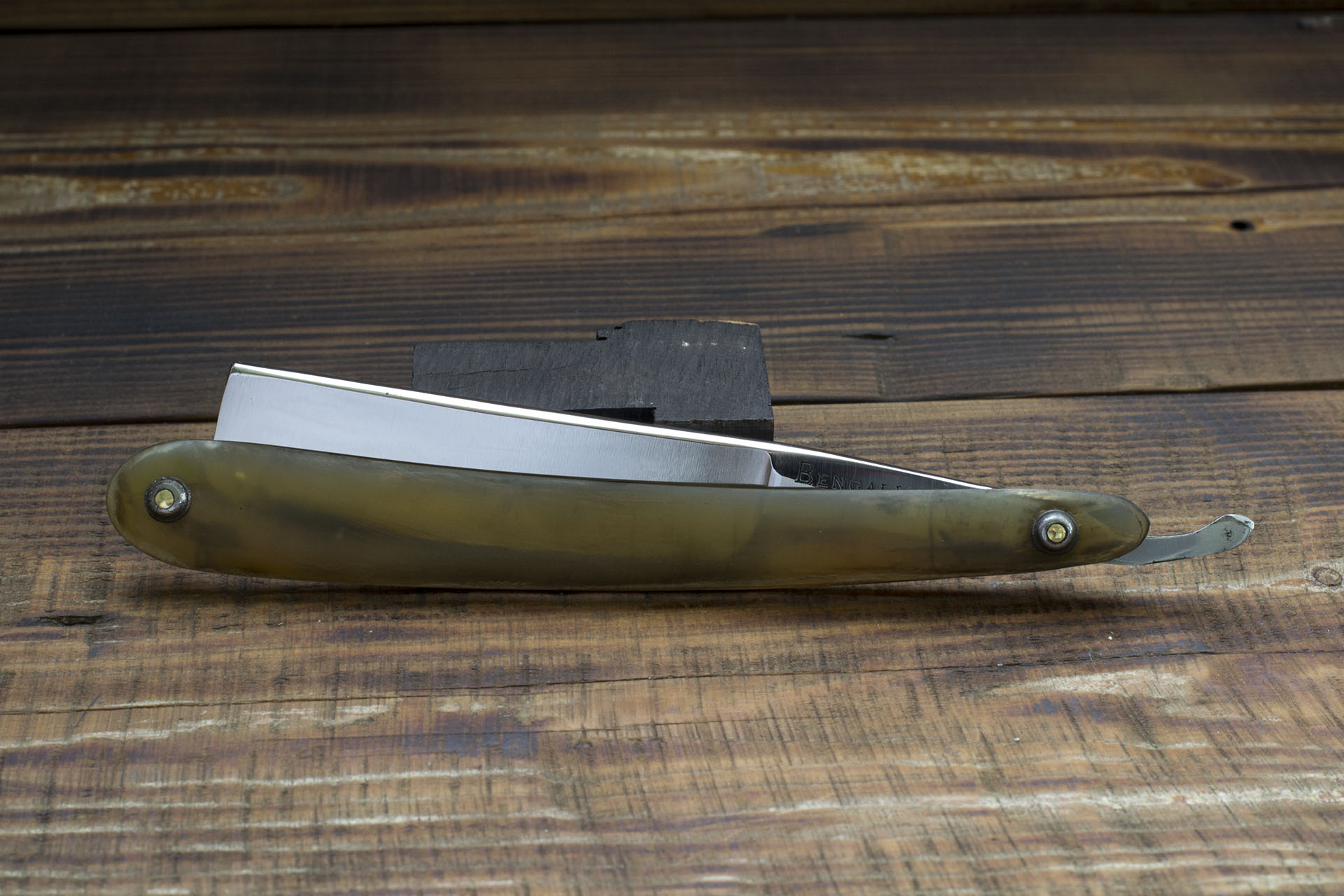 Опасная бритва торговой марки Bengall, берущей свое начало с 1748 года. Марка действительно старая, признанная в Англии и за ее пределами. Это далеко не первый экземпляр от данной компании, более подробную информацию по производителю можно найти как в ранее проданных мной лотах с Bengall, так и на просторах сети. Данный экземпляр судя о форме изготовлен в 30-е годы 19 века, это клин с небольшой вогнутостью, приятной улыбчивой формы, сильно расширяющийся к носику. Ширина полотна 19.4 мм (6/8). Бритва имеет родную роговую рукоять, изготовлена из качественной литой углеродистой стали, о чем свидетельствет надпись на эрле. Роговая рукоять все еще довольно презентабельна и на удивление эластична, послужит еще многие лета... Бритва подверглась легкой чистке, так как полотно изначально было практически неточено и с минимальными следами времени, я не стал подвергать бритву грубой абразивной обработке, но нужно иметь ввиду, на обратной стороне полотна осталось немого питтинга, который, по сути не представляет опасности для эксплуатационных свойств, от режущей кромки до ближайшей каверны довольно внушительное расстояние, которое нереально сточить при правильной доводке, даже за несколько десятилетий. В целом это прекрасный среднеразмерный английский клин, который можно рекомендовать даже новичку. Бритва имеет очень хорошую геометрию, литая углеродистая сталь высочайшего качества. Заточена и готова к бритью. Продано Spoiler Show