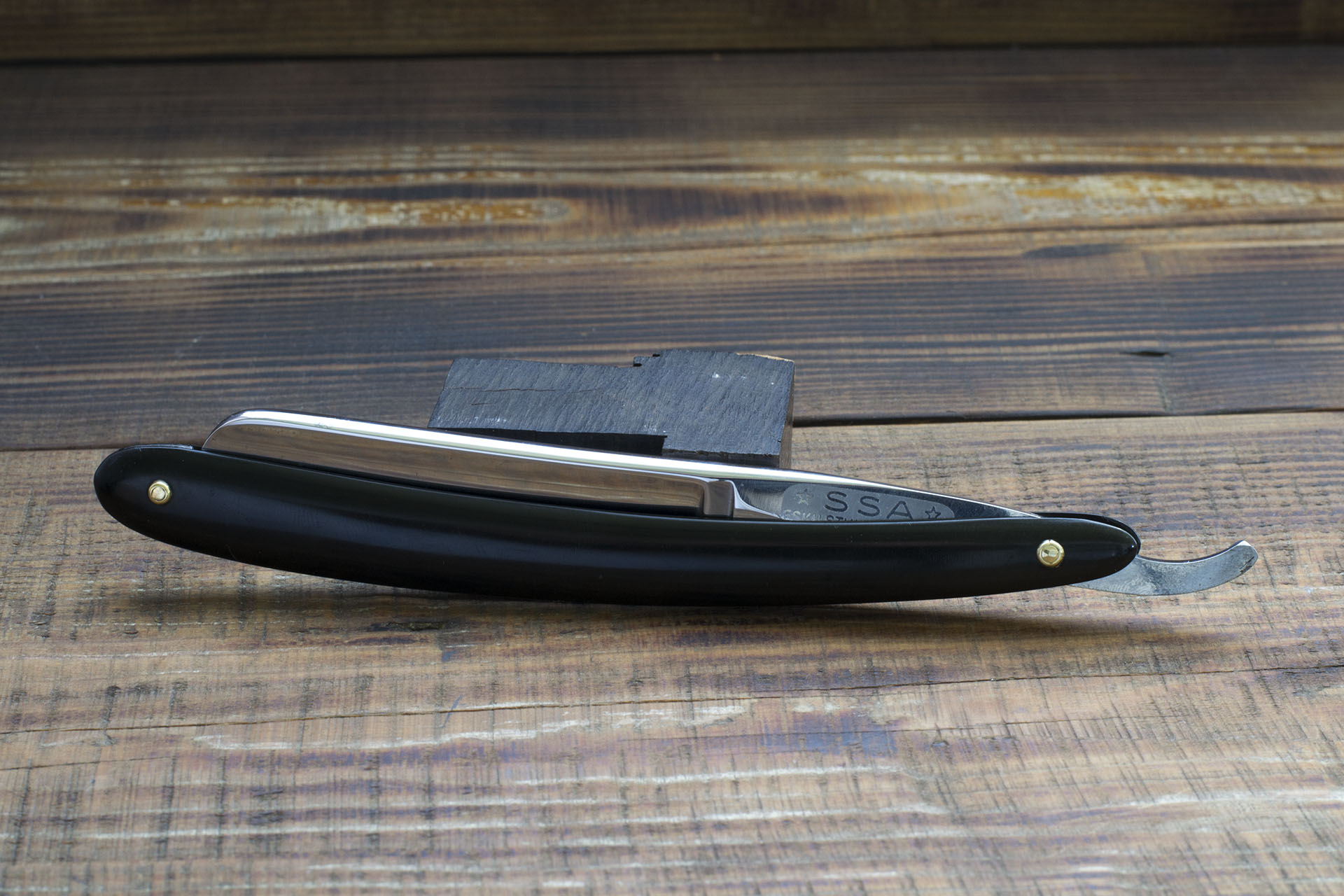 В рамках своего копания по закромам (нужно было освободить сундук под пшеницу) удалось найти вот такого представителя SSA (Svenska Stalsmides Aktich). Производство было налажно на базе бывшей фабрики Johan Enstrom в 1918 году, однако то что выпускалось Энгстремом имеет очень мало общего с бритвами SSA в плане приемственности. Это по прежнему очень хорошая сталь, высокое качество исполнения, но полностью модернизированное производство, выпускающее бритвы более современного дизайна, большинство из которых имело полную или трехчетвертную вогнутость, клейма теперь наносятся неглубоким травлением, кроме того меняются дизайн и материалы изготовления рукоятей. Интересно так же что бритвы SSA очень высоко ценятся на западе, что не скажешь о бритвах Энгстрем, оценивающихся гораздо скромнее. Данная бритва имеет ширину 18.4 мм, вогнутость 3/4, рукоять - эбонит. Почти новая бритва с незначительными следами заточки и окисления. Все что было сделано - полировка полотна, замена рукояти и заточка. Сталь без сомнения очень хороша, геометрия так же на высоком уровне. Бритва заточена и готова к бритью. Продано SSA Show